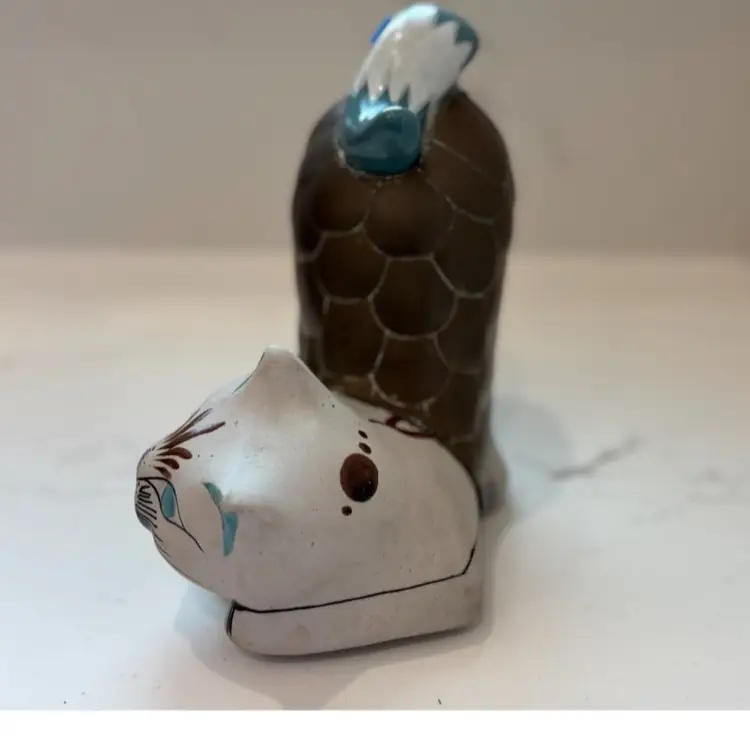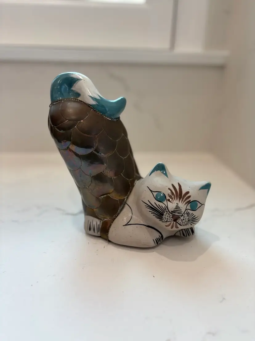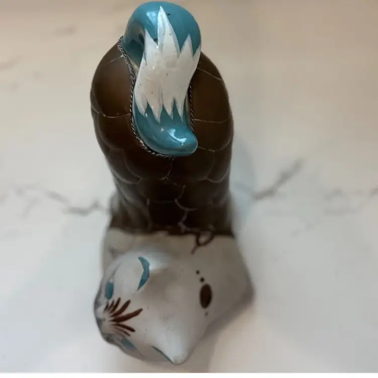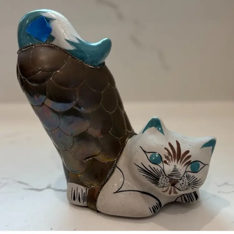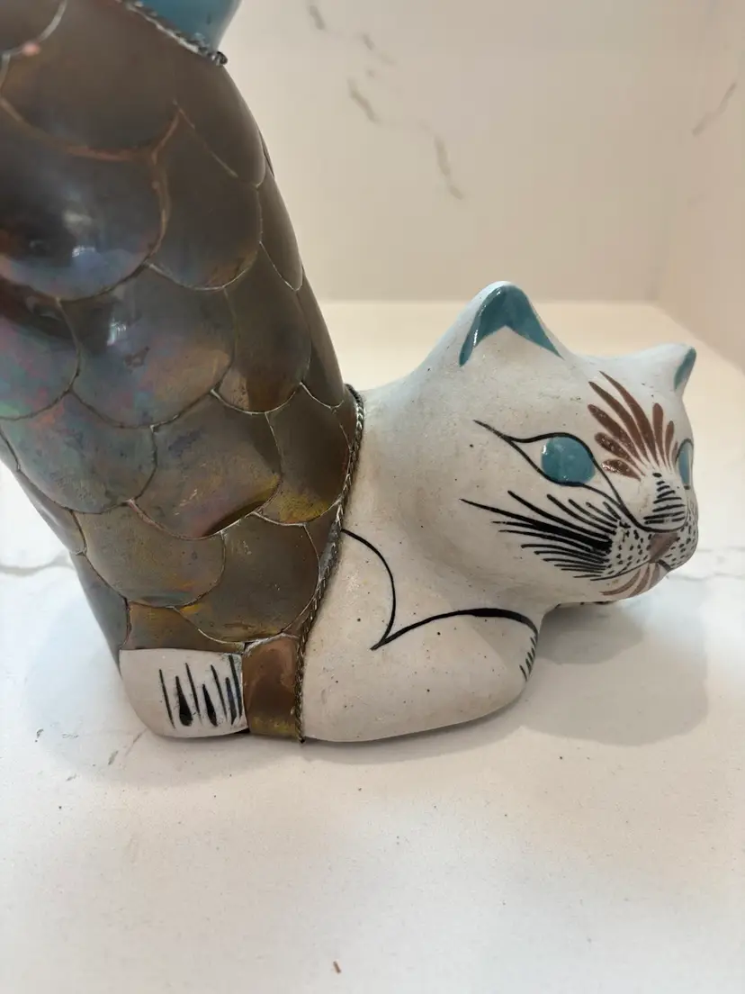 Dark patina to brass contrasts well with the blues and browns of the cat. Signature is on the bottom under the brass. The brass design looks like scales. 8”x 6.5 length