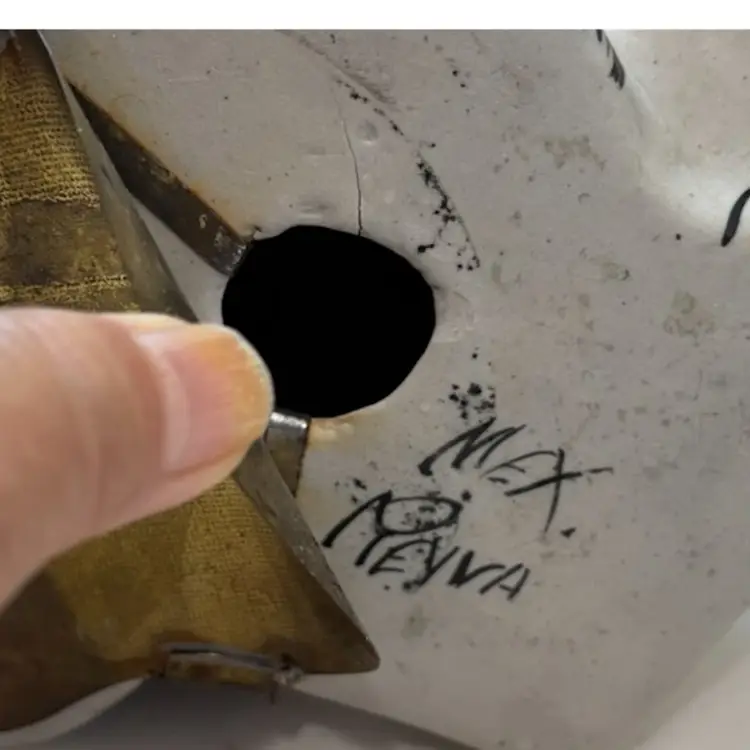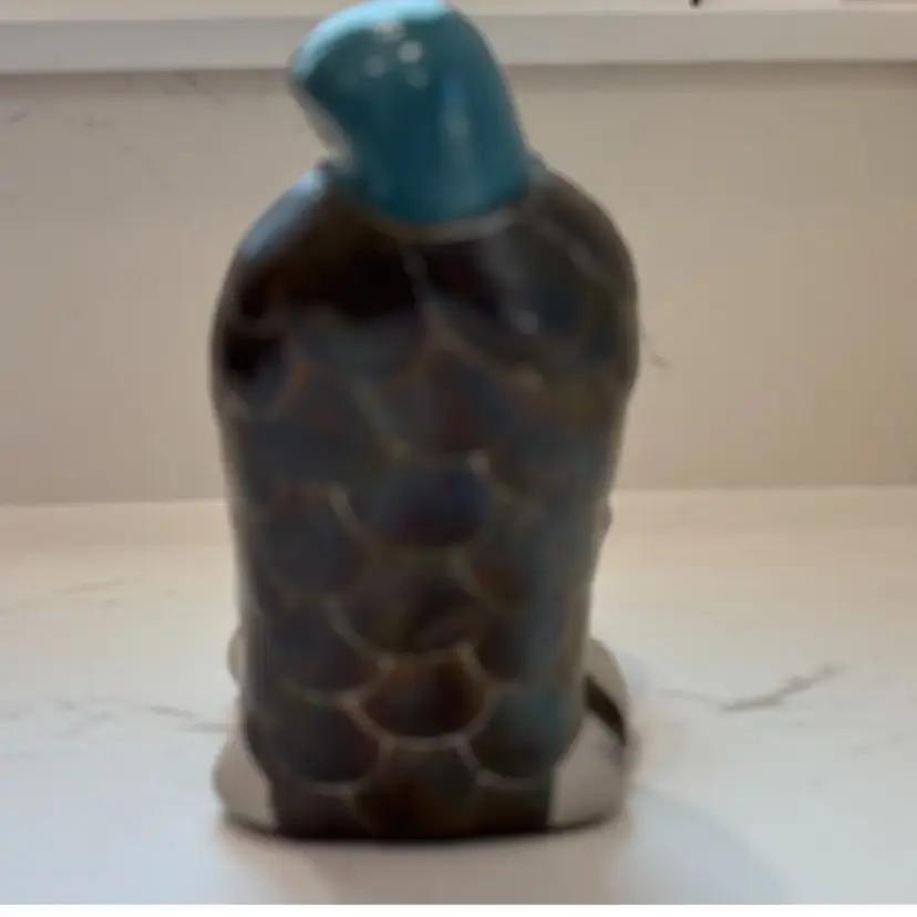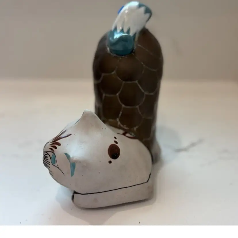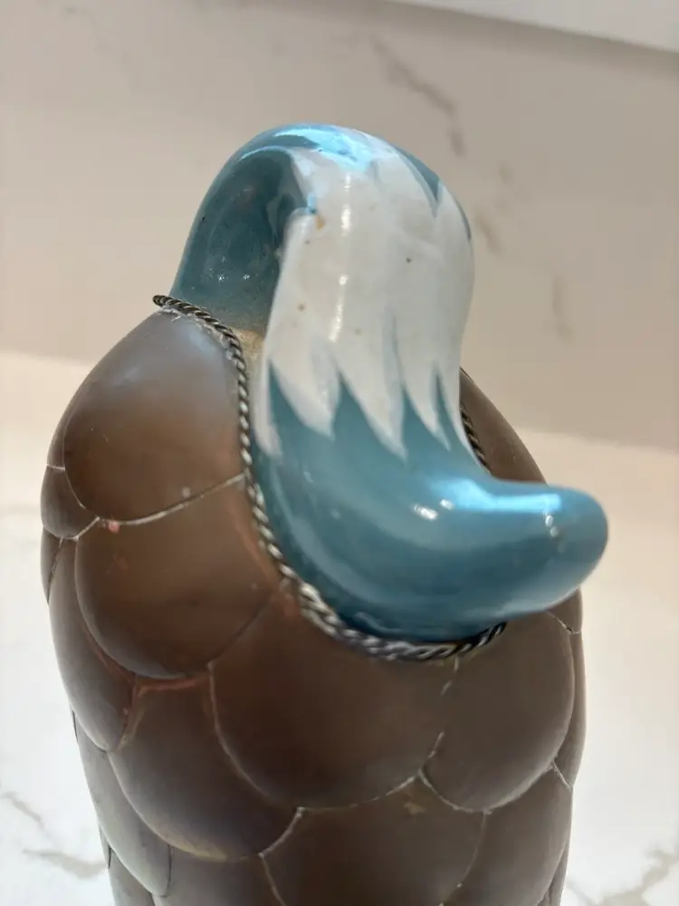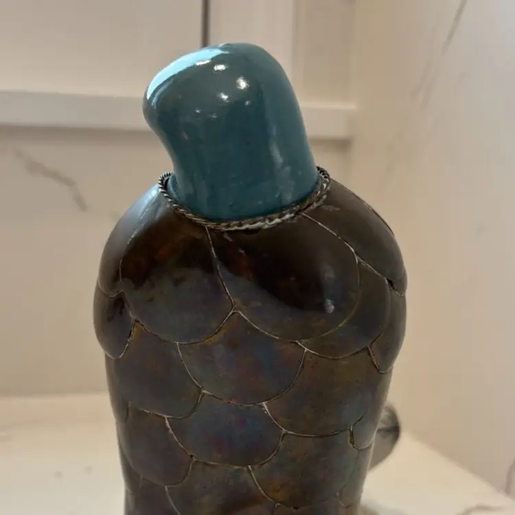 Dark patina to brass contrasts well with the blues and browns of the cat. Signature is on the bottom under the brass. The brass design looks like scales. 8”x 6.5 length