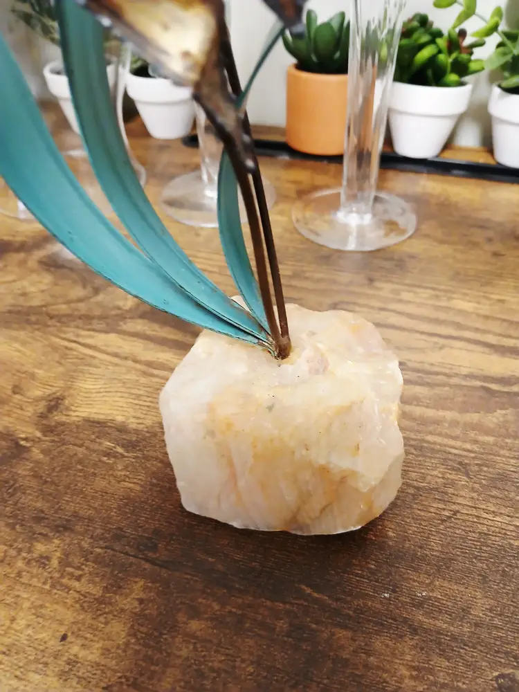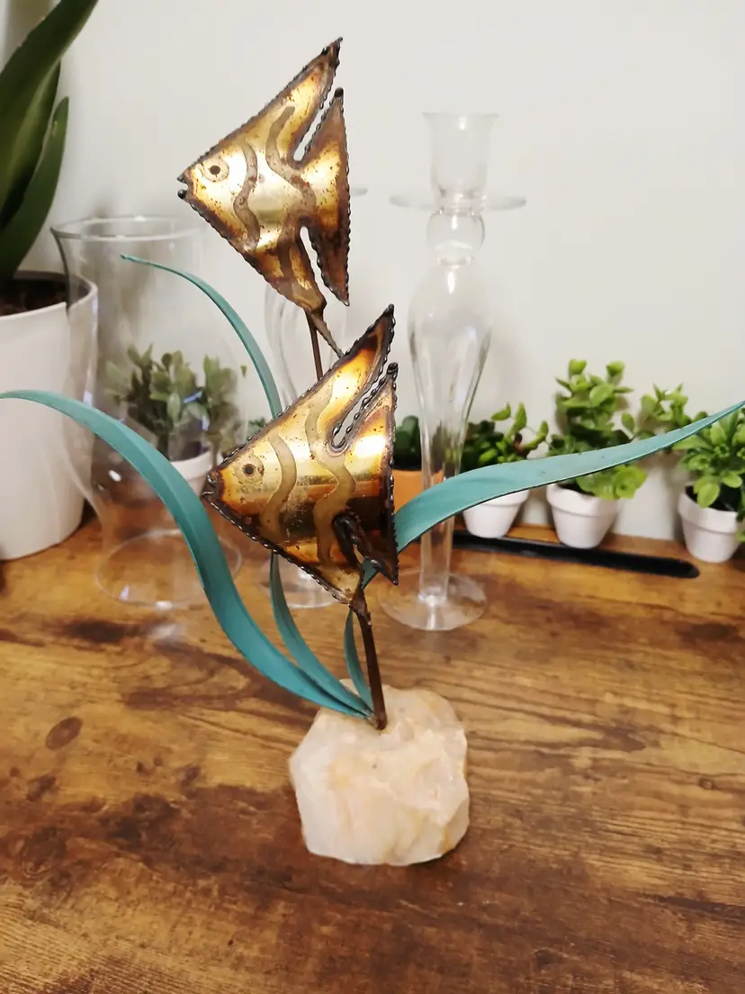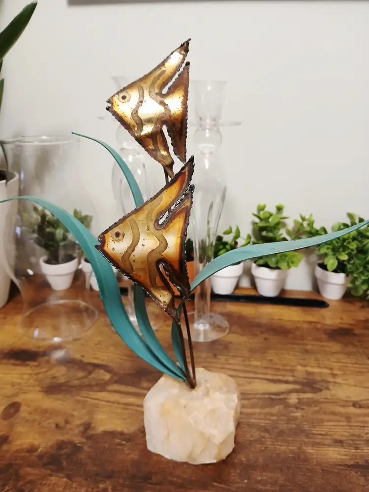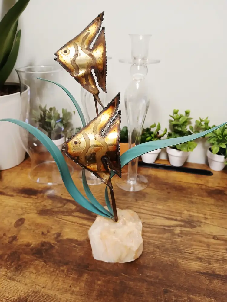 Dive into vintage charm with this brass angelfish sculpture. Featuring two intricately detailed fish swimming among teal seaweed, all mounted on a natural stone base. Perfect for adding a touch of oceanic elegance to your decor. Approximately 12" x 10 1/2"