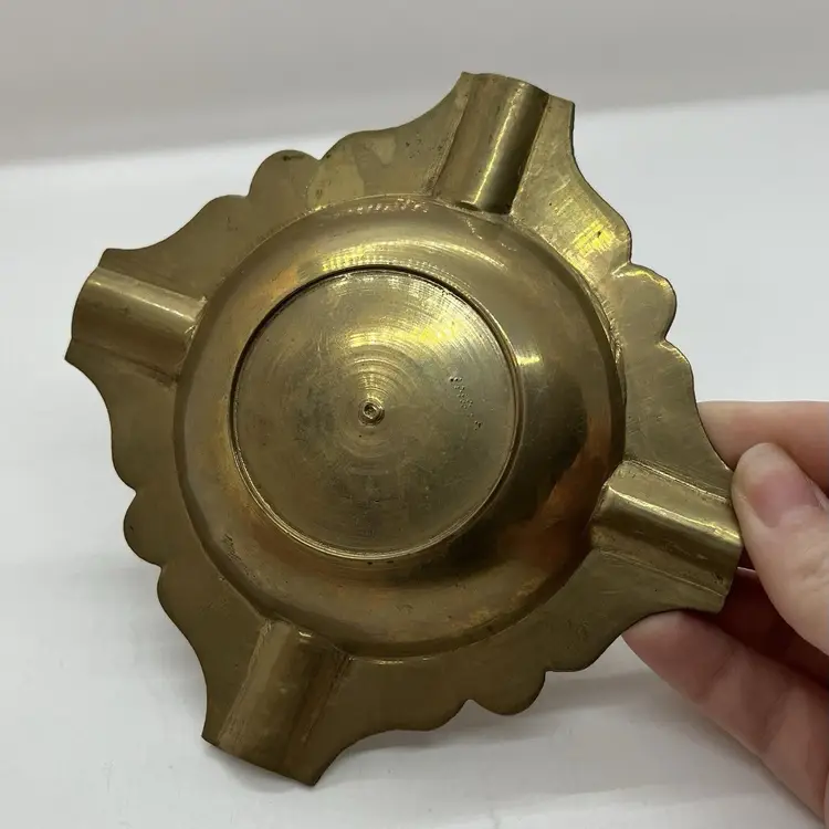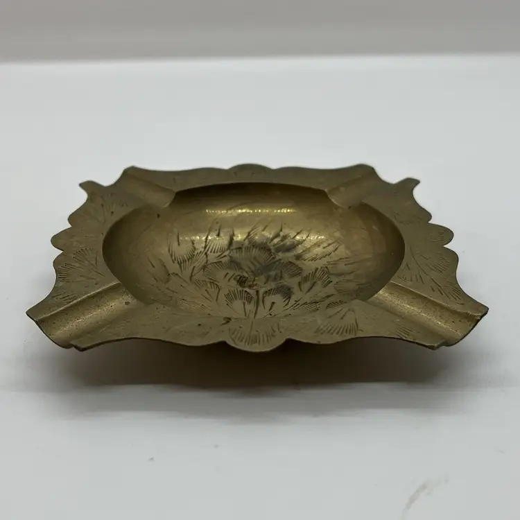 This is a handcrafted brass ashtray made in India. Features a floral design, does have wear from use as pictured. Measures about 4.25" across.