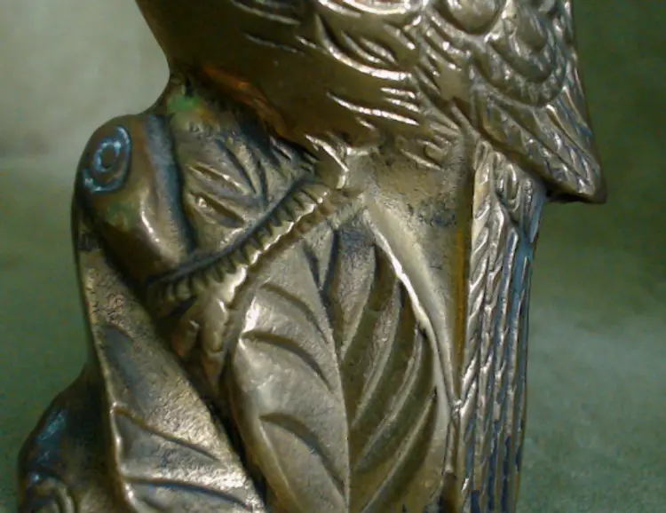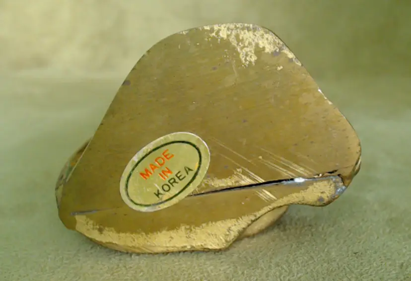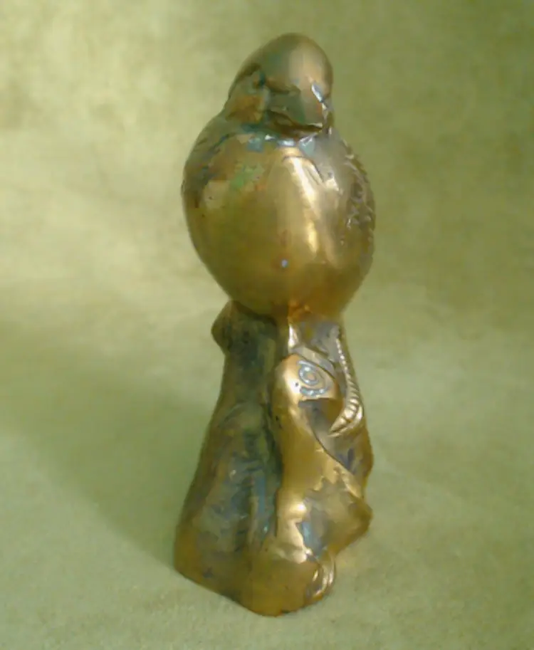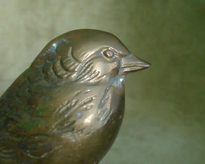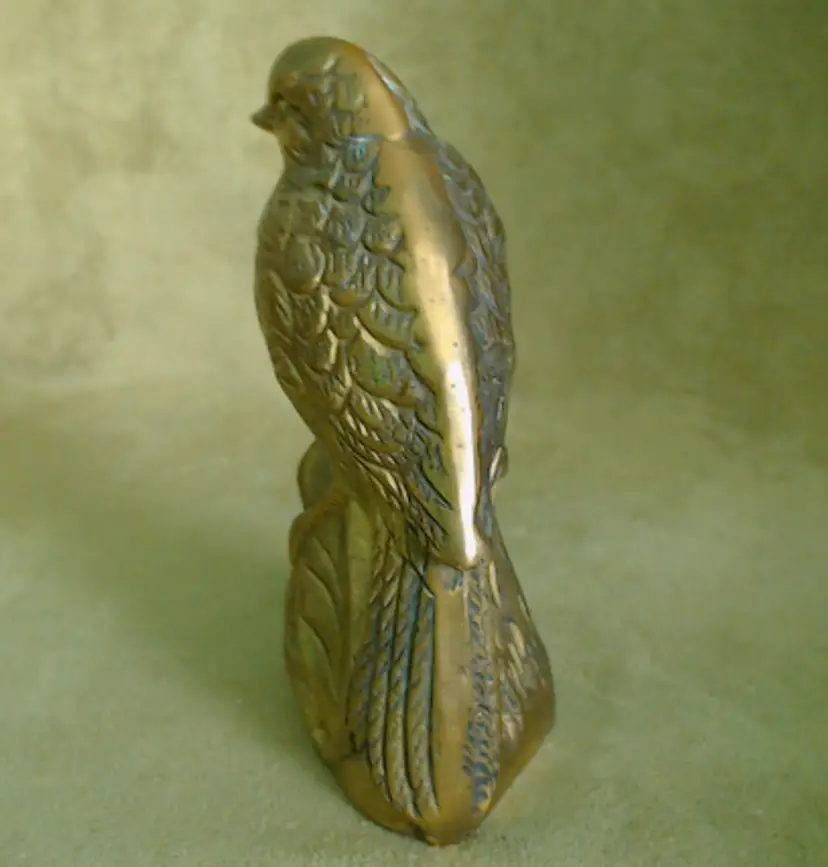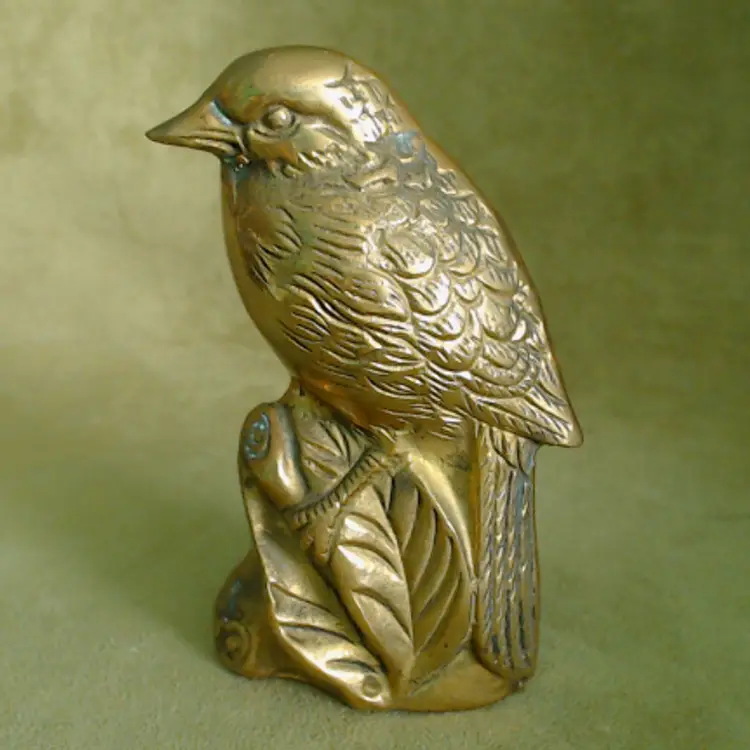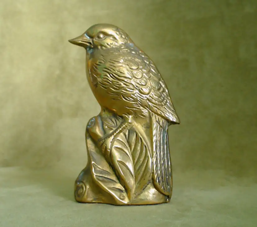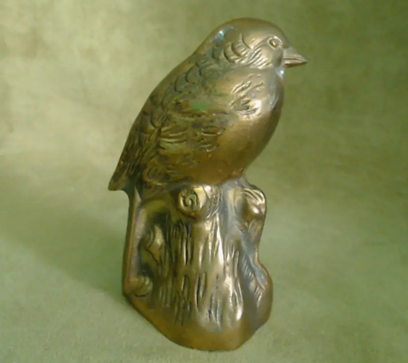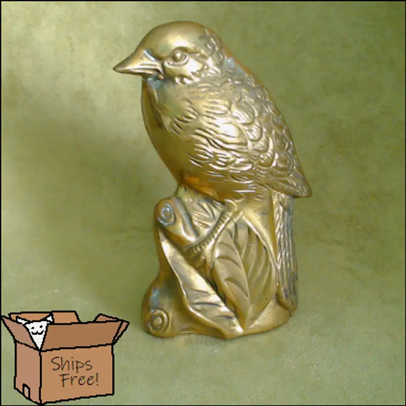 This is a vintage figurine of a bird, made from a heavy brass! Made in South Korea, probably during the 1970s, this lovely little brass bird is posed perching on a leafy branch. Polish him to a high shine, or leave him as is, with that touch of aged patina - He can be a handsome accent to so many decorating styles! Condition: This bird is in Very Good shape! There are no scratches, dents or any serious flaws that I could find. He does have a few small spots of oxidation that can be cleaned up, if desired. I would have liked to attend to them, but other than a quick dust wipe-down I did not polish him, as some people like their brass to shine and others prefer to see the age. I would also like to note that while he is not solid, he is quite heavy, so be prepared, (I may have dropped him on my foot, I don't recommend this)! Size: He measures about 3" is just about 2" wide, and sits 4¾" tall.