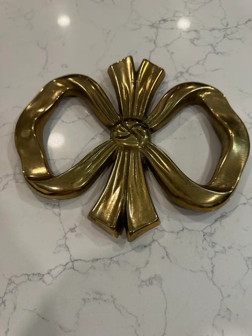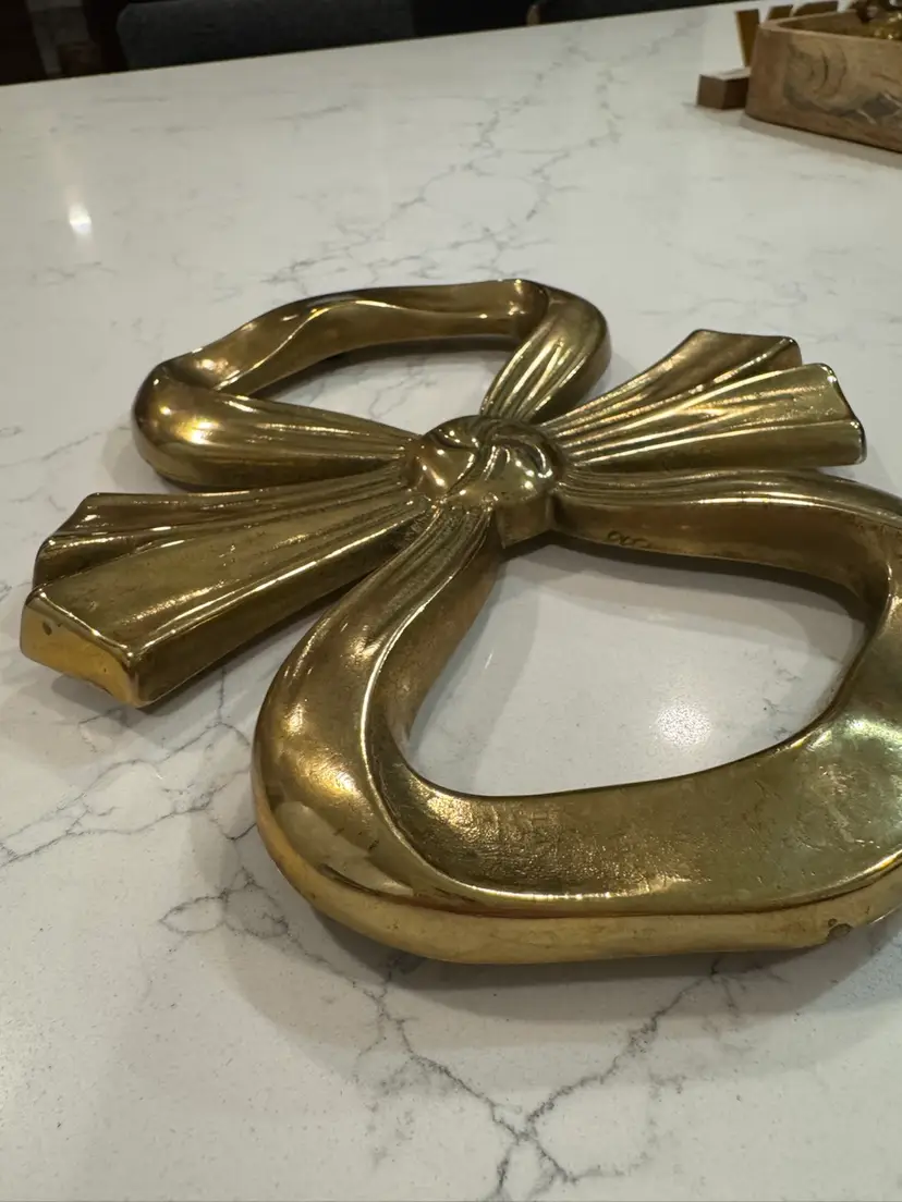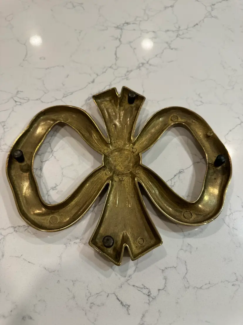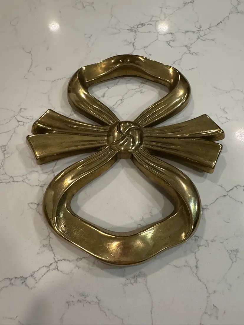 Add a touch of vintage elegance to your home with this beautiful brass trivet. This piece is perfect for protecting your surfaces from hot dishes while adding a classic decorative accent. The intricate bow design makes it a unique and charming addition to any kitchen or dining area. Excellent pre-owned condition with a lovely patina that highlights its age and character.