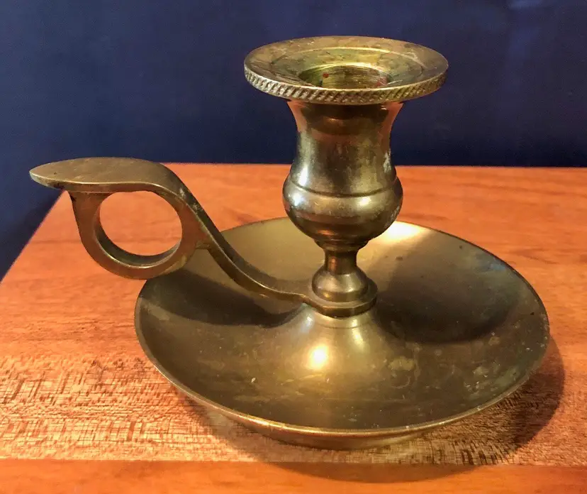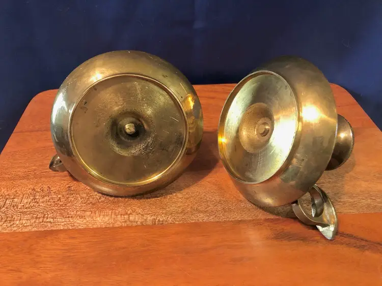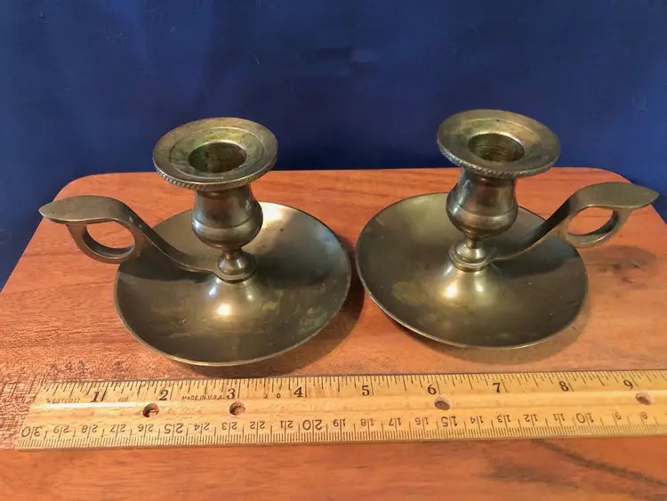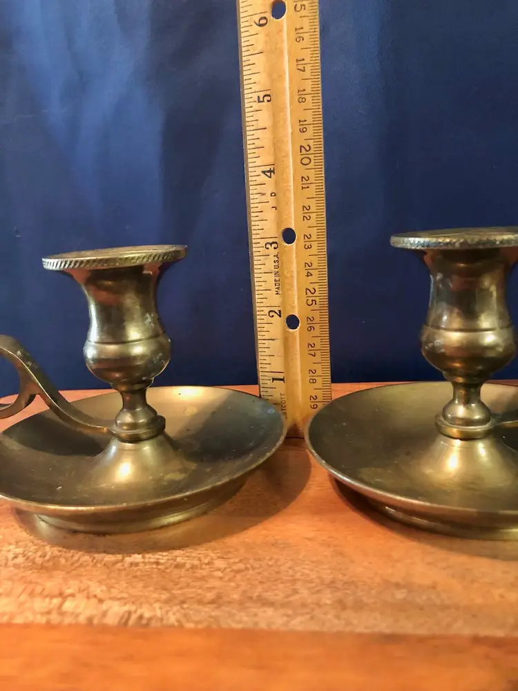 Here we have a Set of 2 Vintage Brass Chamber Candlesticks with Loop Handles. These Candleholders are in good condition with minor age tarnish but no pitting.