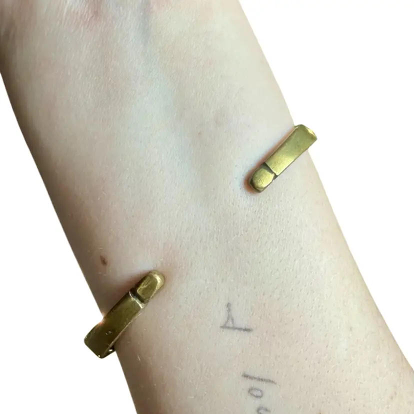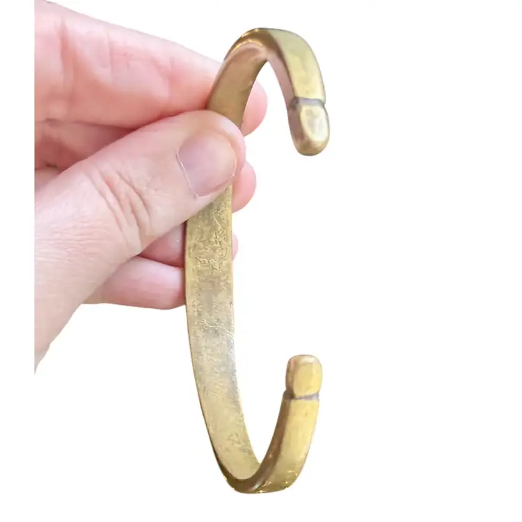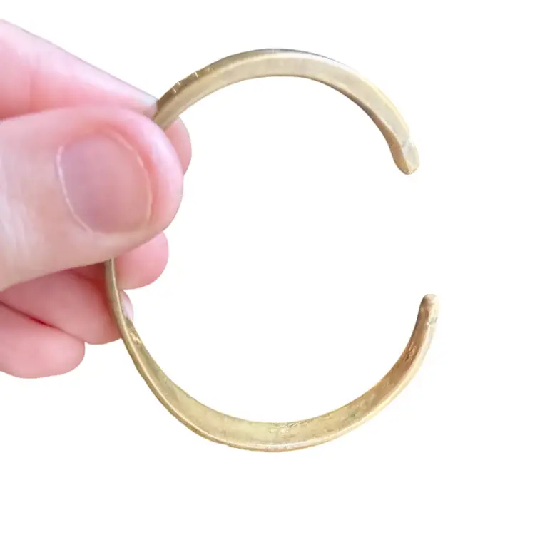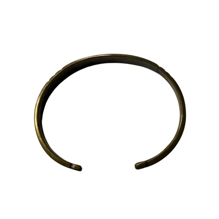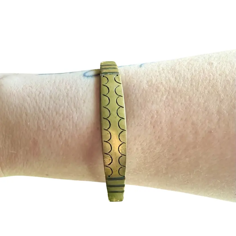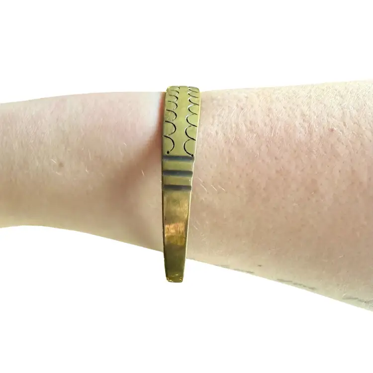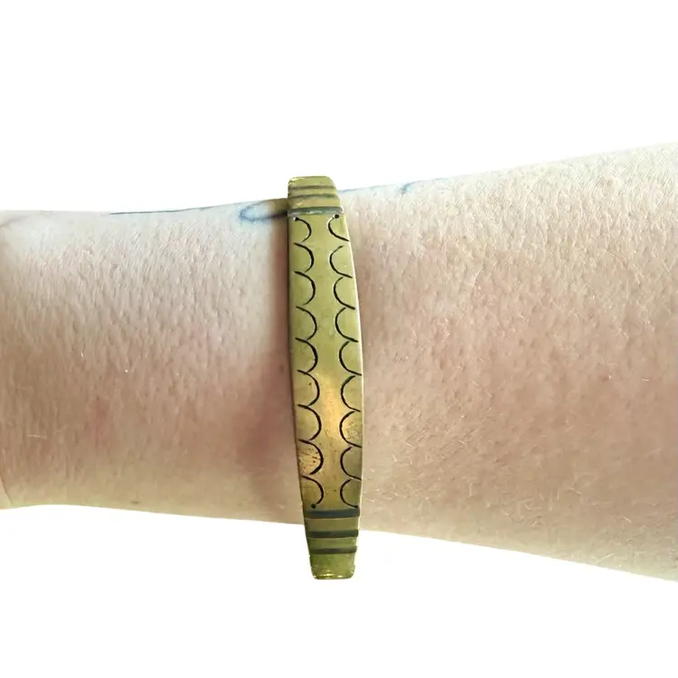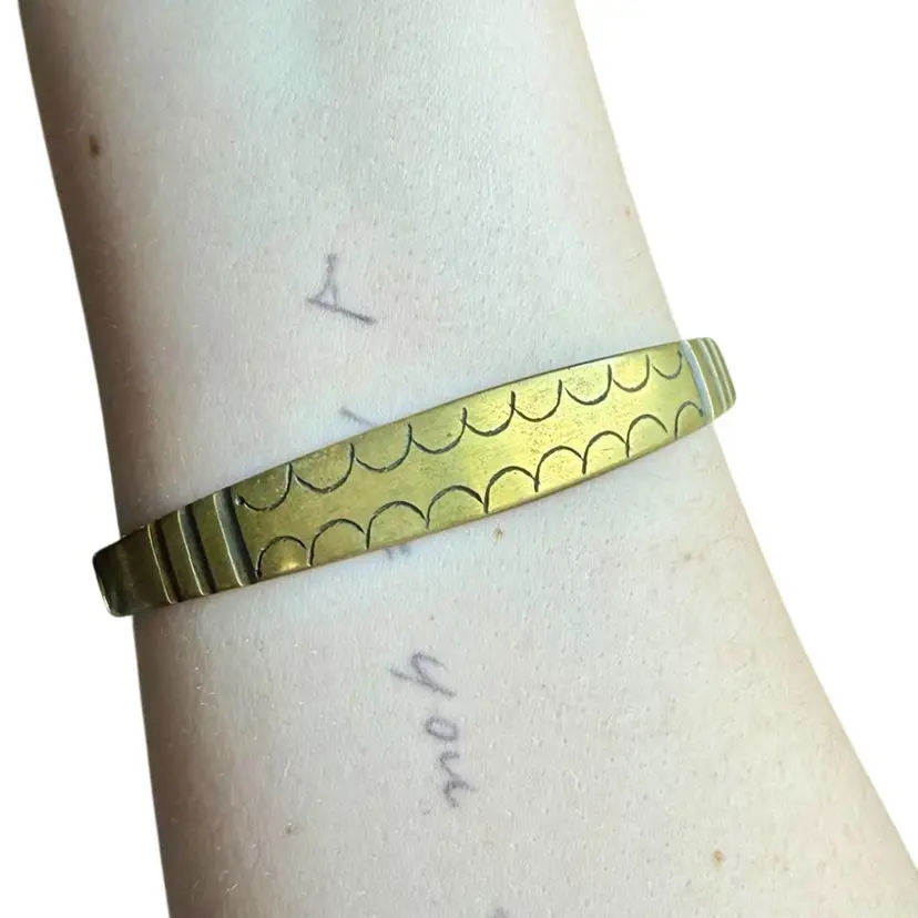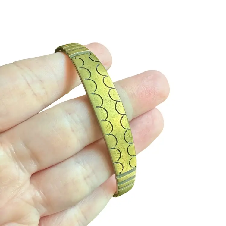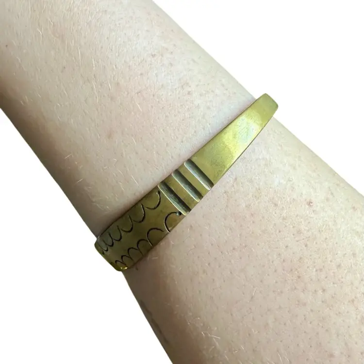 2.75” wide x 2.25” tall, bangle opening 1”, width of bangle 0.5”. Handcrafted, hefty brass bangle etched with a simple design, perfect for everyday wear. No makers mark or signature, unsure of maker! Be aware (in case of preference), has an oval shape vs. a perfect circle.