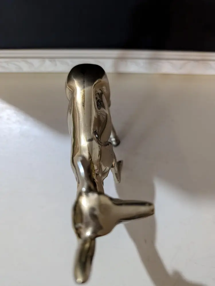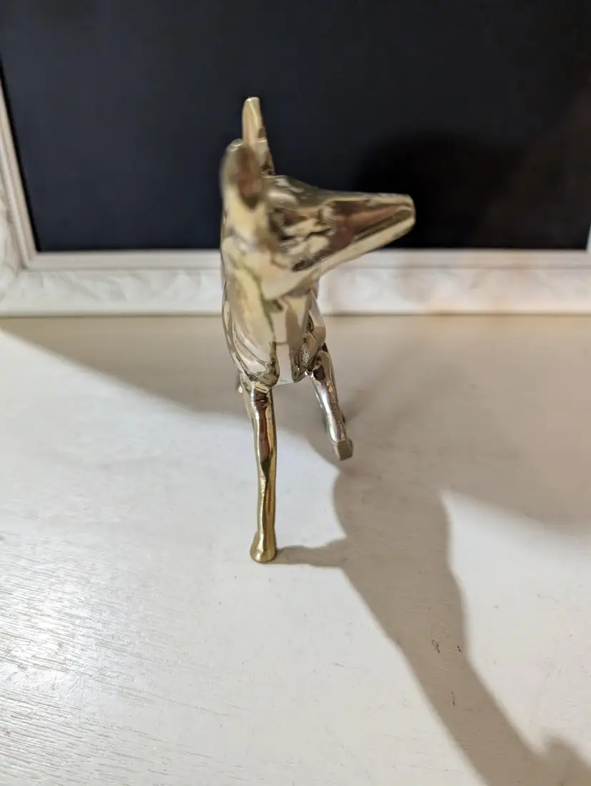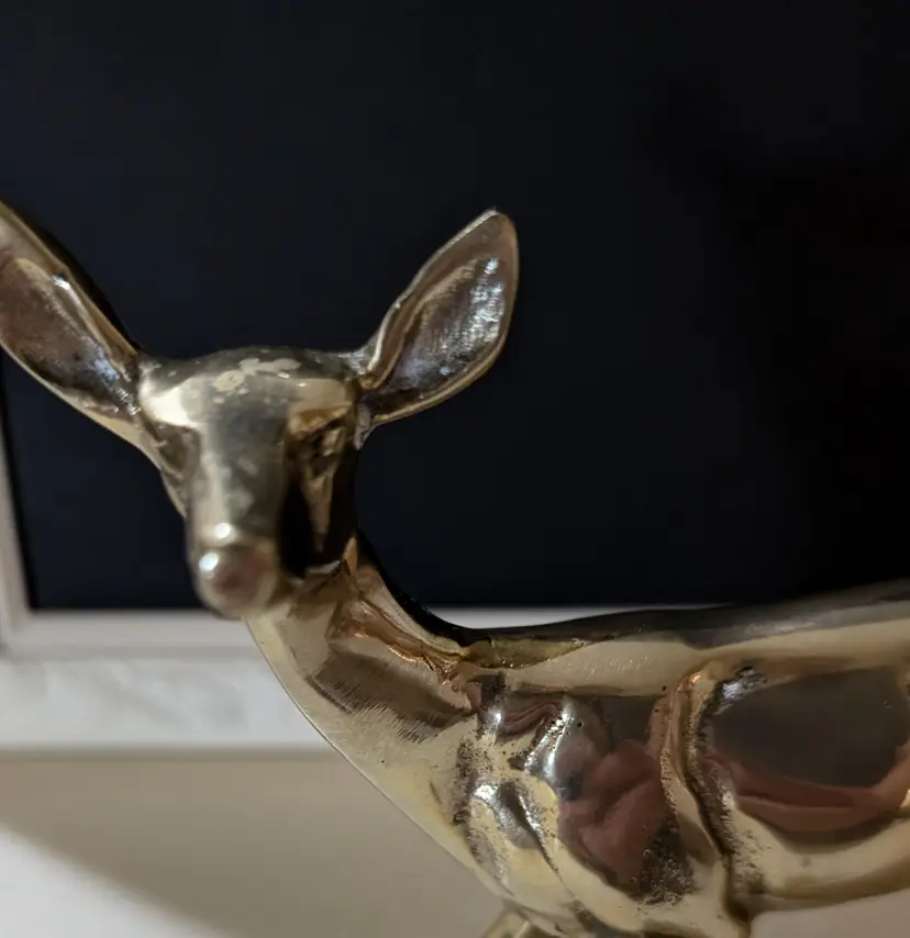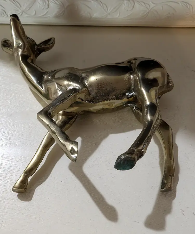 Charming vintage brass deer figurine with a sleek and elegant design. This piece is in great condition with no visible cracks or chips, making it a perfect addition to your home decor or as a unique collectible. The deer stands approximately 5.5 inches tall and 6 inches length. A lovely addition to any collection.