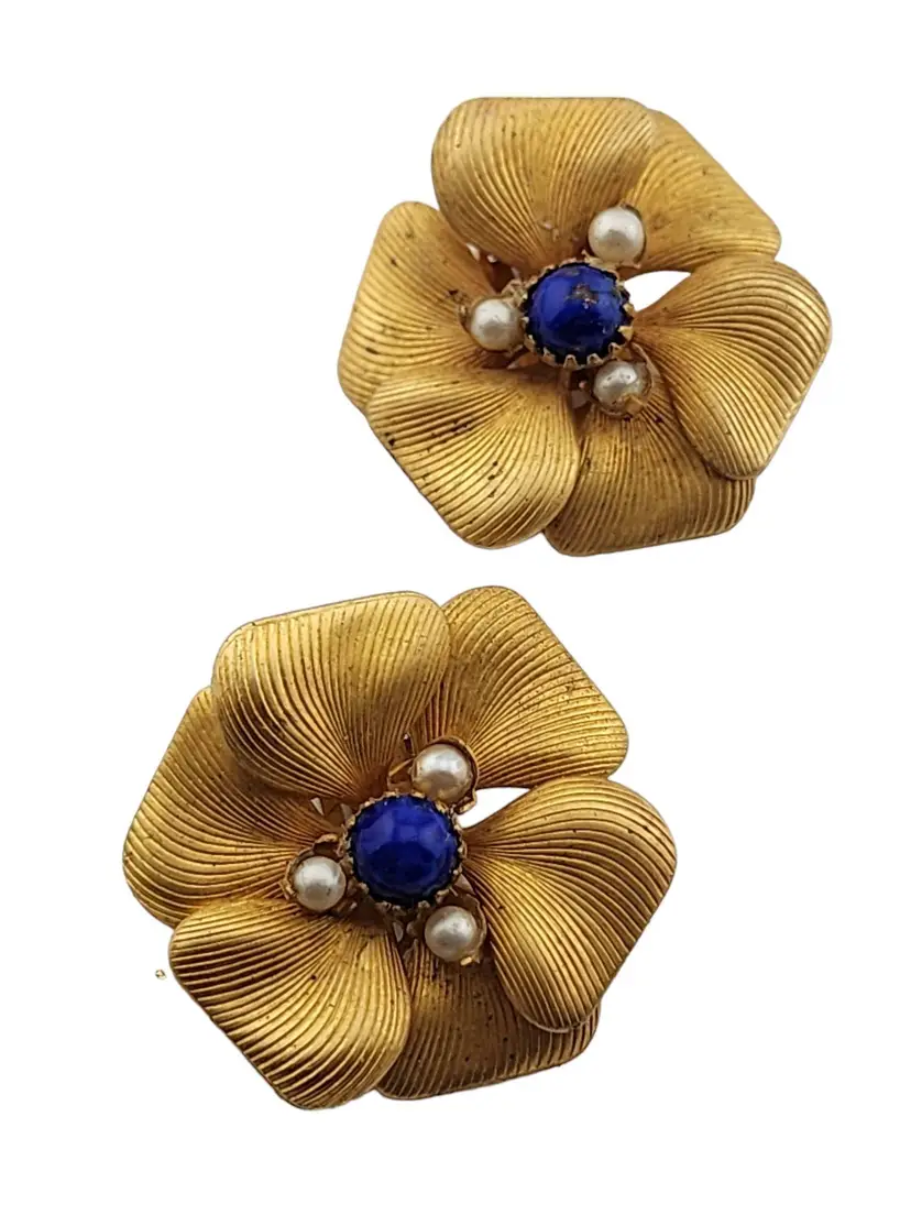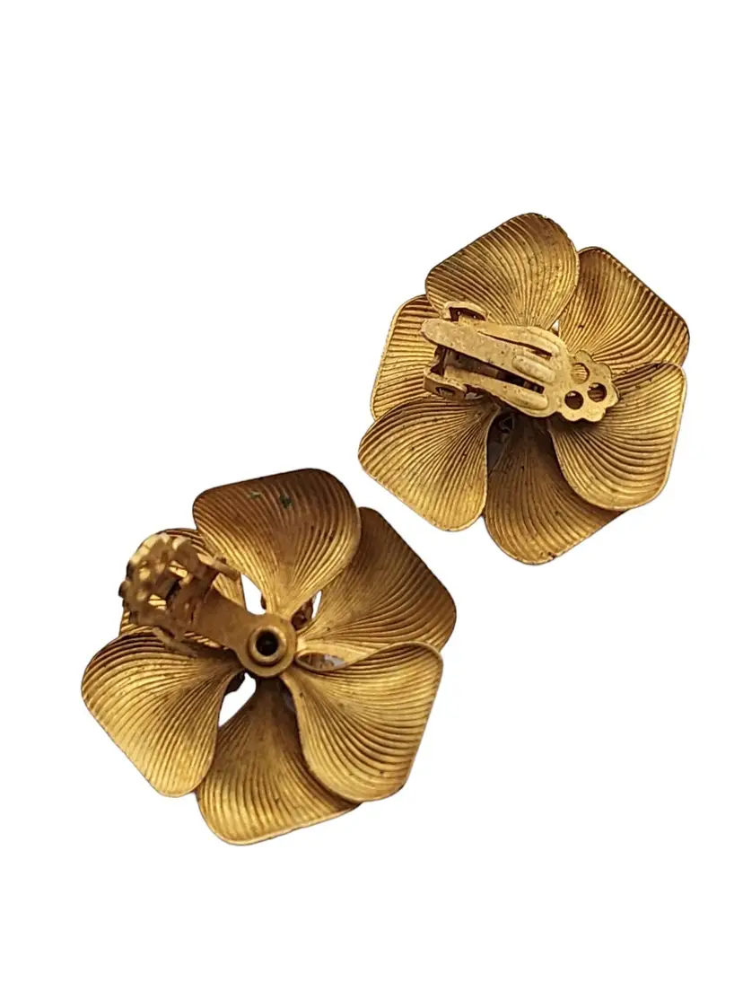 Vintage Brass Detailed Flower Petal Glass Clip Earrings (A3256)