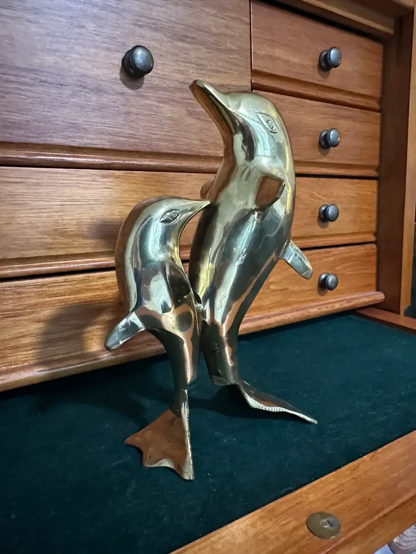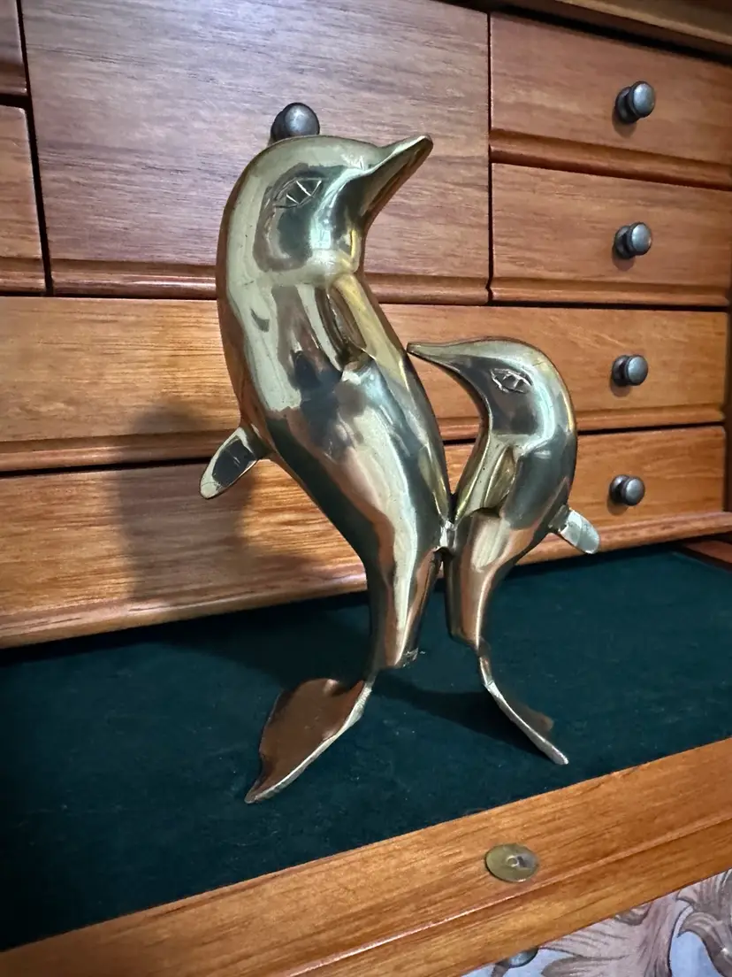 Vintage Brass Dolphins Mother & Baby Figurine Made in India Sticker on bottom still.