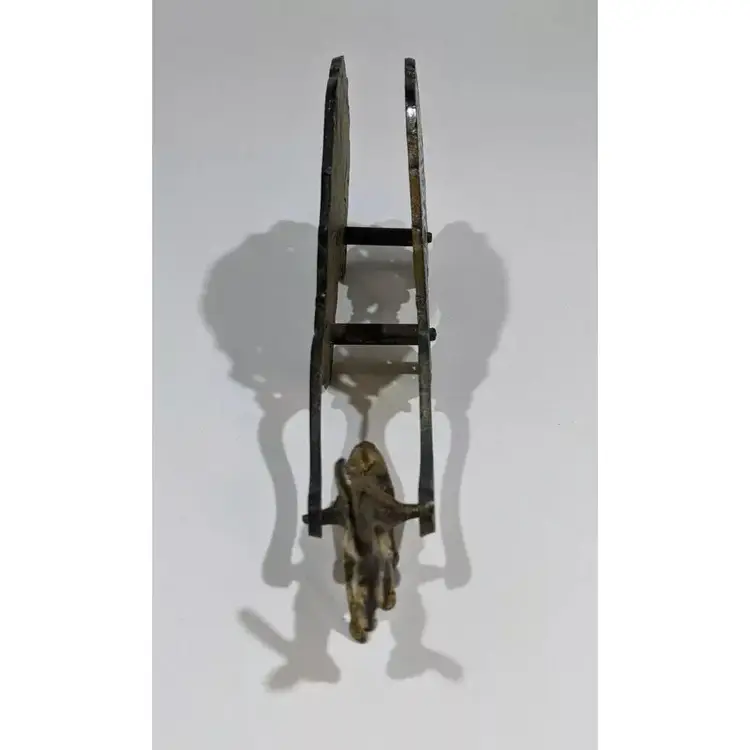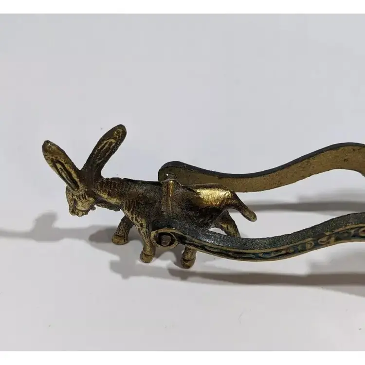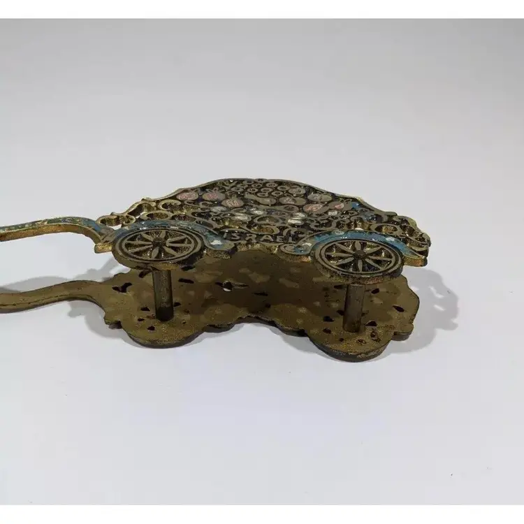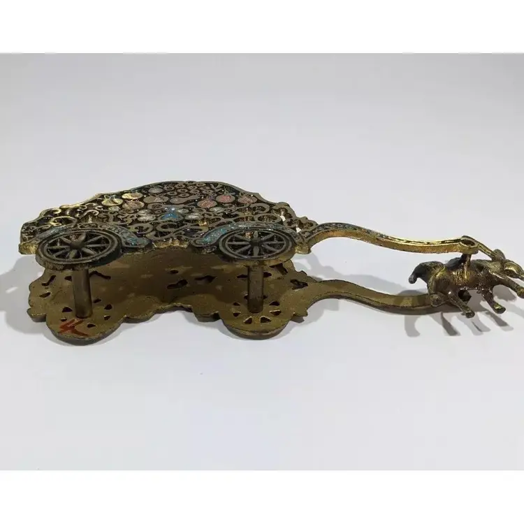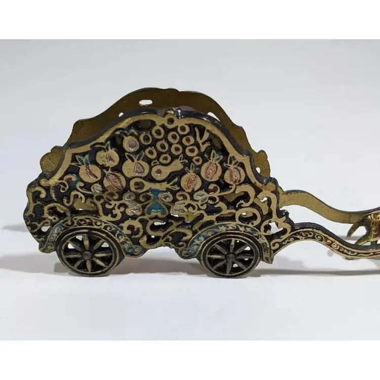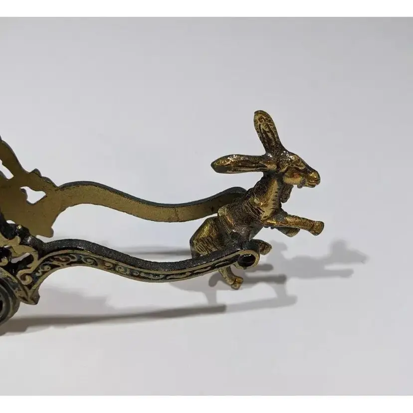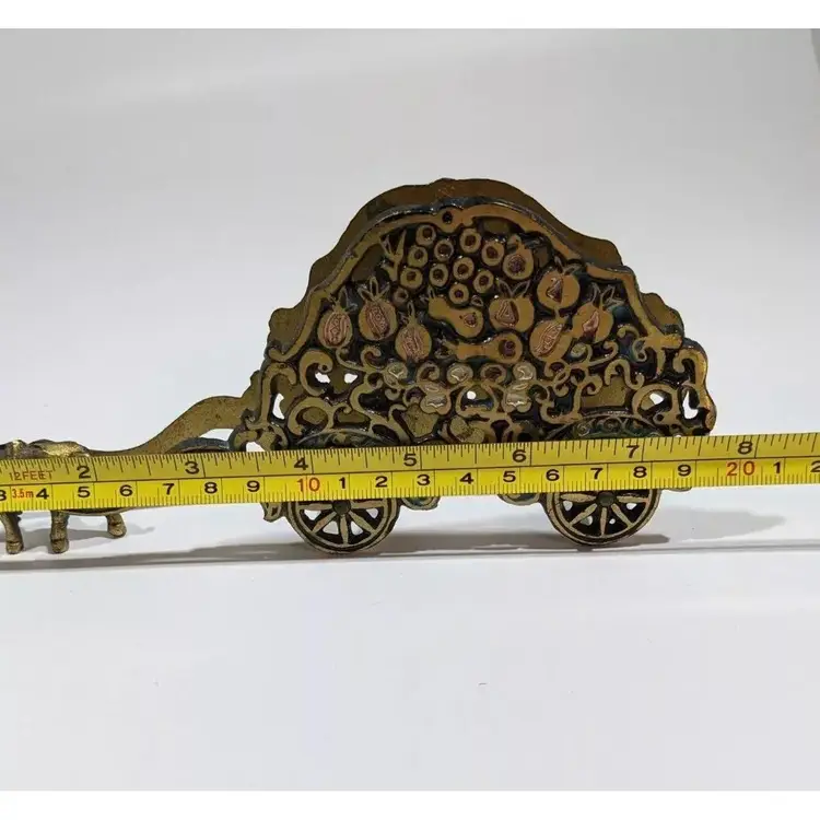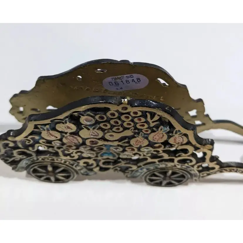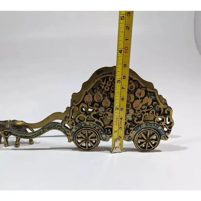 Unique brass figurine featuring a donkey pulling a cart filled with fruits. Marked 'Israel'. Great condition with a lovely patina. Approx: 8" x 3.25"
