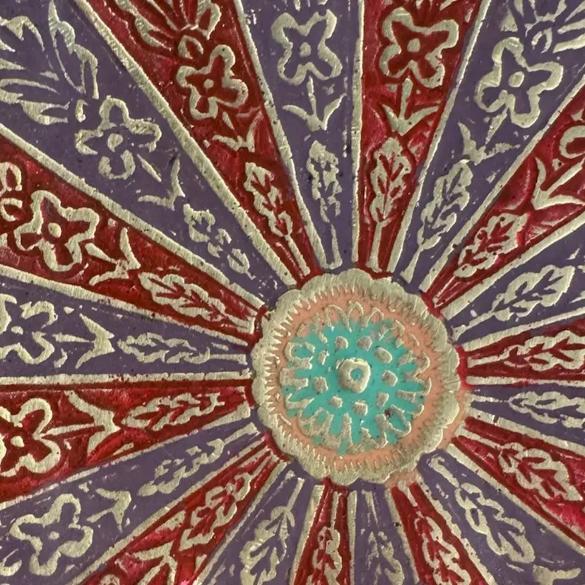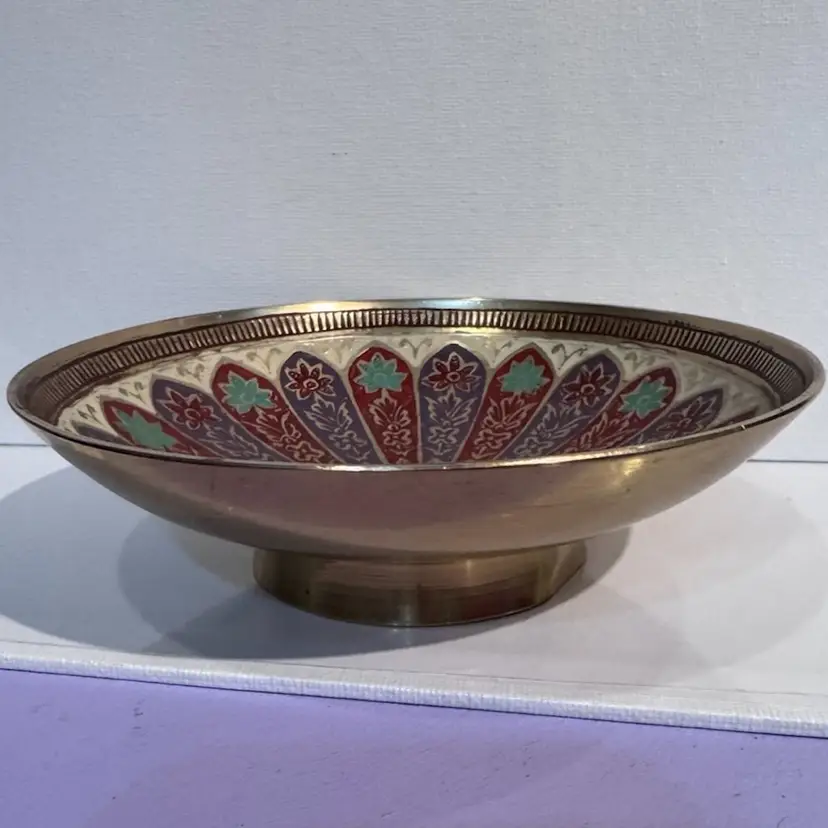 Beautiful vintage brass trinket bowl. With red, purple and aqua enamel design. Measures 5 1/2 inches across.