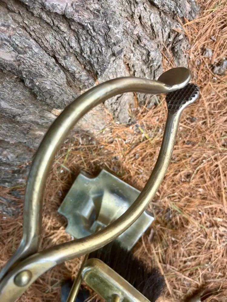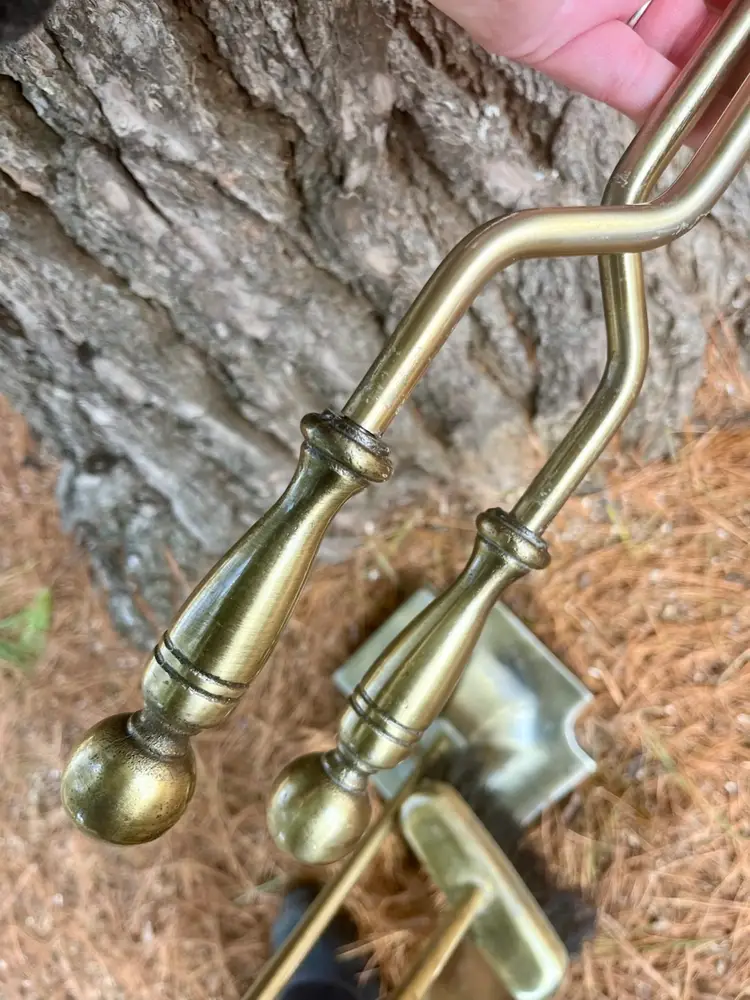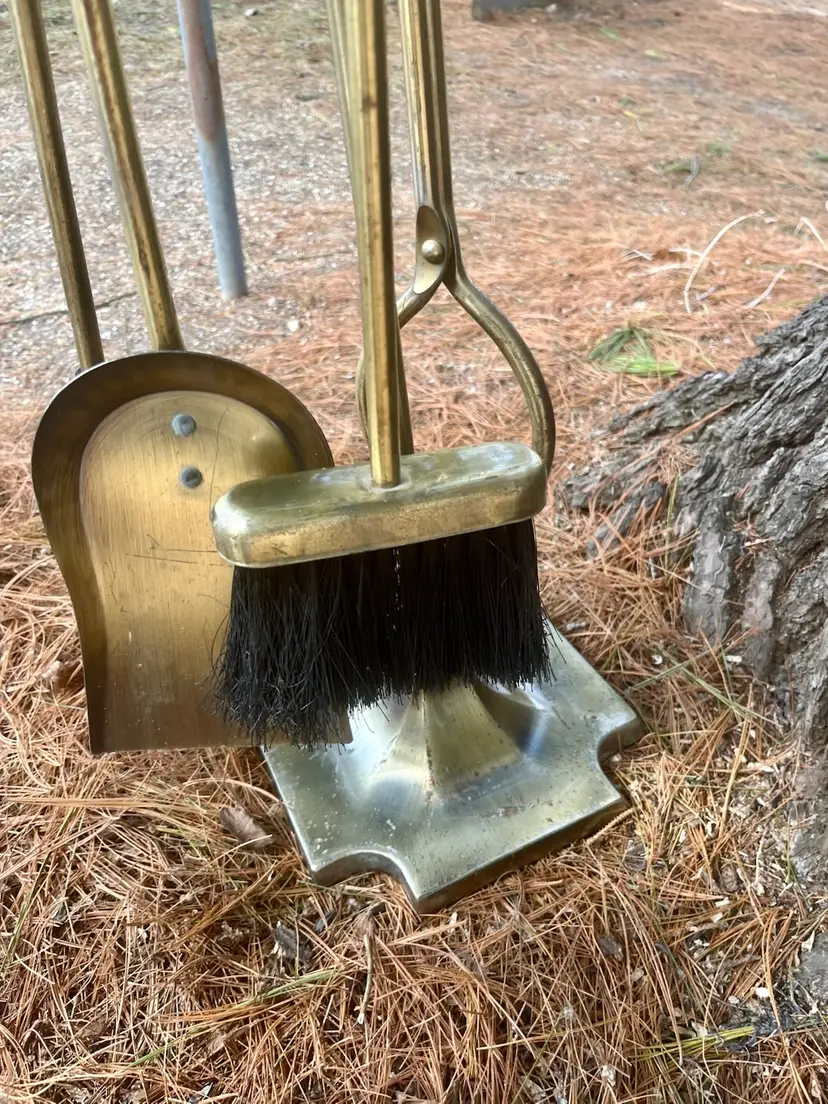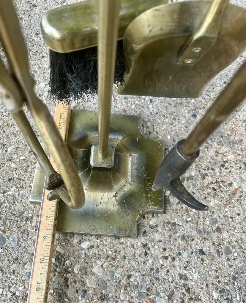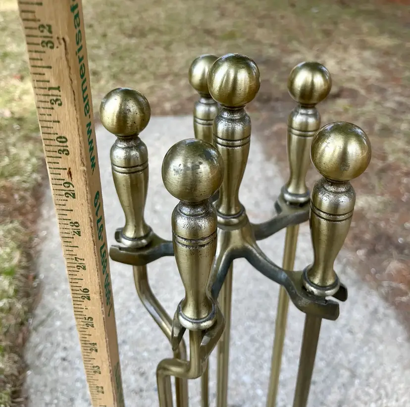 This Vintage Brass Fireplace Tool Set includes a stand, shovel, fire poker, tongs, and brush, all made of polished brass with the authentic scratches, oxidation-patina throughout. The set is sturdy and heavy-duty, weighing on its own just over 14 pounds, with a portable design that is perfect for use with fireplaces. The items are 31 inches tall and come with a polished brass finish, adding a touch of elegance to any fireplace. Made in Taiwan, this authentic vintage set is a charming addition to any home. NOTE: it is disassembled for shipping purposes.