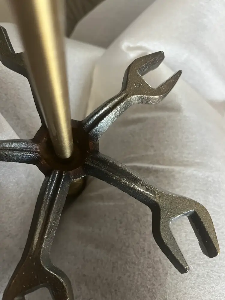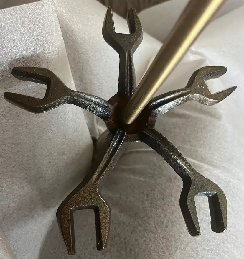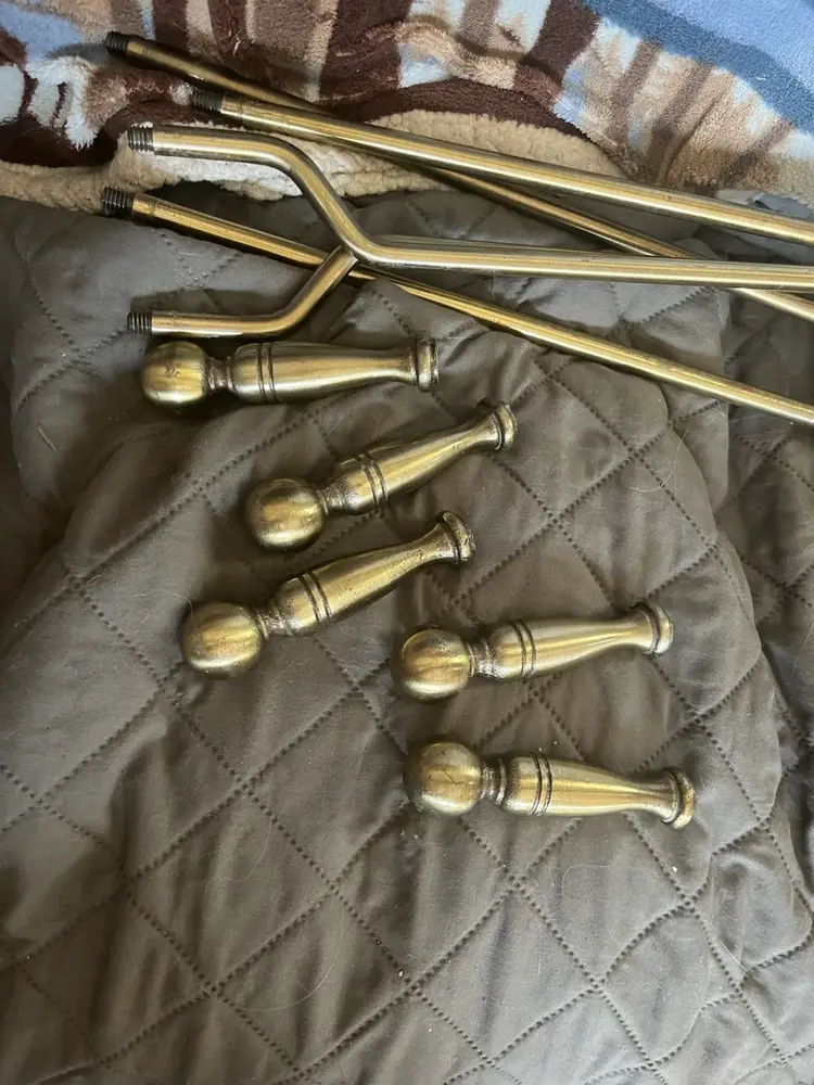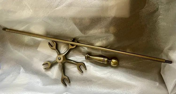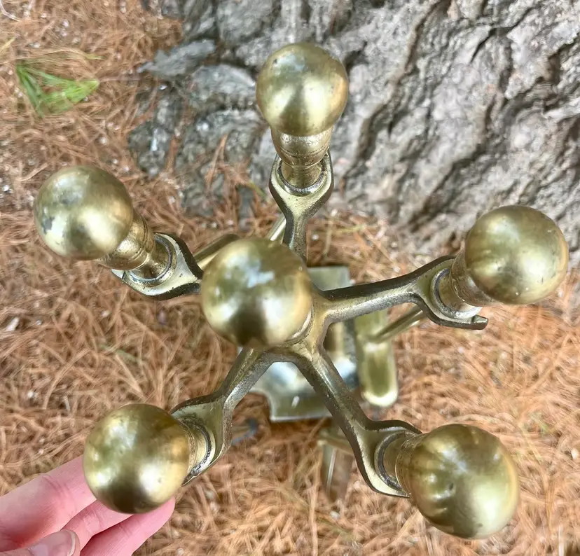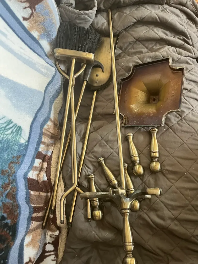 This Vintage Brass Fireplace Tool Set includes a stand, shovel, fire poker, tongs, and brush, all made of polished brass with the authentic scratches, oxidation-patina throughout. The set is sturdy and heavy-duty, weighing on its own just over 14 pounds, with a portable design that is perfect for use with fireplaces. The items are 31 inches tall and come with a polished brass finish, adding a touch of elegance to any fireplace. Made in Taiwan, this authentic vintage set is a charming addition to any home. NOTE: it is disassembled for shipping purposes.