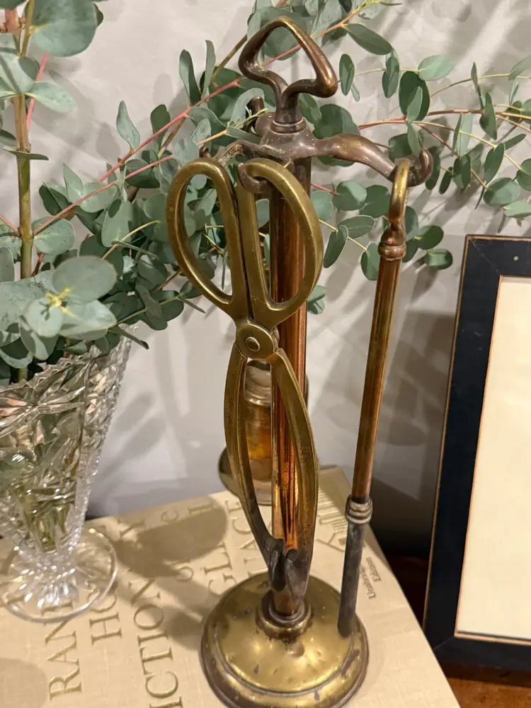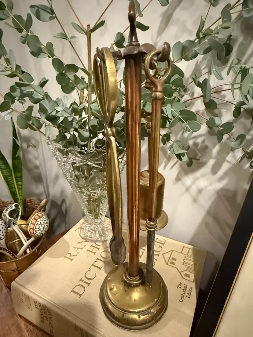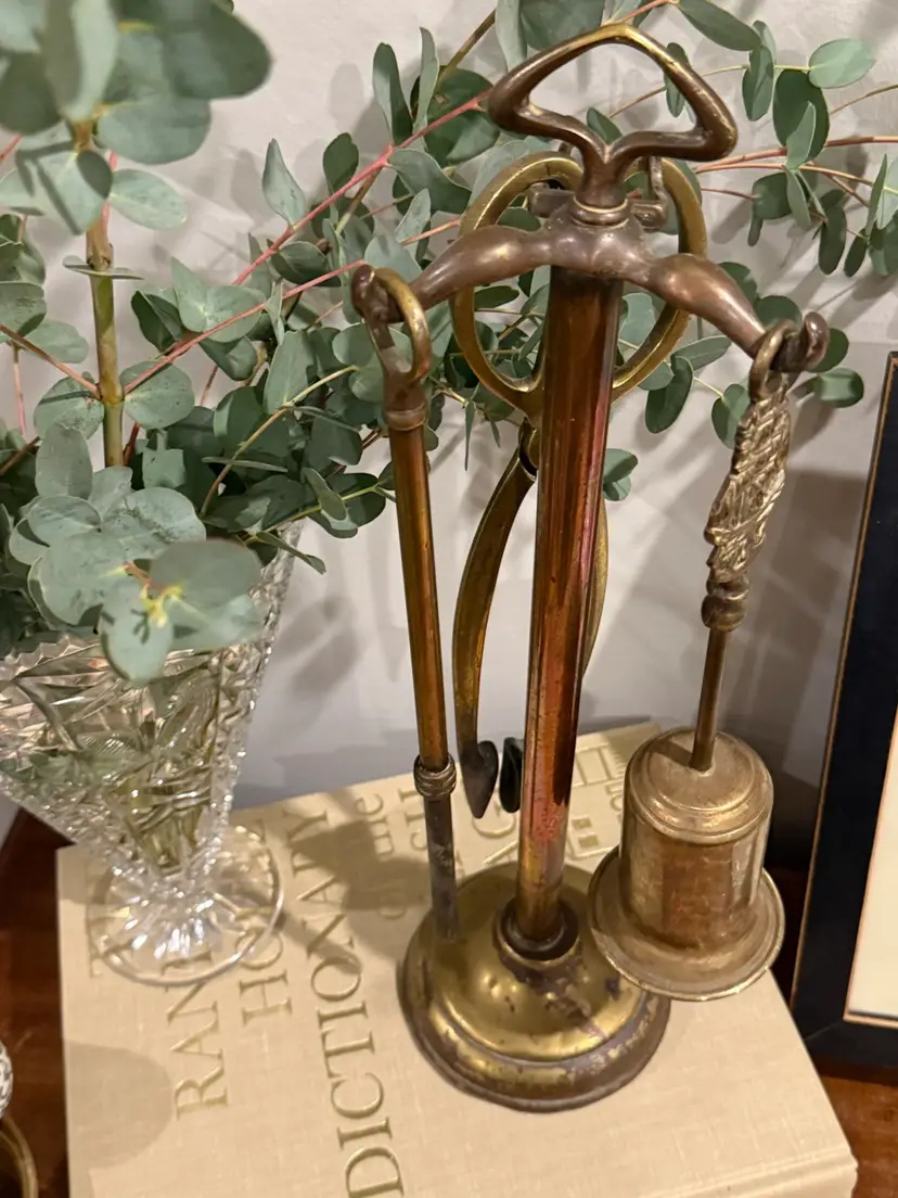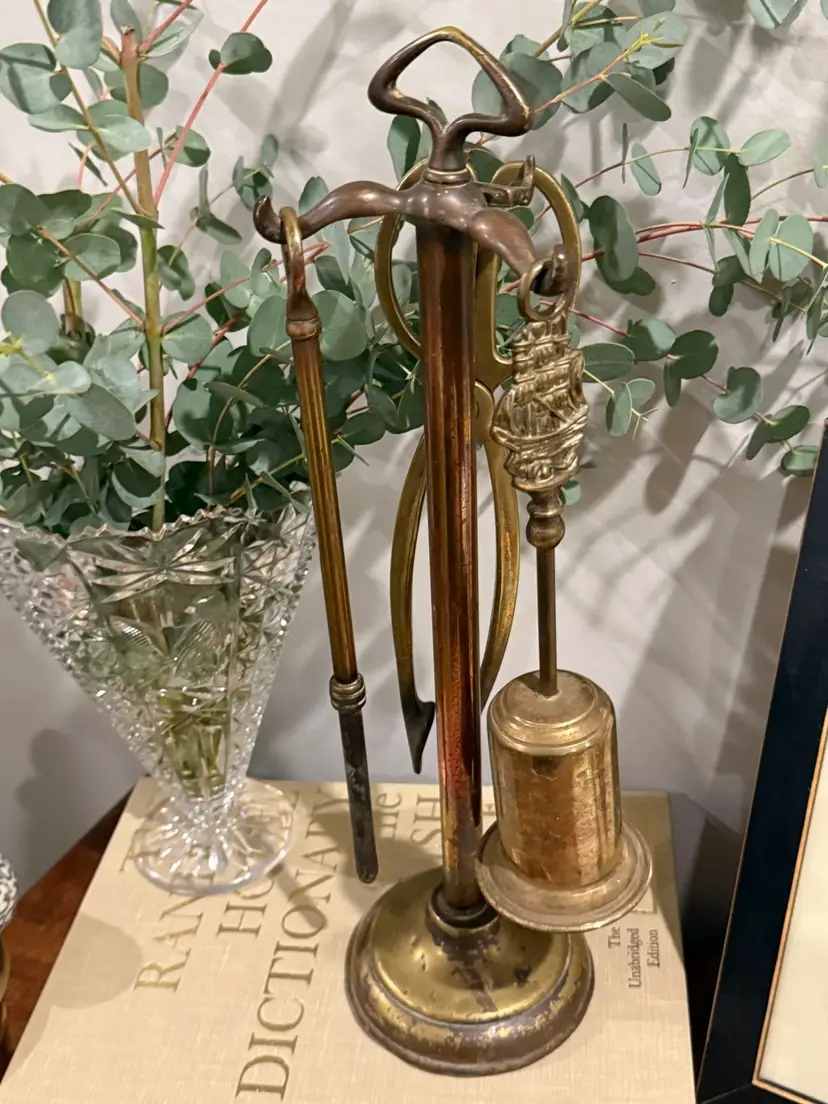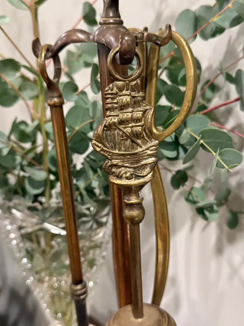Vintage brass fireplace tools with intricate details, perfect for adding a touch of classic elegance to your hearth. This set includes a stand, poker, tongs, and a bell brush with a detailed ship handle and a decorative leaf handle. Each tool features a unique design, showcasing the craftsmanship typical of vintage brass pieces. The set is in good pre-owned condition with a natural patina that enhances its antique charm. Ideal for collectors or anyone looking to complement their fireplace with functional art.