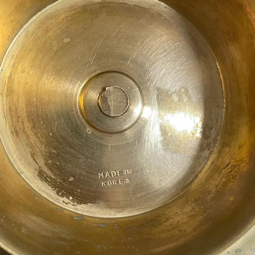 This vintage brass pedestal dish is a beautiful addition to any collection. The dish features intricate details of storks and cranes, handcrafted in Korea. The patina adds to the charm of the piece, making it a unique and timeless decorative item.