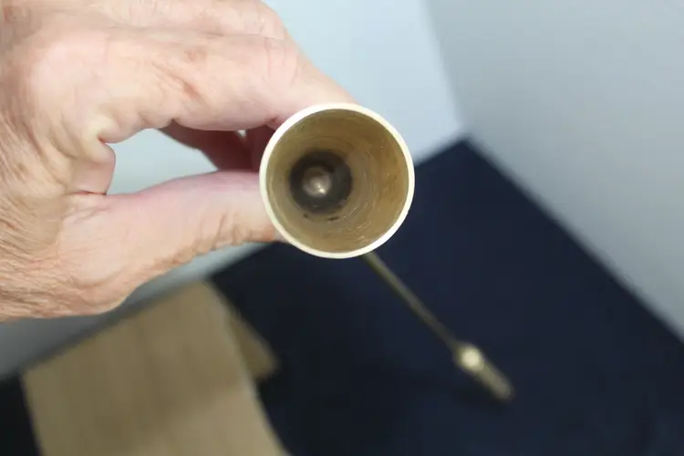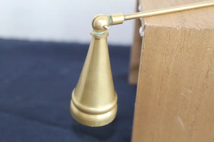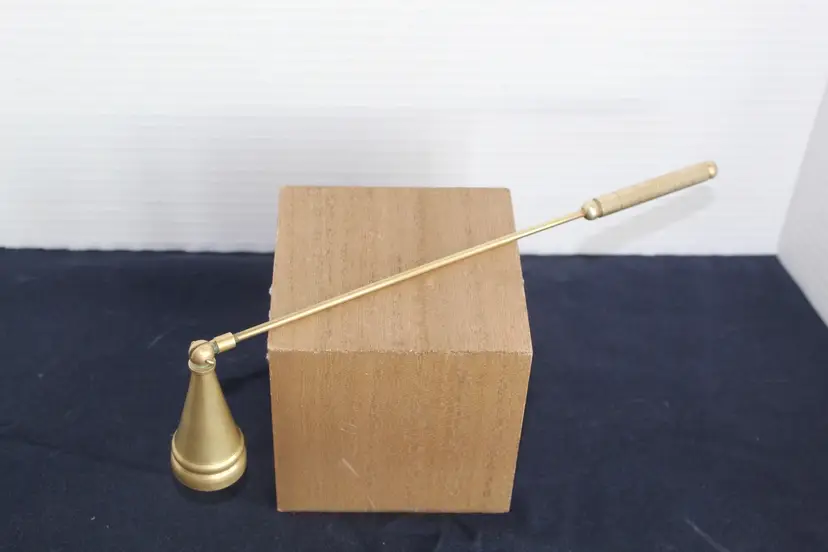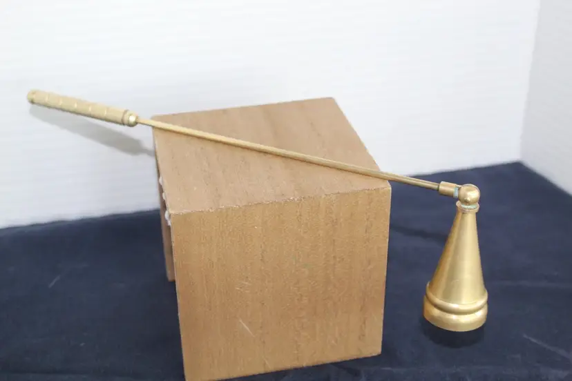 Vintage 1962 brass candle snuffer has a 10 inch long handle and elongated bell. The handle is hinged to the bell. The bell is 1 1/8" across x 2 1/2" long. A useful tool and attractive display piece for Christmas and year round. In good used condition with scrapes, mars, and scratches on the brass bell shiny surface. The handle has less wear. We cleaned out the inside as much as possible .
