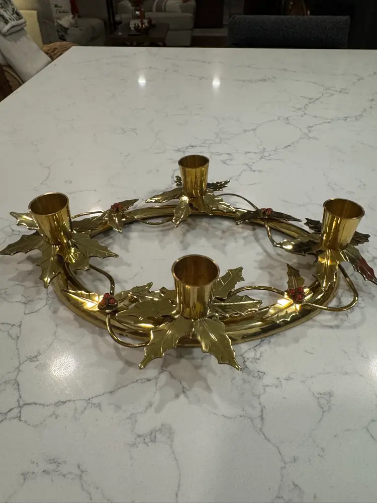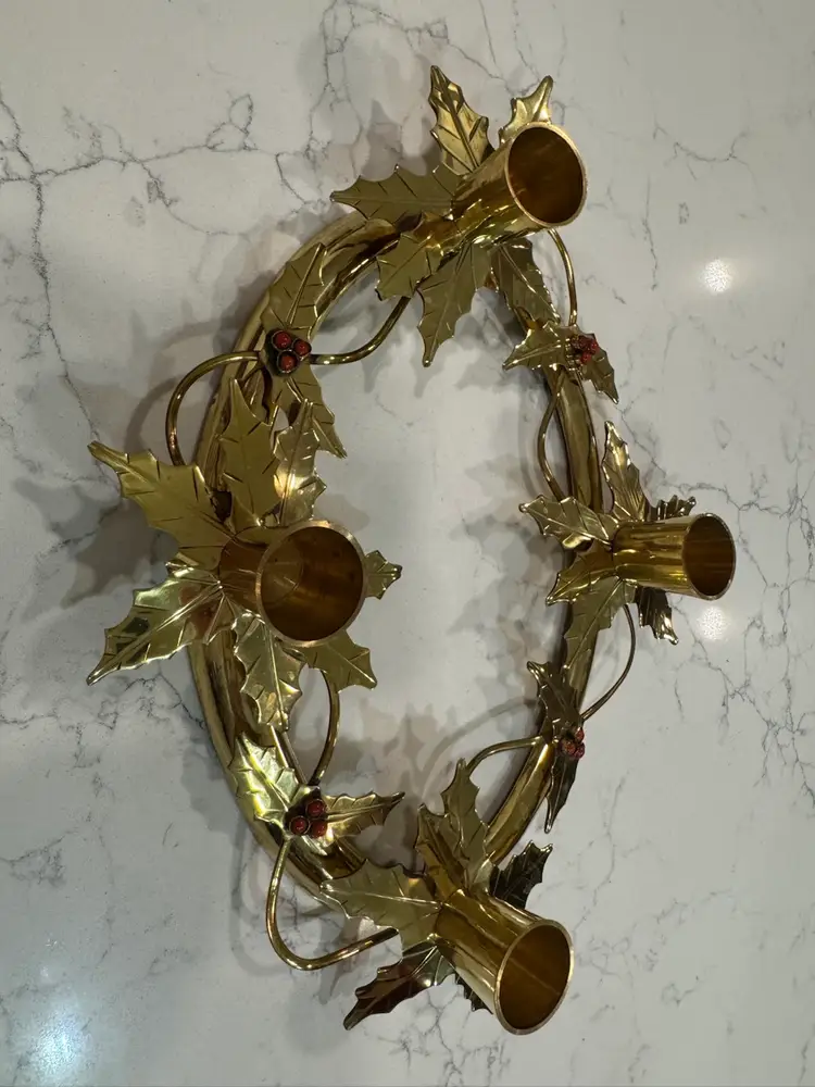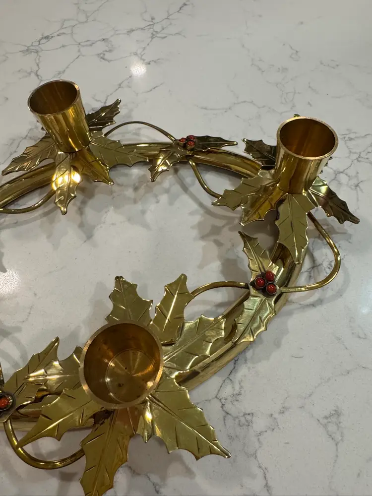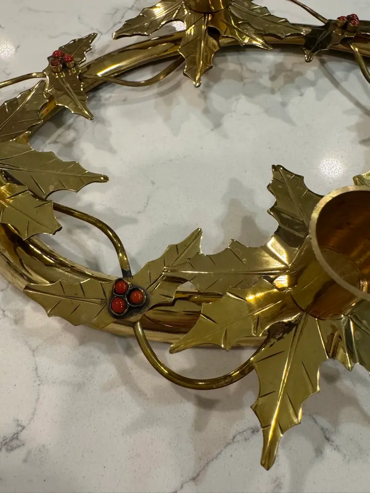 This charming piece features intricate brass holly leaves adorned with red berry accents, forming a beautiful ring design. It is designed to hold multiple taper candles, perfect for creating a warm and inviting ambiance during the holidays or as a year-round decorative accent. Excellent pre-owned condition. No flaws or damage, ready to display. Ideal for mantle pieces, dining tables, or as part of a centerpiece.
