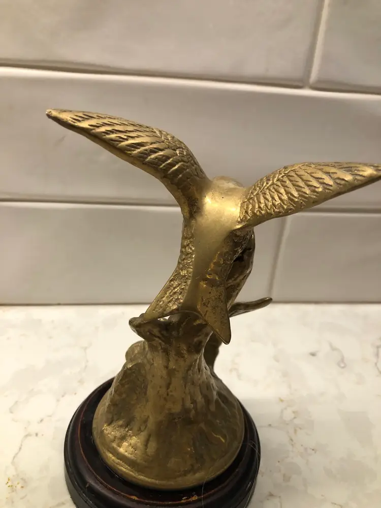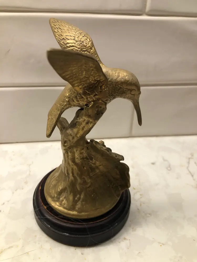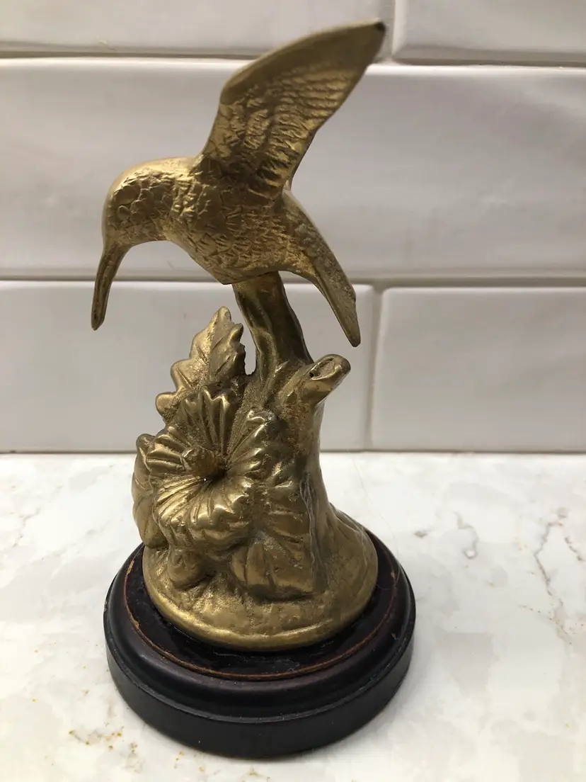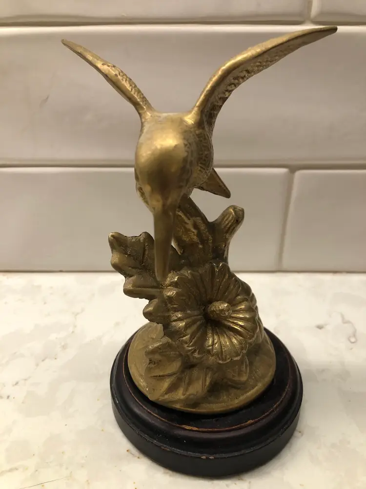 A vintage brass hummingbird figurine, lKorea by J.I.J. Design, perched on a black wooden base. The hummingbird is poised above a flower, showcasing detailed artistry. 6 1/2 inches tall.