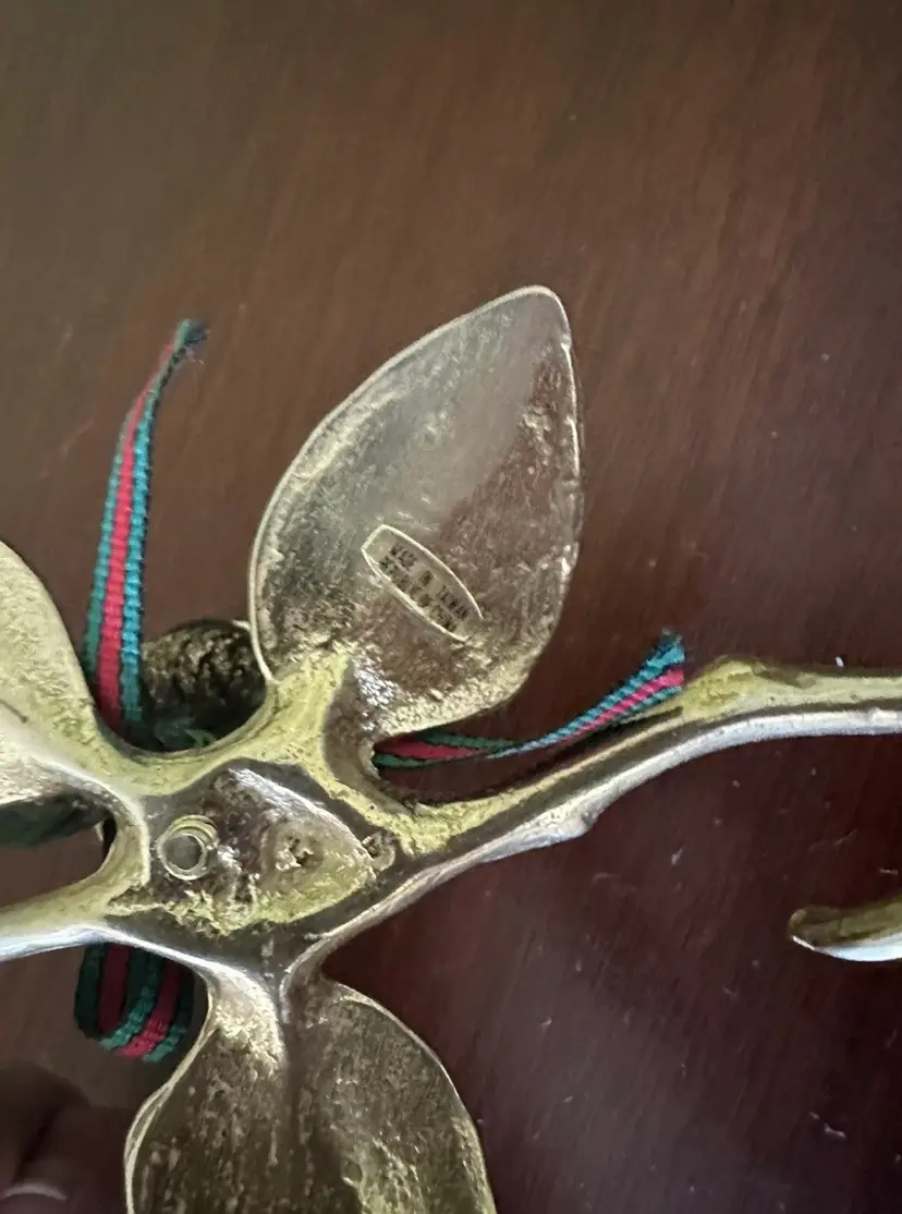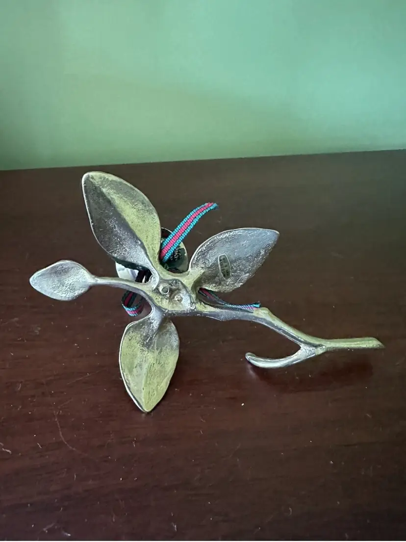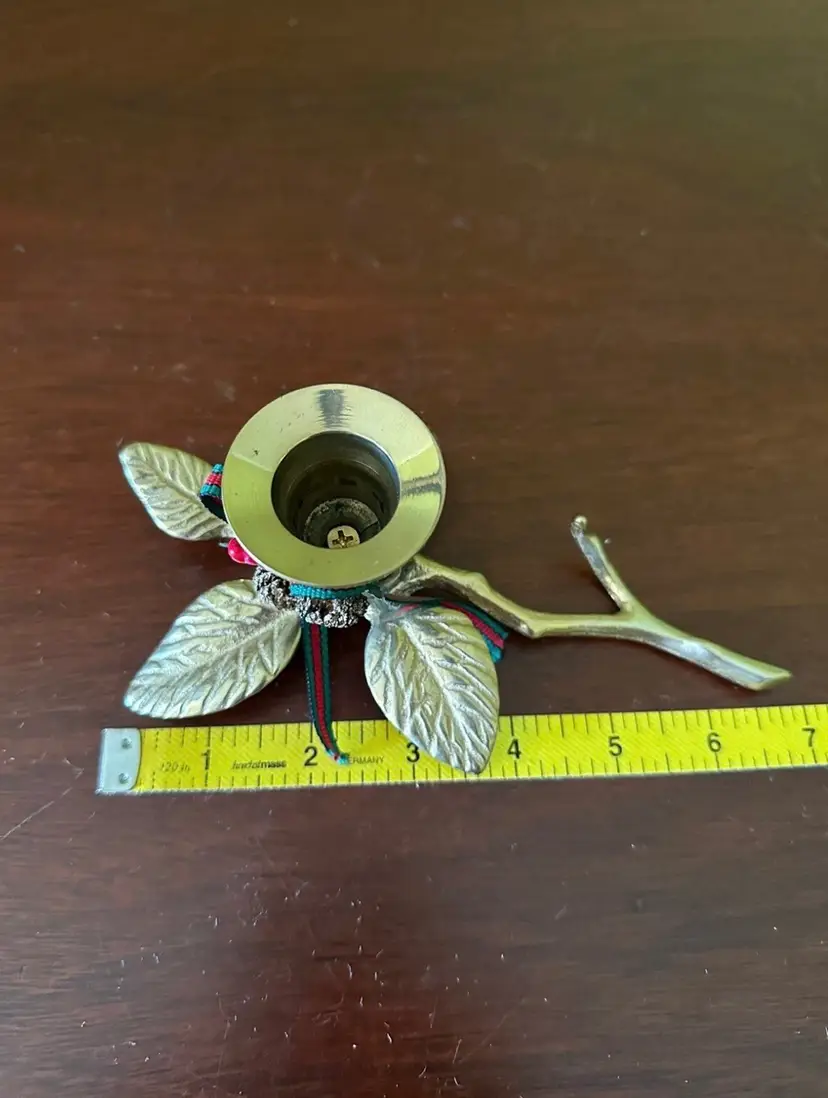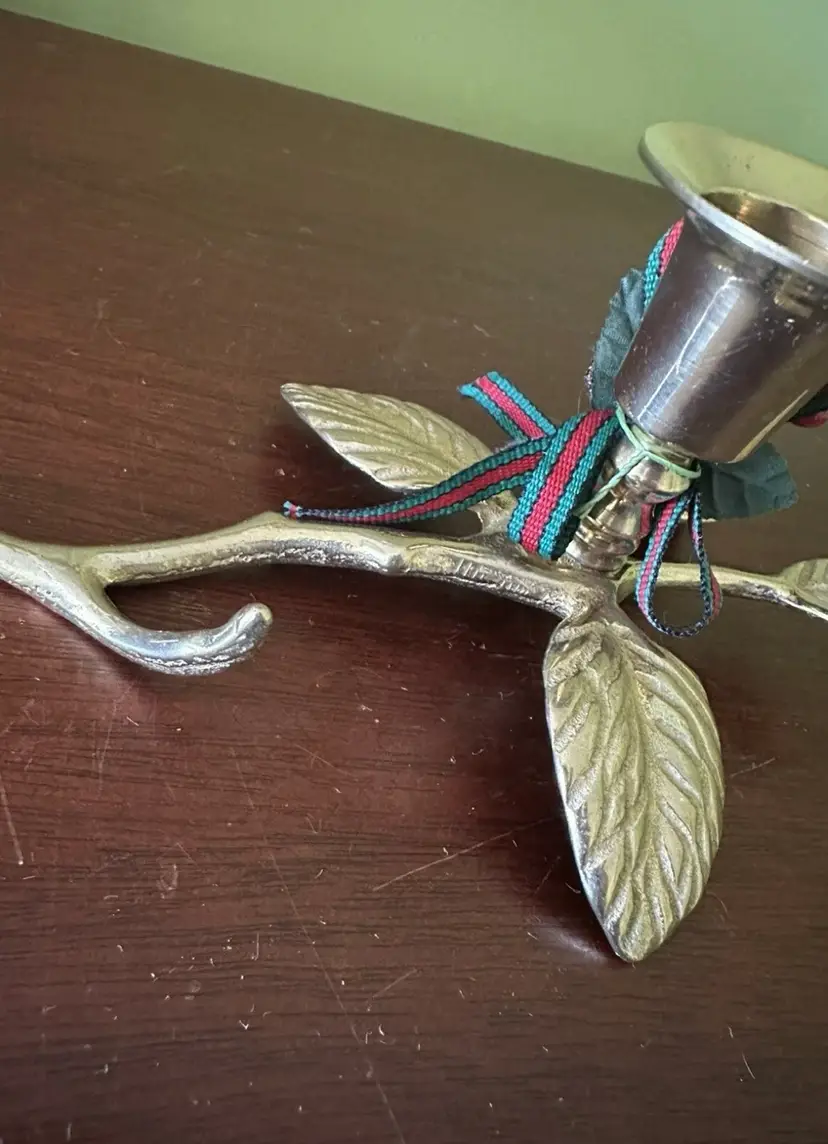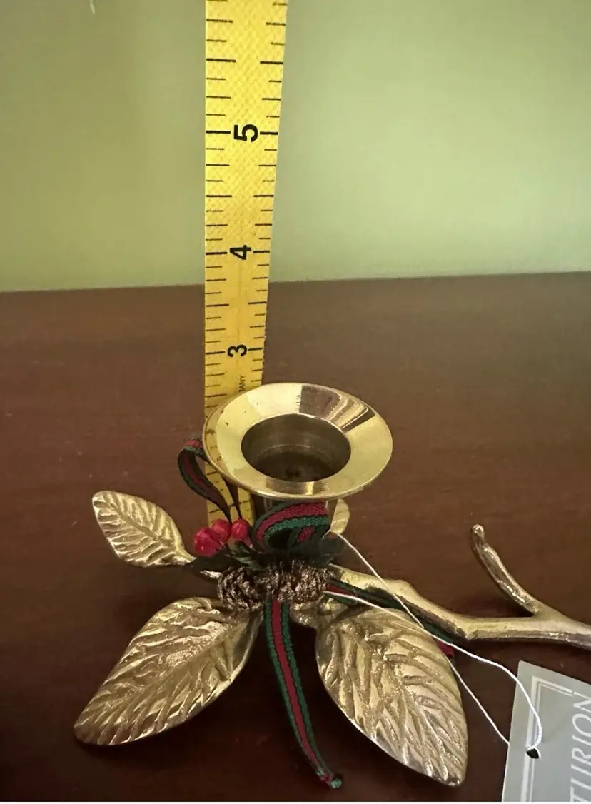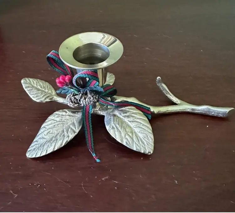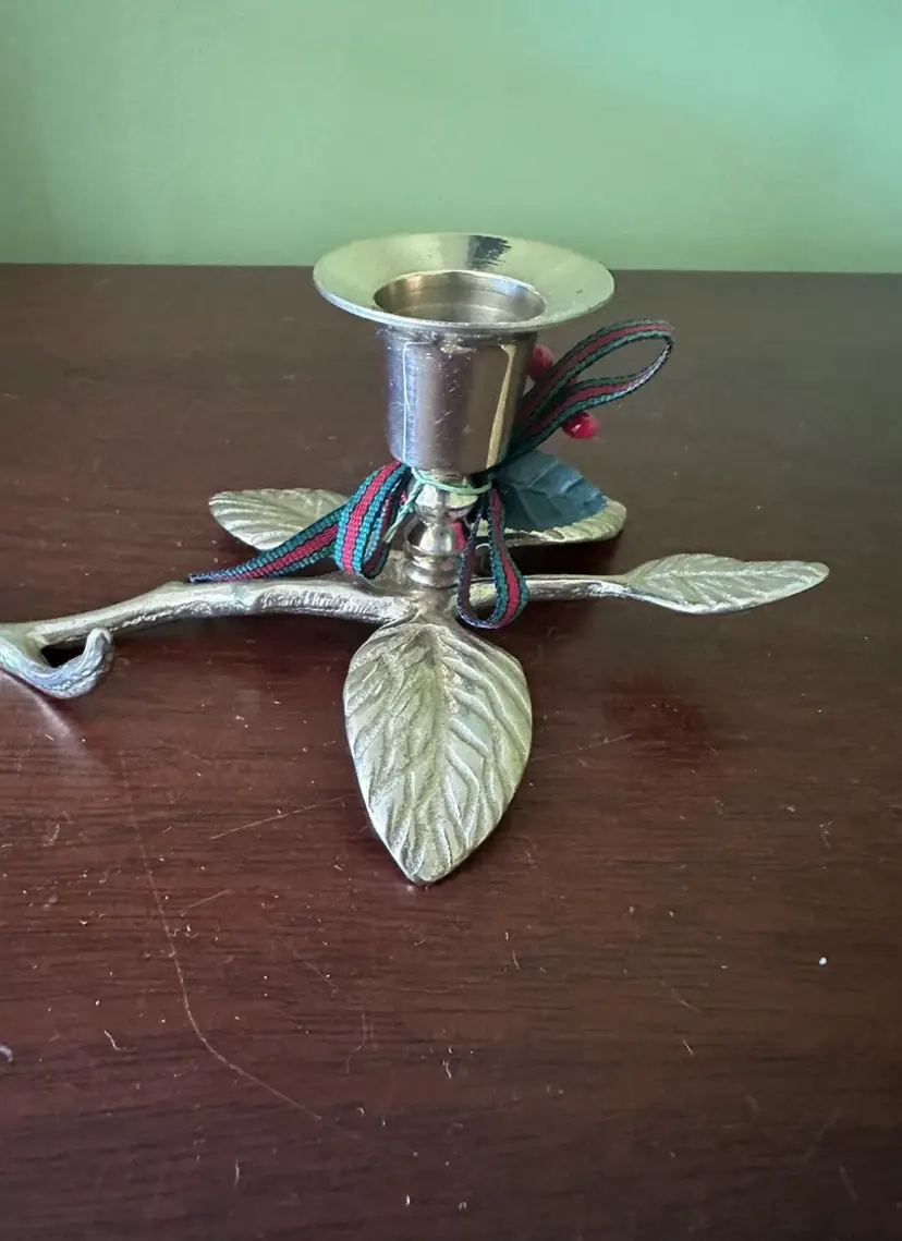 Brass leaf candle holder holly bow is removable. Original box has wear from storage