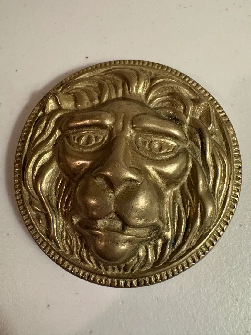 Vintage Brass Lion Paperweight Medallion. Very solid and heavy brass. Measures 3 1/2 in in diameter with felt backing.