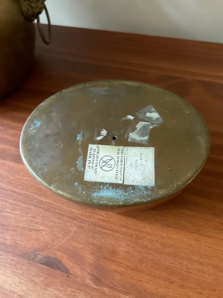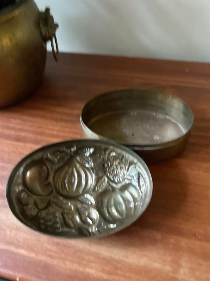 Vintage brass embossed fruit box with lid. Good condition. Measures 5 x 7 inches and 4 inches tall.