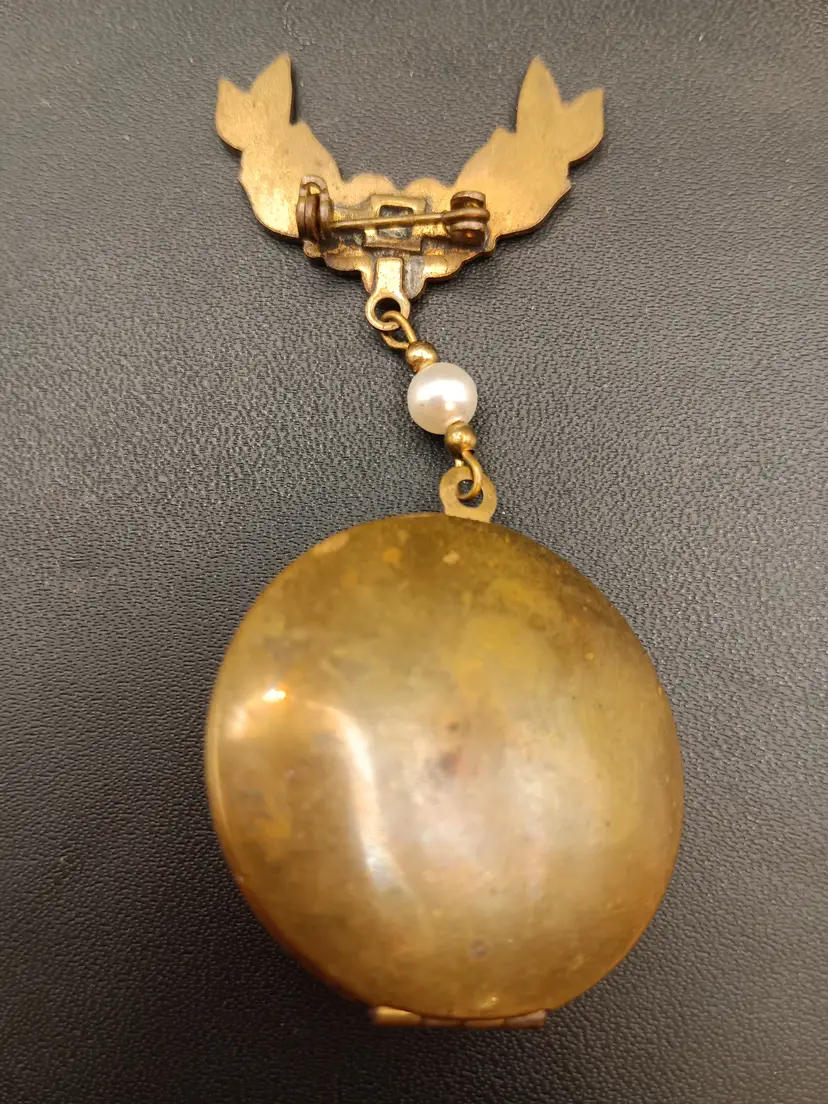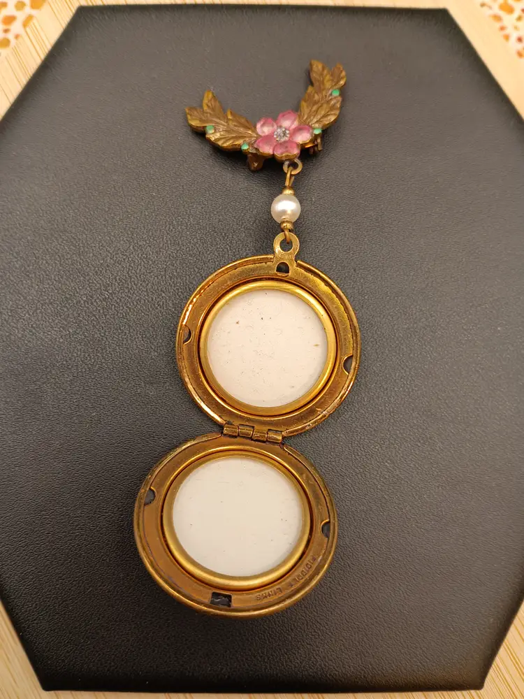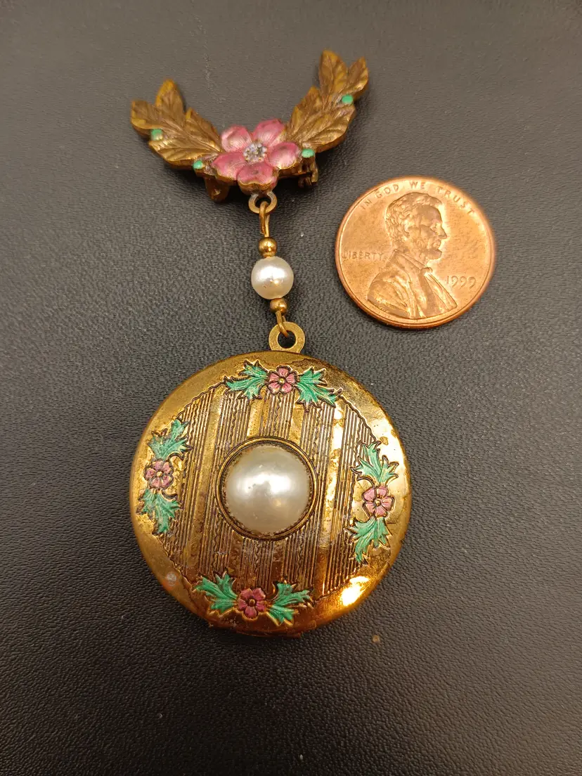 Hi in this lot you will receive 1 beautiful vintage brass and faux pearl, pink and green enamel engraved locket-brooch. The locket has spots for two photos. Overall length is approximately 2.5" The pendant locket is approximately 1.5" diameter. An amazing addition to anyone's collection.