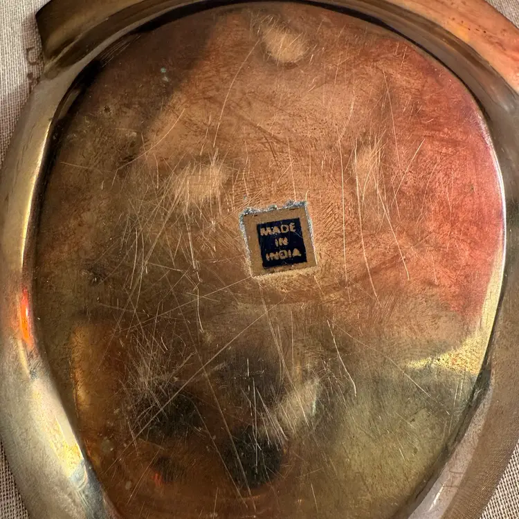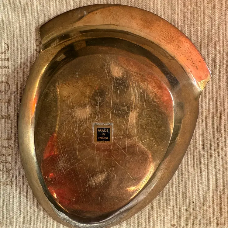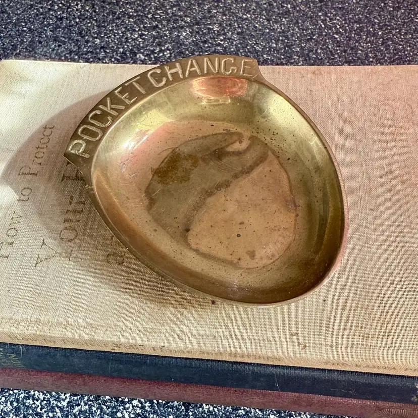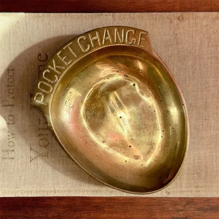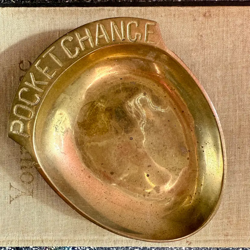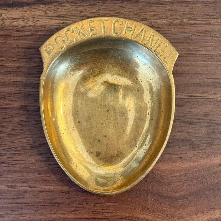 This charming vintage brass "Pocket Change" dish seamlessly combines functionality with a touch of nostalgia, making it an excellent choice for organizing coins, keys, or other small essentials. Its sturdy construction and warm patina, which beautifully showcase its age, suggest that it hails from mid-20th-century American design—a period when decorative catch-all dishes like this were all the rage for entryways and bedside tables. Whether you're a vintage enthusiast or looking to add a unique flair to your decor, this dish is sure to be a standout piece in any collection.