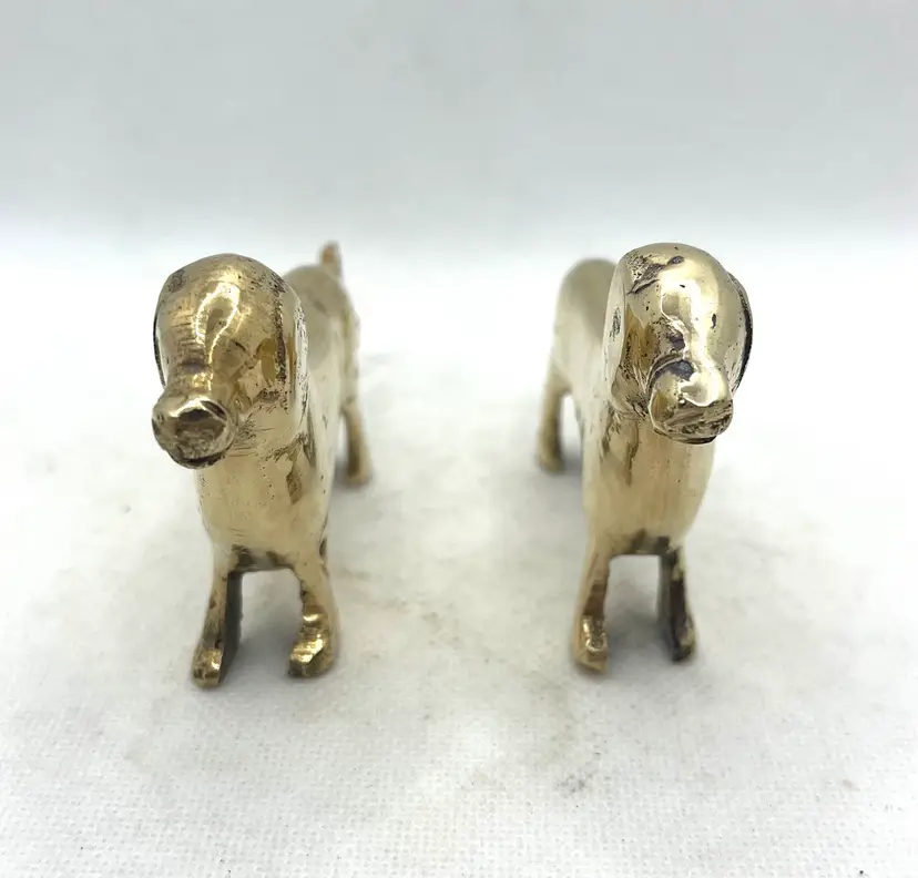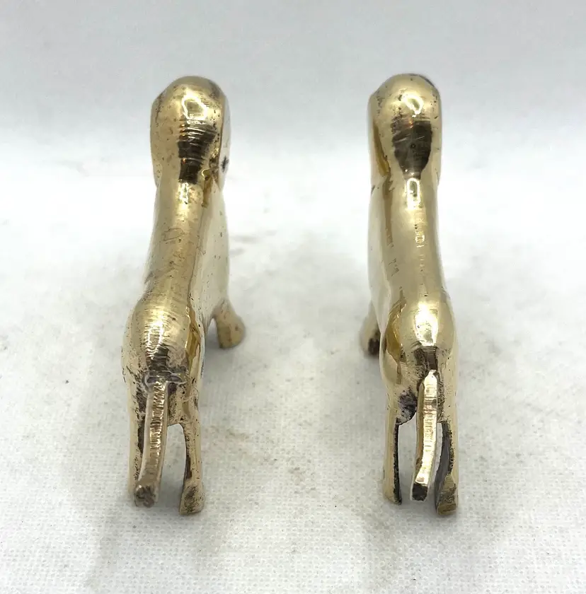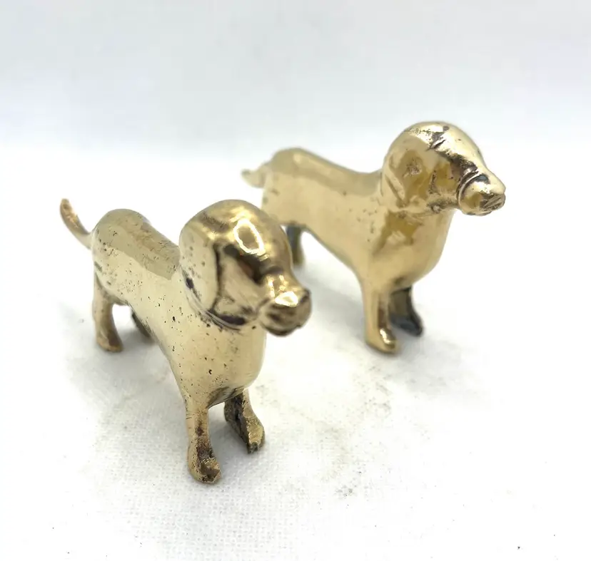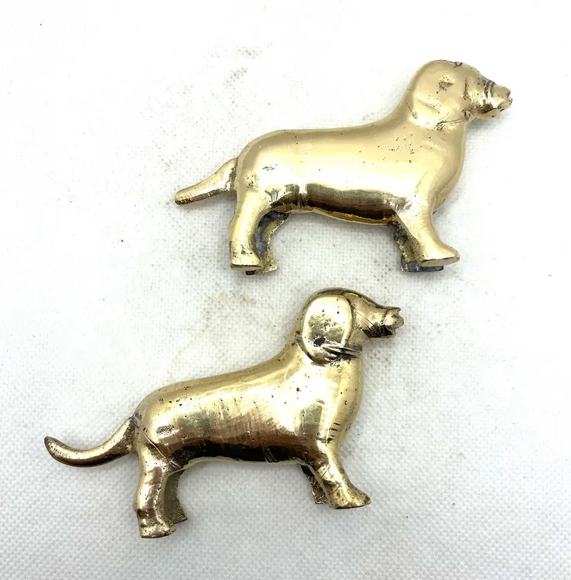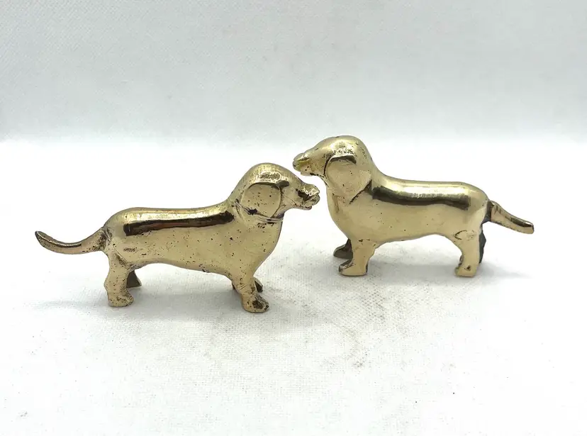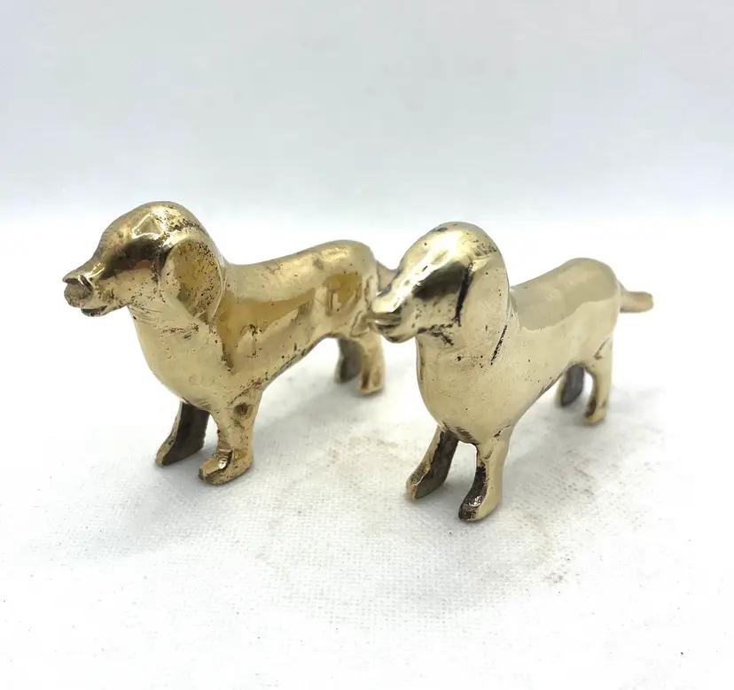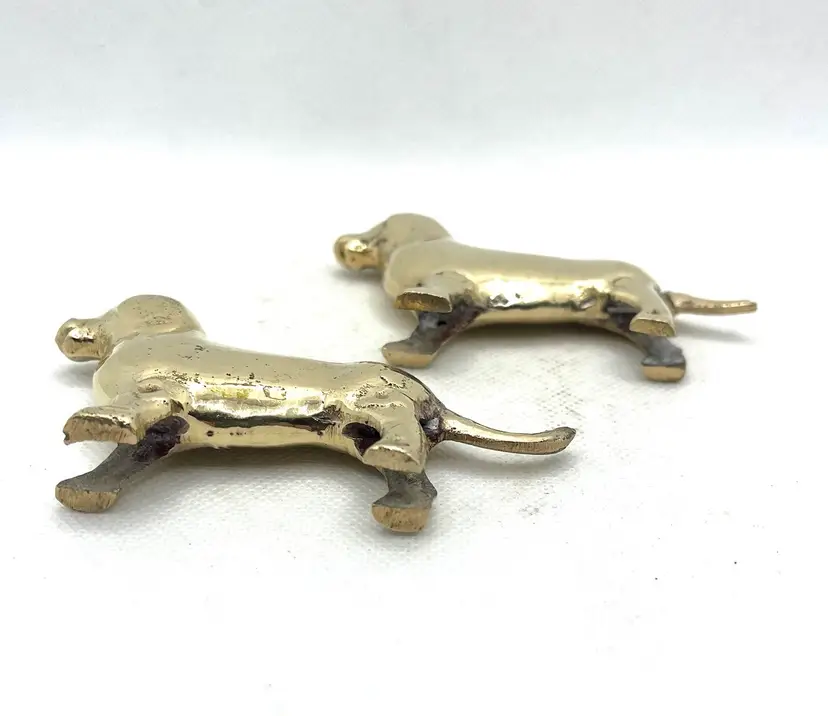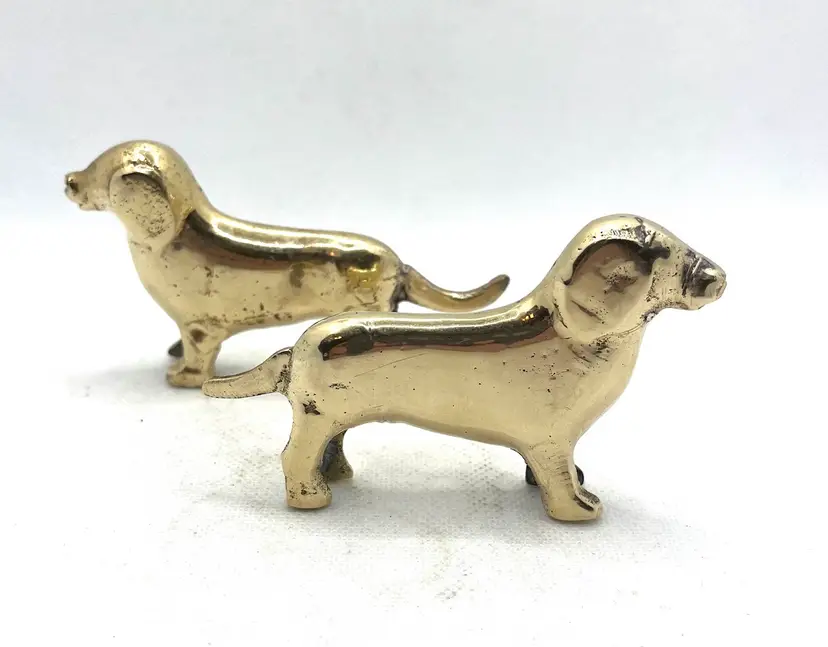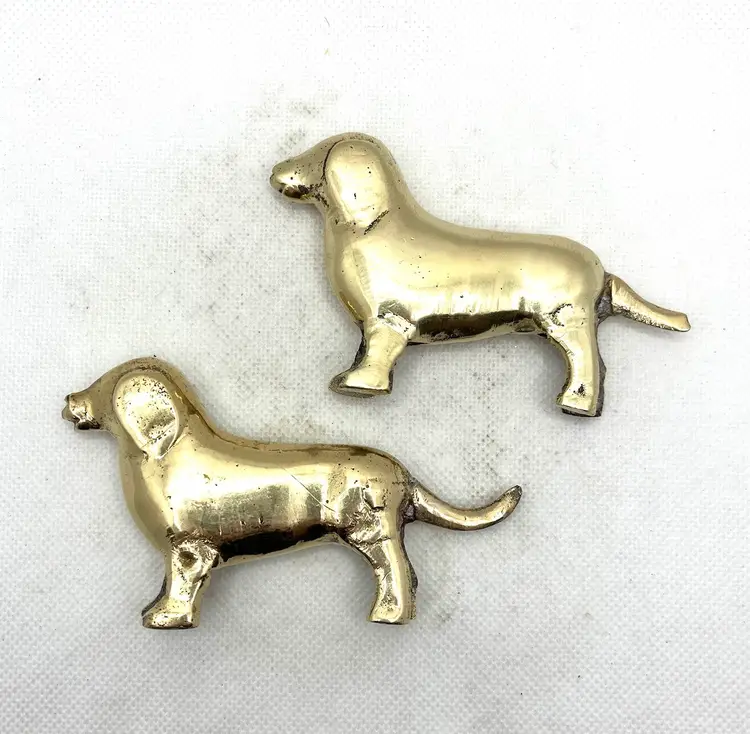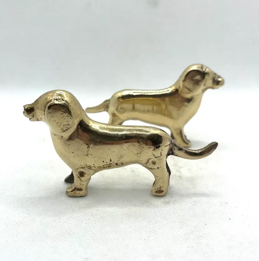 Vintage Brass Puppy Wiener Dog Dachshund Miniature Figurines Pair Of 2. Approximately 3.75” long x 2.25” tall. Minor surface wear and aged patina.