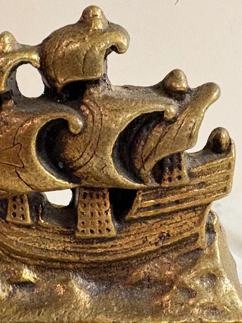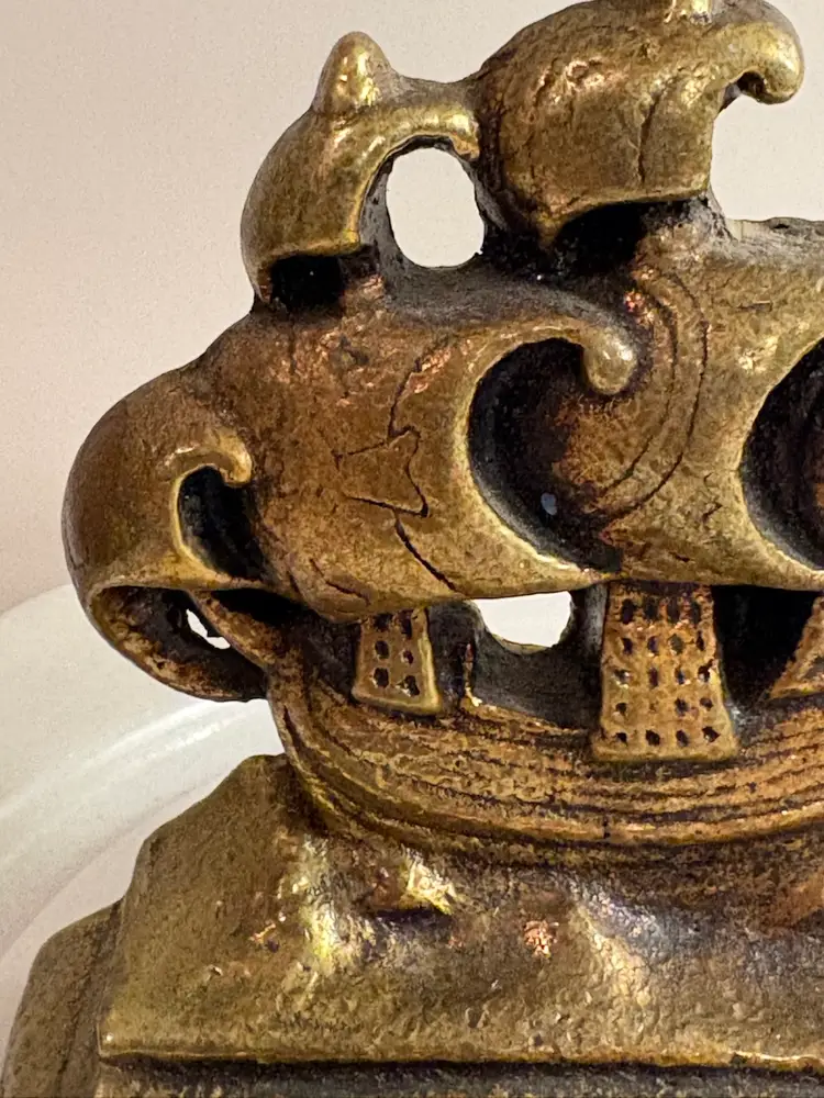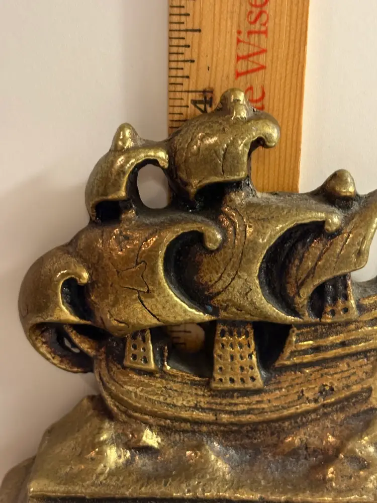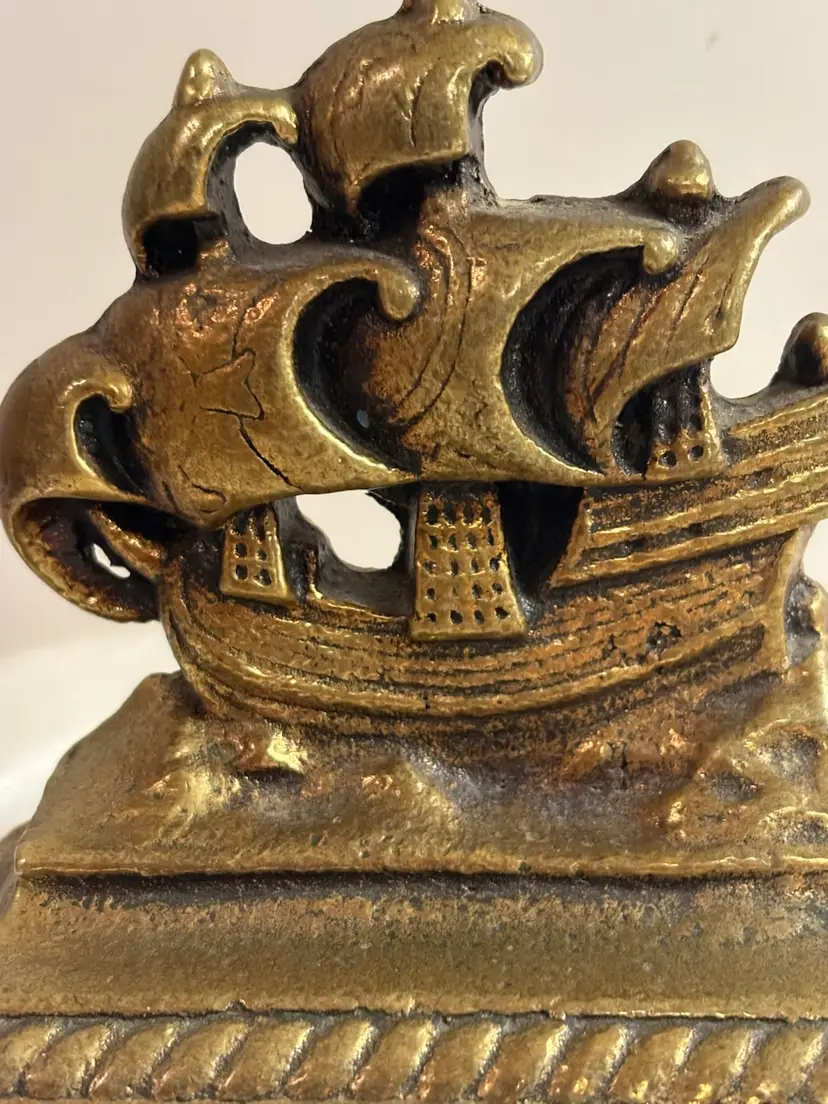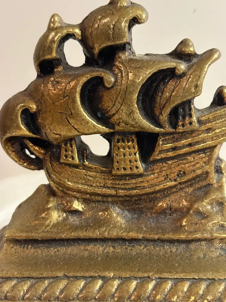The Vintage Brass Rigged Ship Bookend by Decor is a charming nautical piece perfect for coastal decor enthusiasts. Crafted from brass with an antique finish, this unique bookend in the shape of a ship adds a touch of maritime elegance to any bookshelf or desk. Ideal for those who appreciate vintage items and nautical themes, this bookend is both functional and decorative, making it a lovely addition to any collection of decorative collectibles.