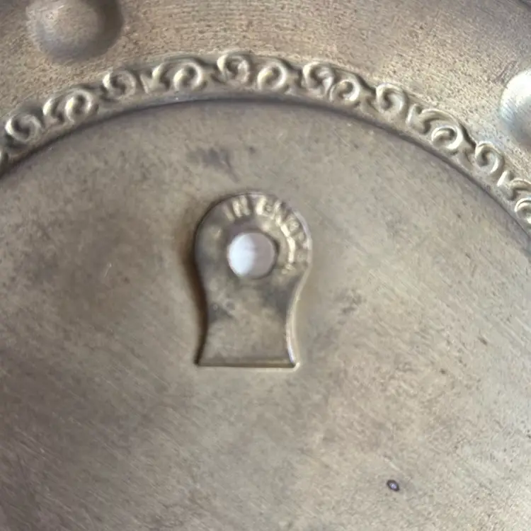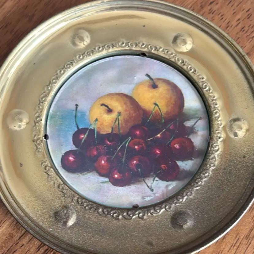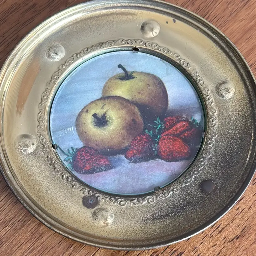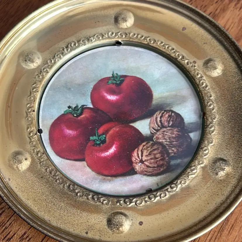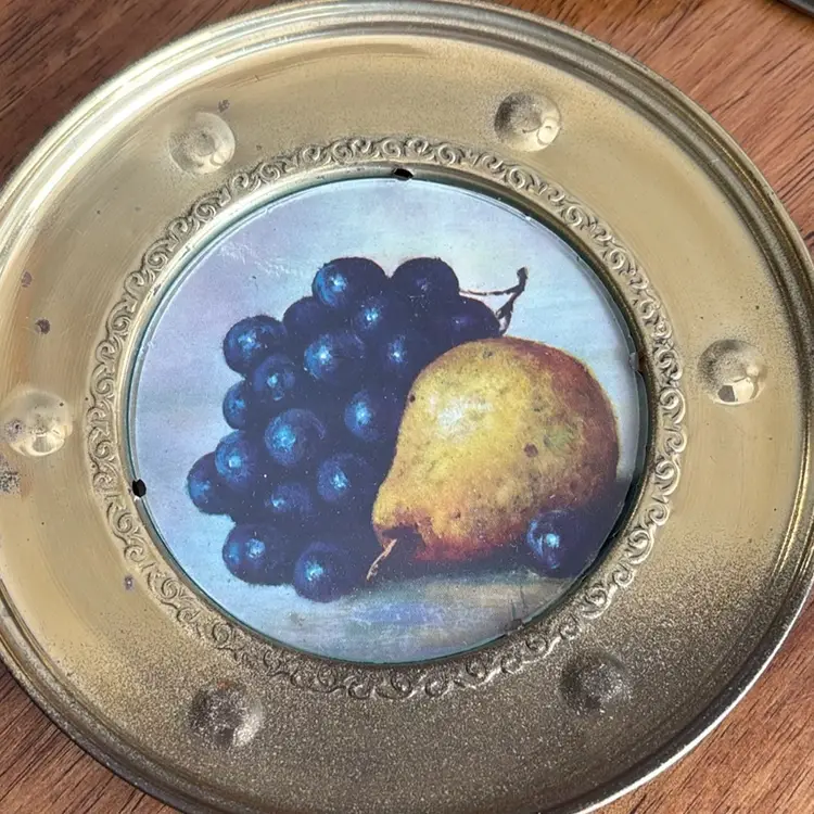 Vintage 5.5” round BRASS, made in England wall plaques with prints of fruit. Moody, Ralph Lauren decor. Set of 4, see photos for subject and condition.
