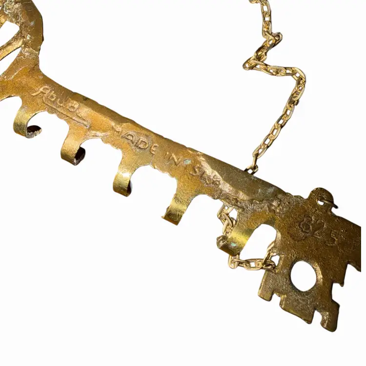 Details: • Approx. length: 7” • Chain length: approx. 12” • Material: Brass with colored enamel accents • Marked: “Made in Israel” (maker mark present but illegible) • Mid-century