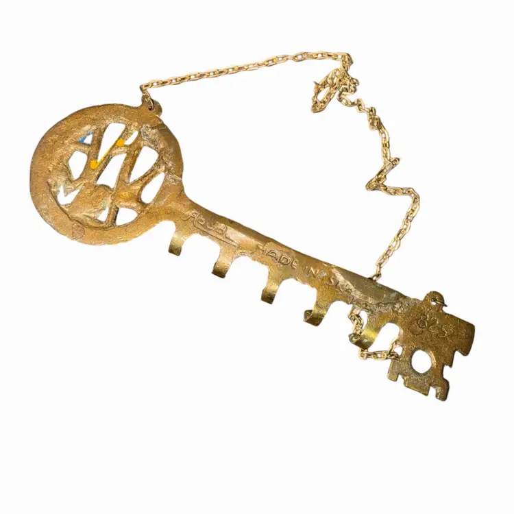 Vintage brass wall hanging in the form of a decorative key featuring the word “Shalom” in colorful enamel-style lettering.