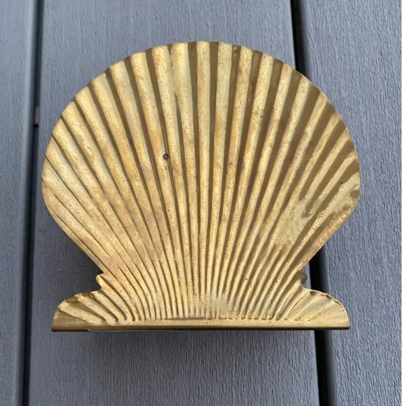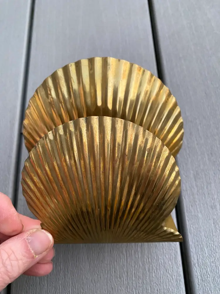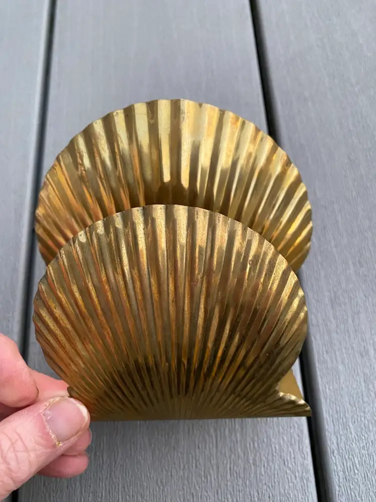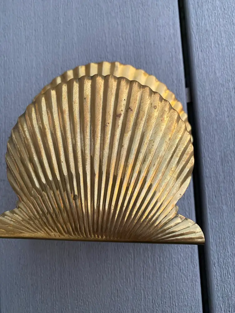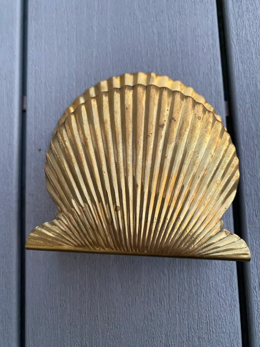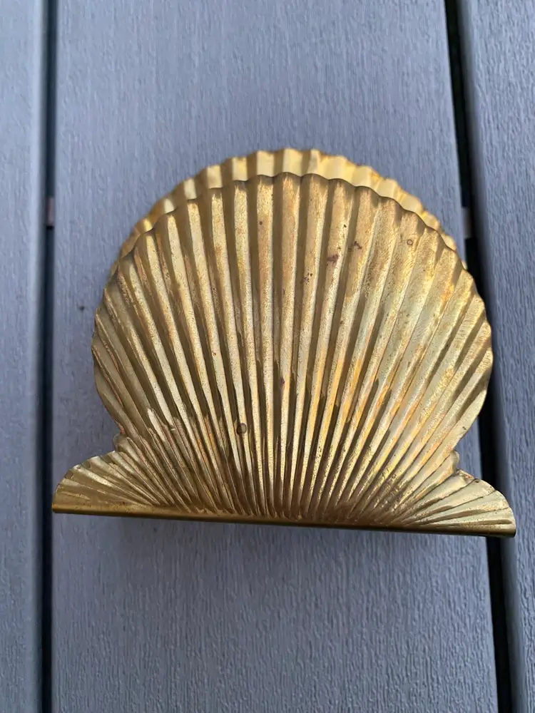This is a very cool VINTAGE BRASS SHELL SHAPED NAPKIN HOLDER OR MAIL HOLDER. It is in great vintage condition with a nice patina and a classic shell pattern. This would be lovely on the dining table holding napkins or on a counter or entry way as a mail holder.