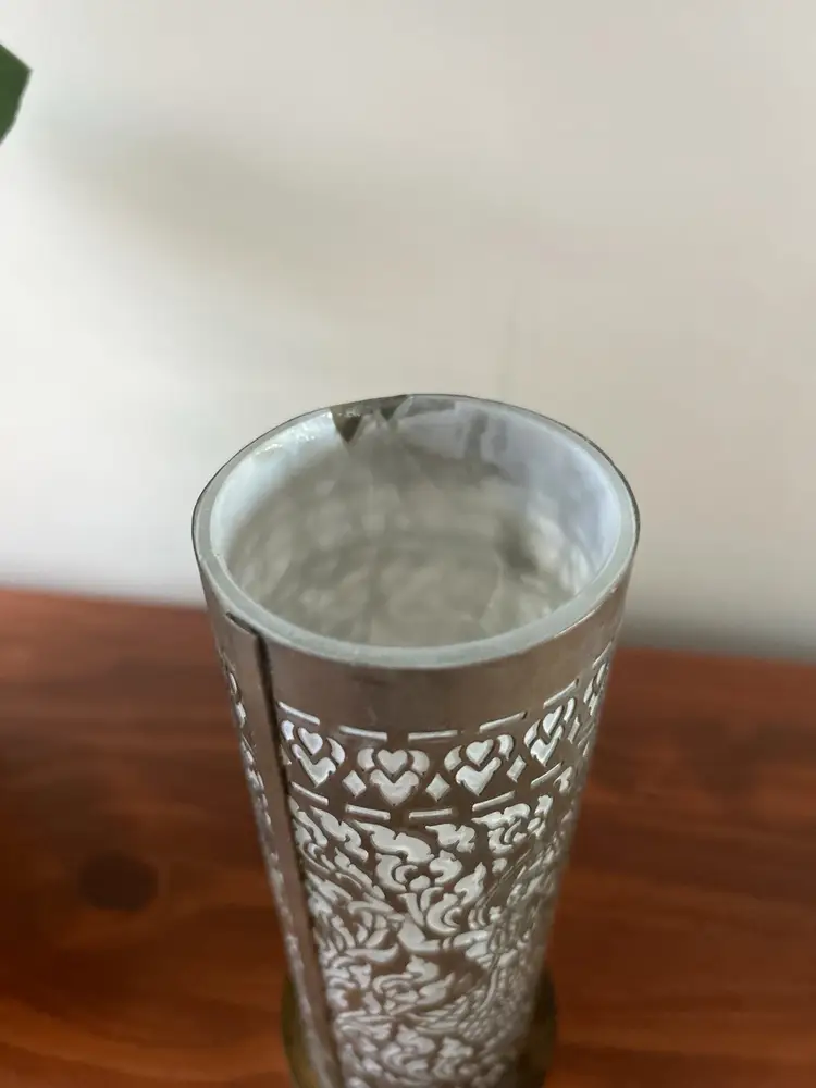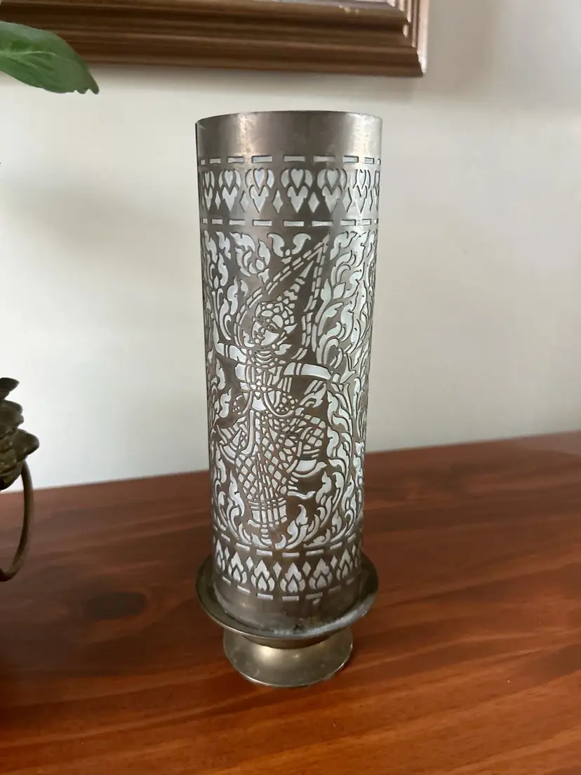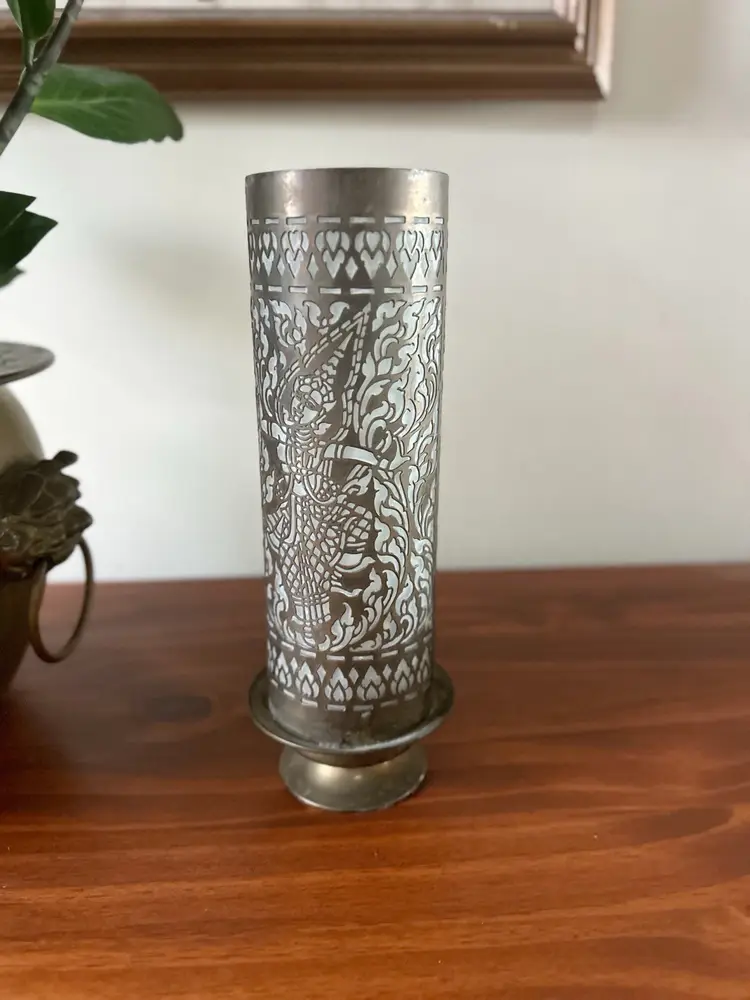 Vintage brass Thai candlestick holder. Measures 9 inches tall. Damage at rim (see photos).