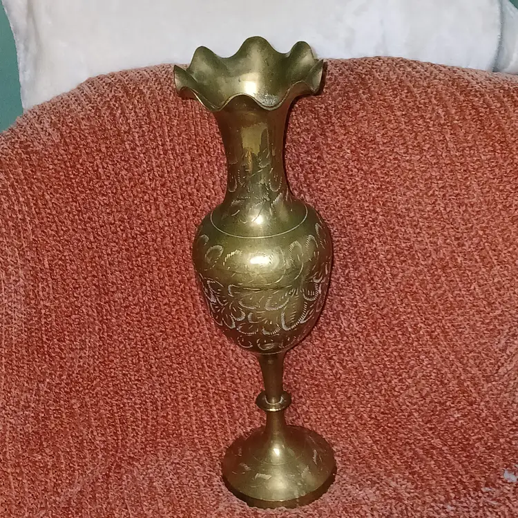 Etched Brass vase from India features intricately etched design and a Ruffled rim stands 131/3" Tall.