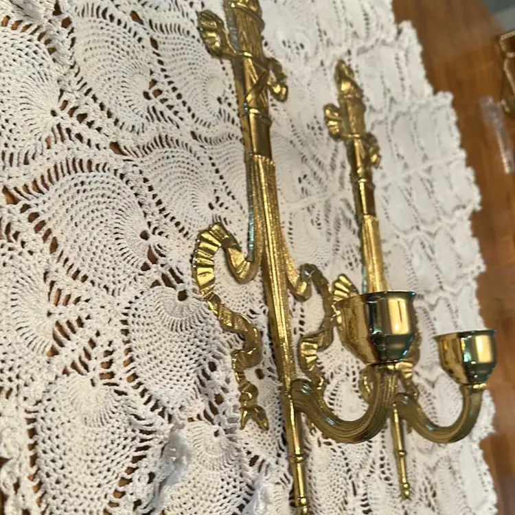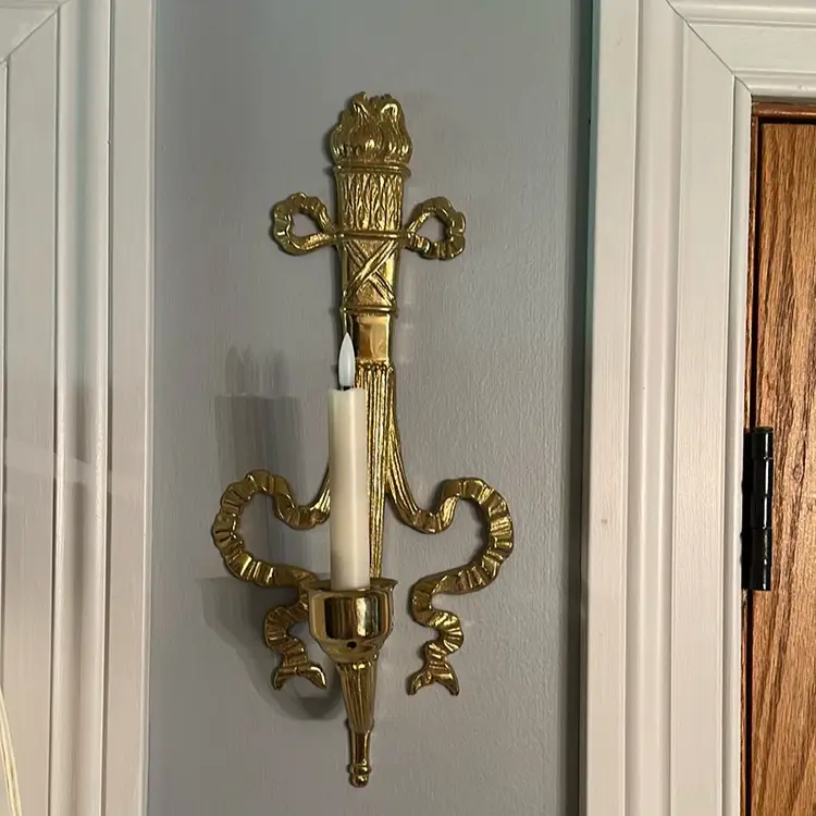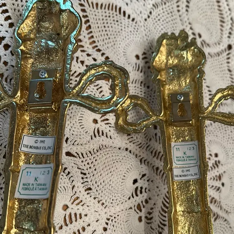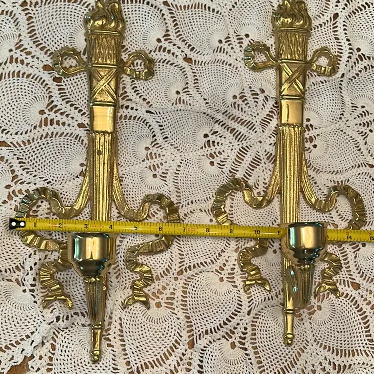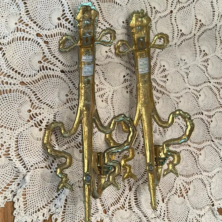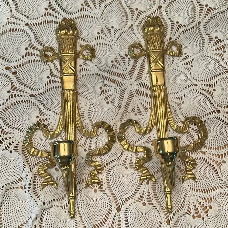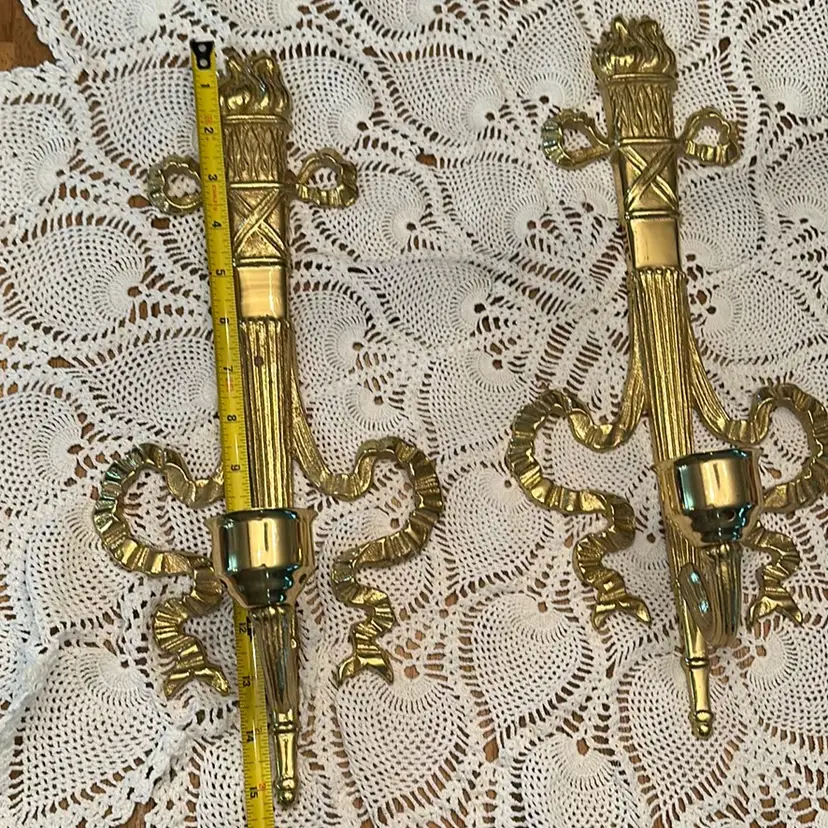 Vintage brass wall sconce Pair, often referred to as a "torch and ribbon" style candle holder. These were made by The Bombay Company, dated 1992. Elevate your home decor with these stunning vintage Bombay brass wall sconces. The intricate carvings and antique brass finish add a touch of Hollywood Regency style to any room. They are 15” long, 6 1/2” wide and stick out 4” from the wall. They weigh approximately 1 1/2 pounds each.