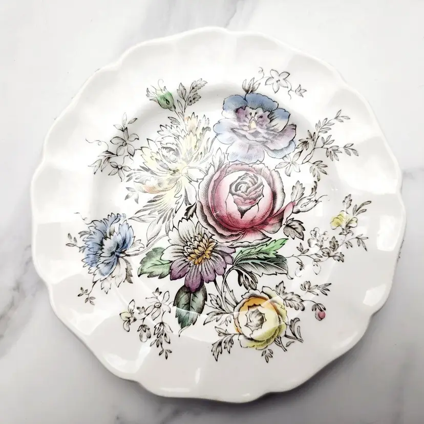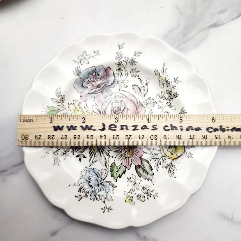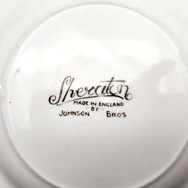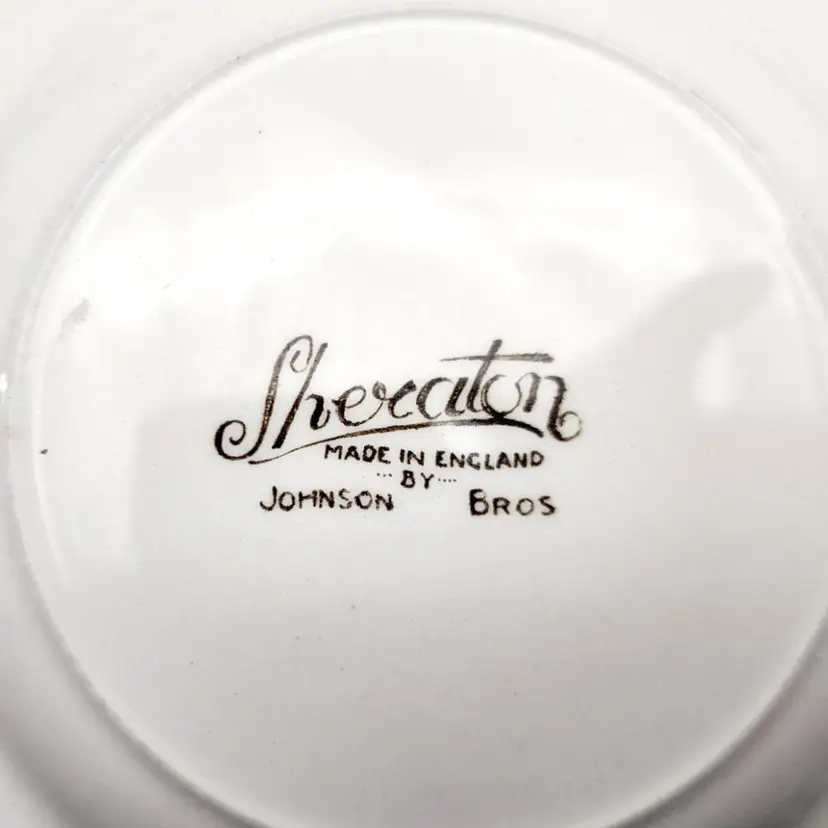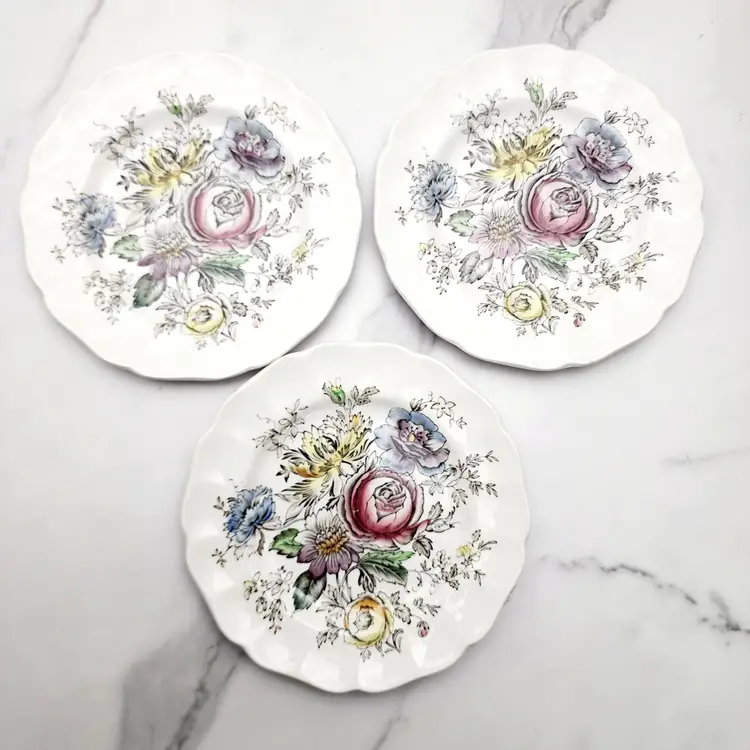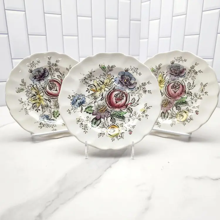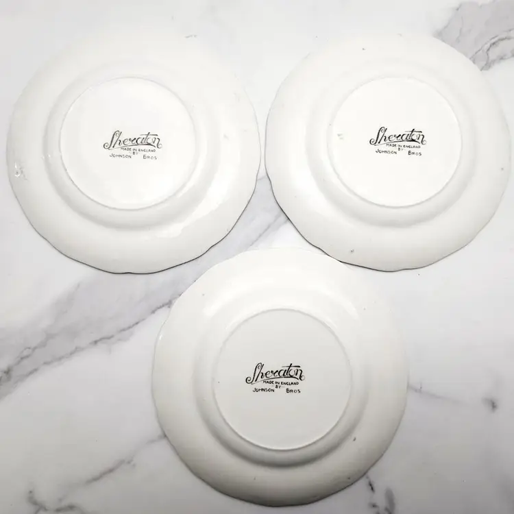 Set of 3 Vintage Bread & Butter plates by Johnson Brothers. Very sweet Sheraton Pattern Multicolor Floral Center, No Trim. Pattern: Sheraton (Floral Center) Made by Johnson Brothers, England Condition: USED, Crazing on each plate. Hard to pick up in photos. SOLD AS IS NO RETURNS Priced with S&H