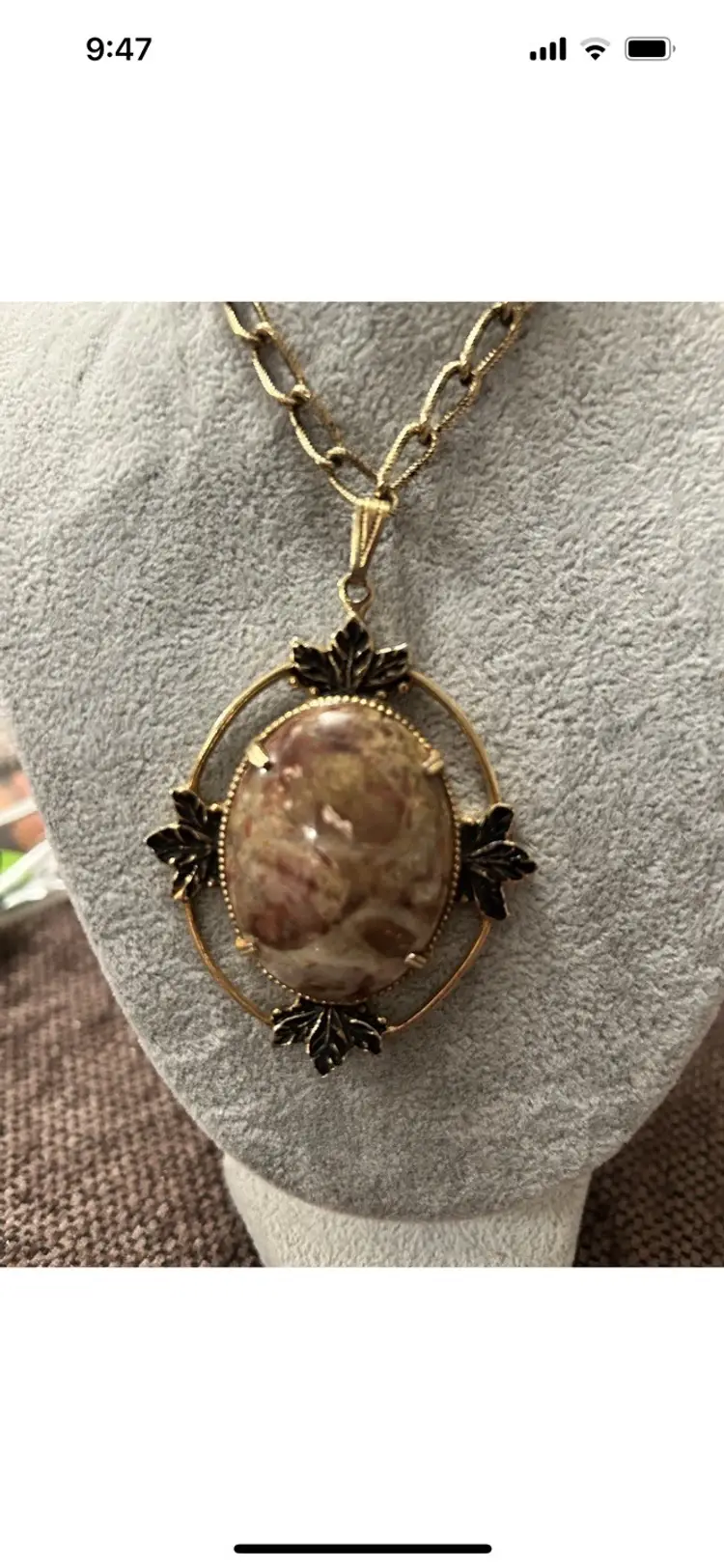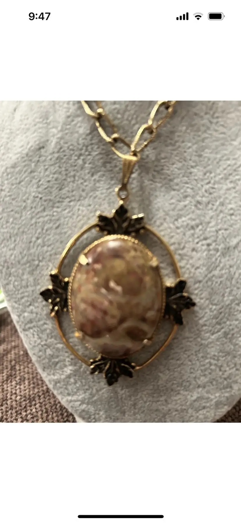 This Vintage Brecciated Jasper Pendant Necklace features a natural, multicolored Jasper stone in an oval shape. The pendant is handmade and designated as 'Vintage', with beige & pink colors that make it perfect for any occasion. This original piece of fashion jewelry is one-of-a-kind piece, making it a unique and stylish accessory for any outfit.
