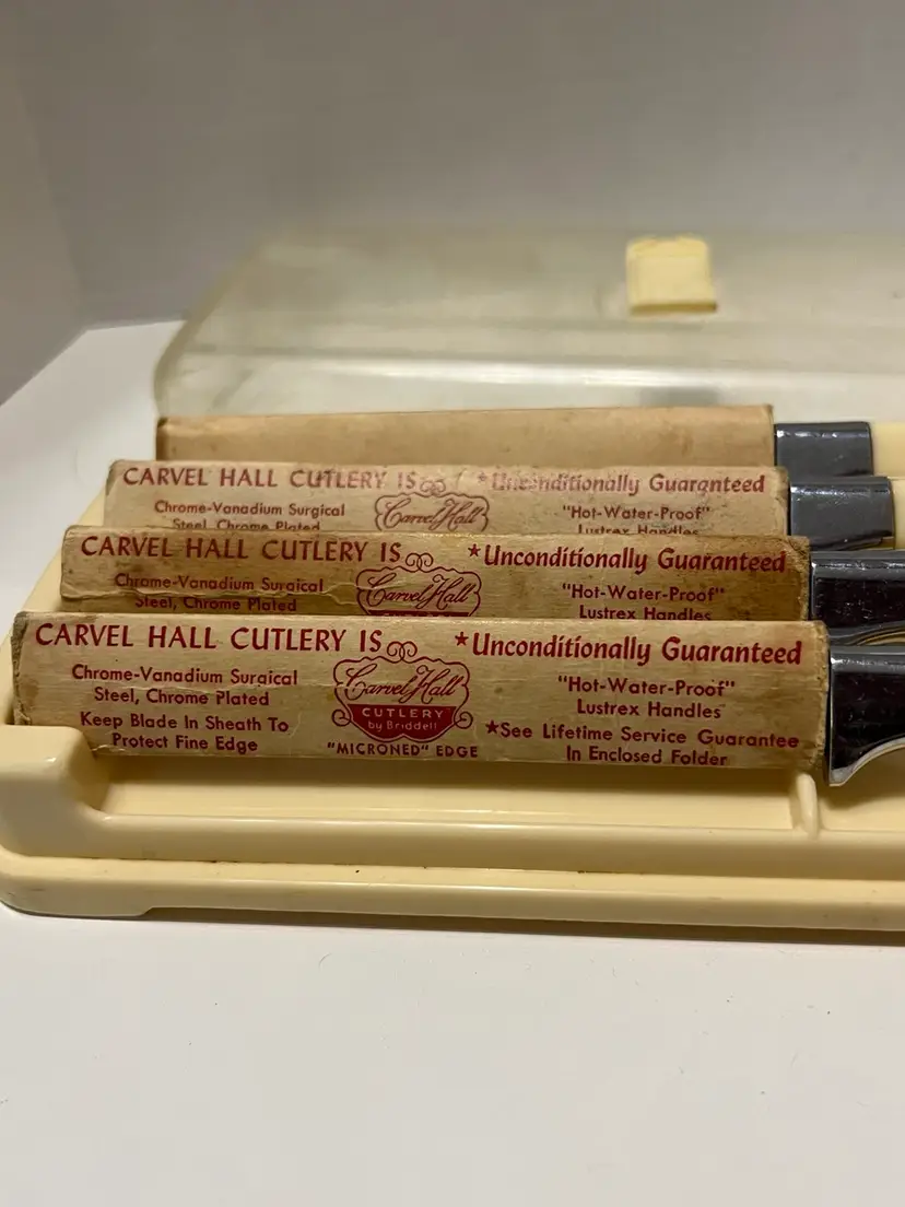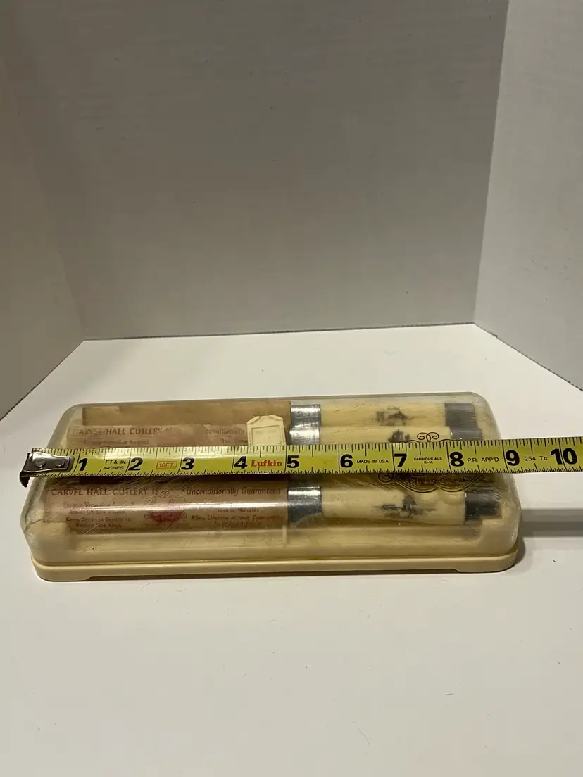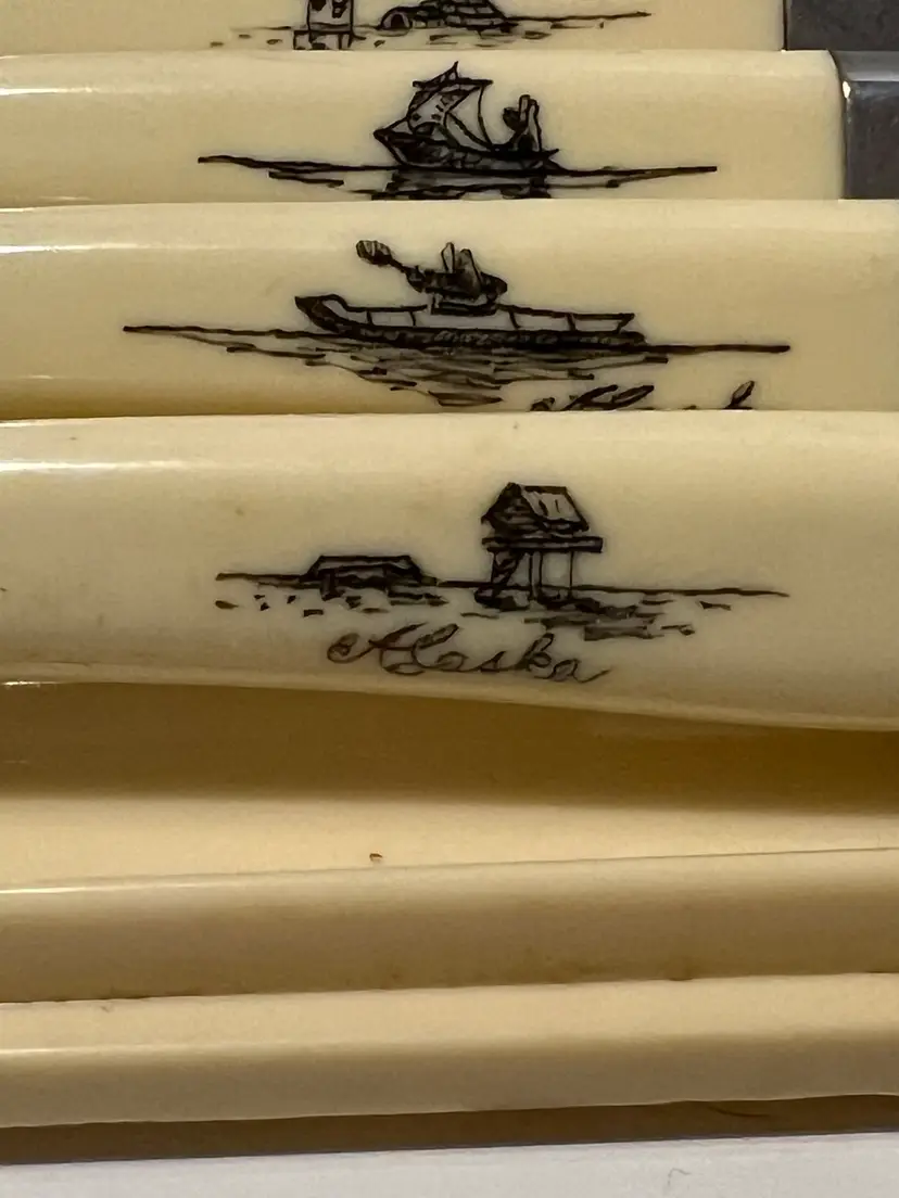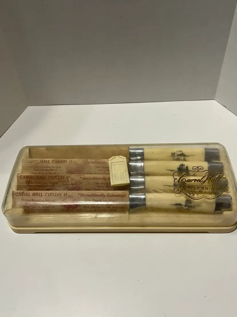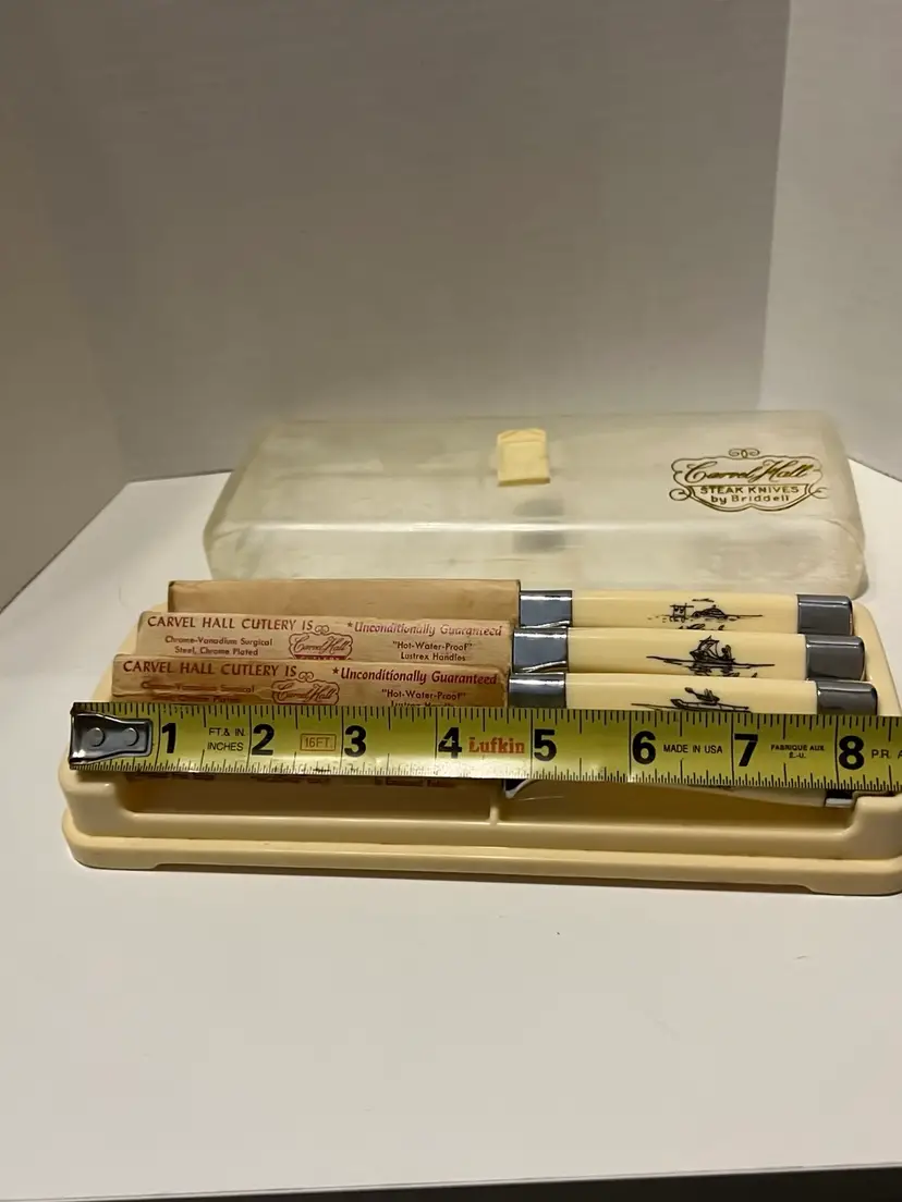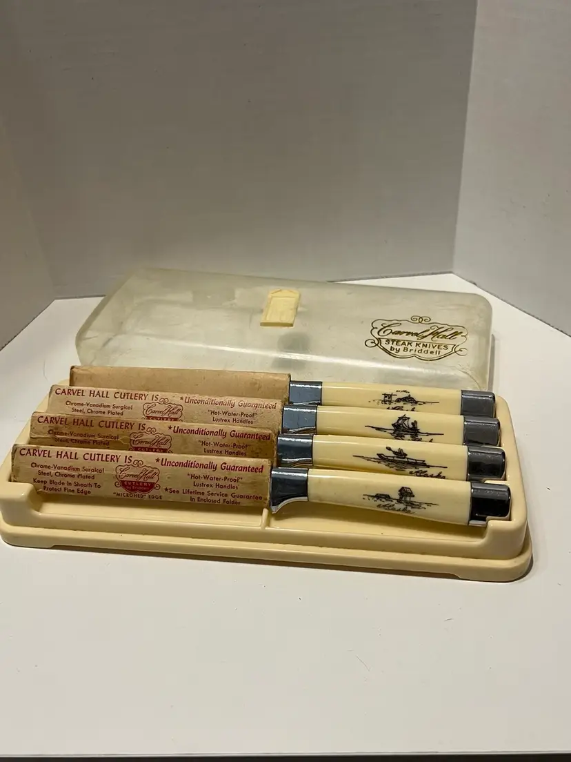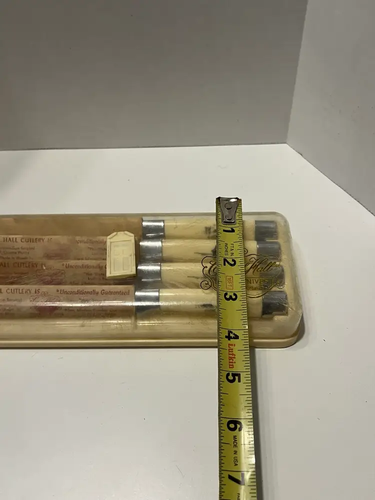 These vintage Briddell Cavnell Hall knives are new old stock and have beautifully etched Alaskan scenes on them. I have not been able to find another set of 4 like them. They also come in their original case. The exact measurements are shown in the accompanying photos.