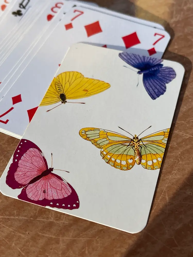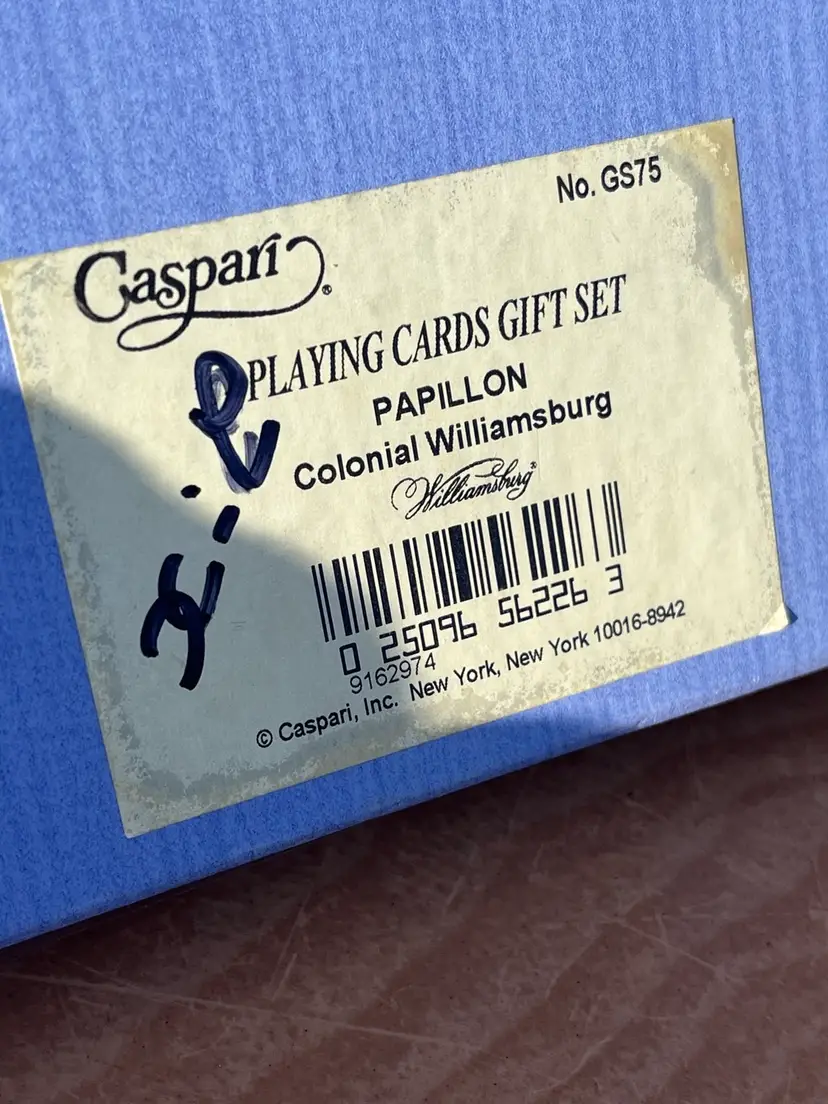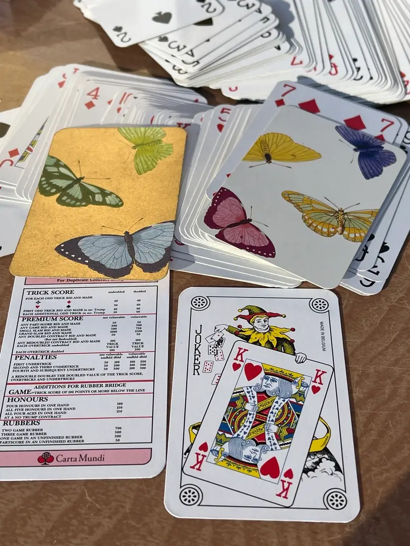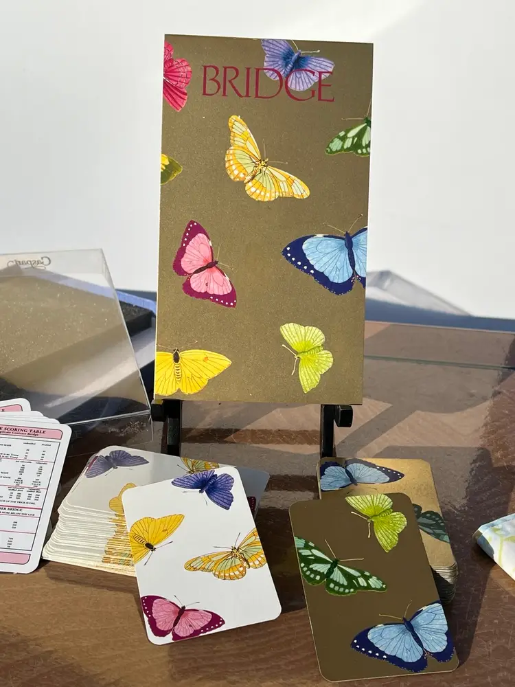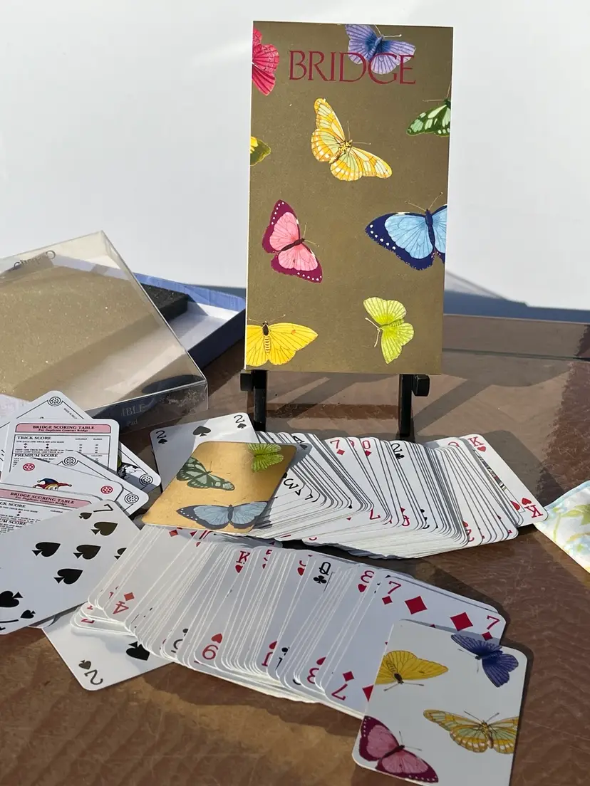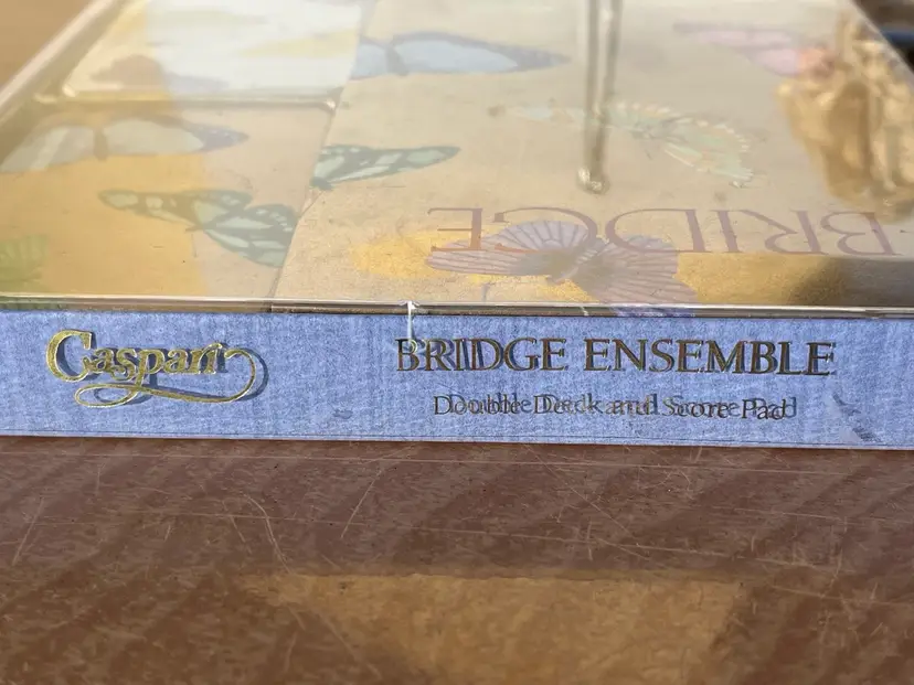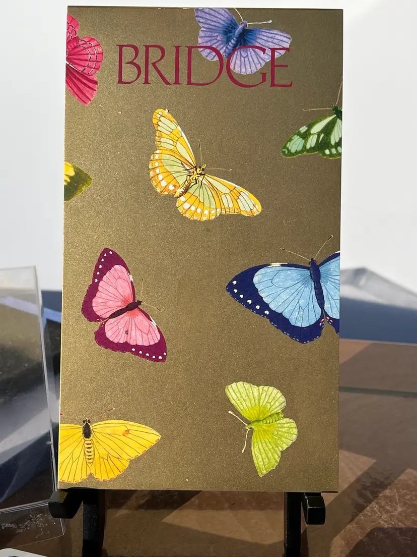 This bridge gift set is in its original box. The box is a bit worn with marker and other wear from use flaws. You will receive two decks of 52 cards. One has a metallic gold finish and the other in a white background. The directions and joker cards are present. Both decks are complete. The golden bridge score pad has some smears on the front. Inside, you will find a pad with sheets to keep score in a bridge game. The art shines bright with unique butterflies. Great set. #bridge #butterflies #playingcards #metallic