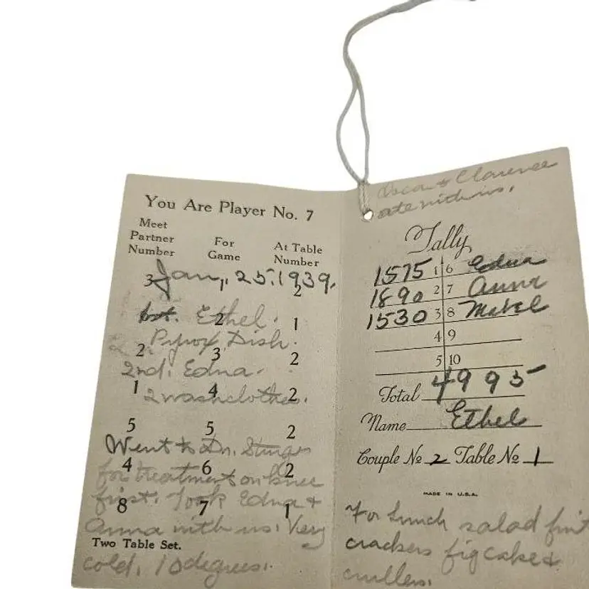 Unique vintage game scorecard. Features handwritten scores and a blue tassel.