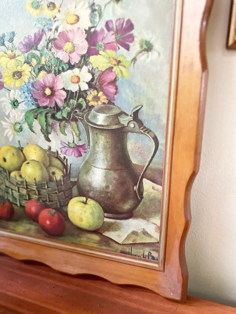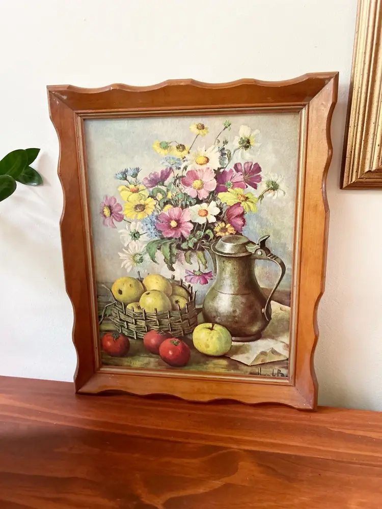 Vintage framed floral still life wall art. Minor imperfections on frame can be seen in photos. Frame measures 13.5 x 17 inches.