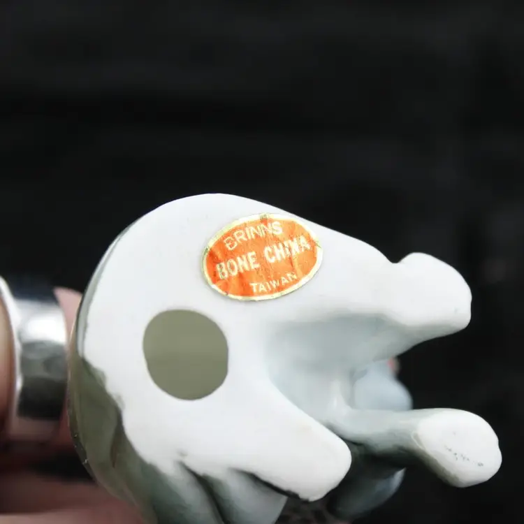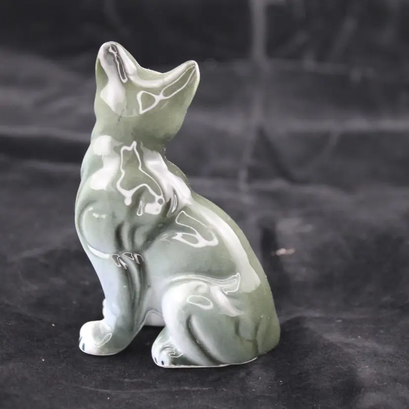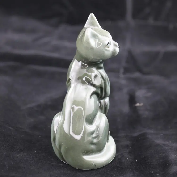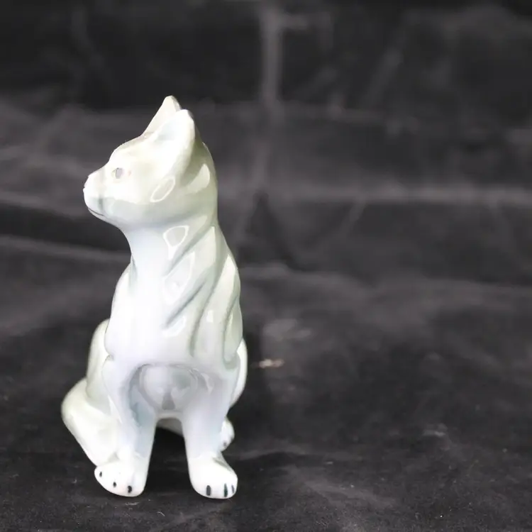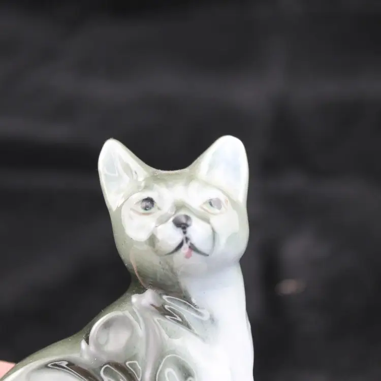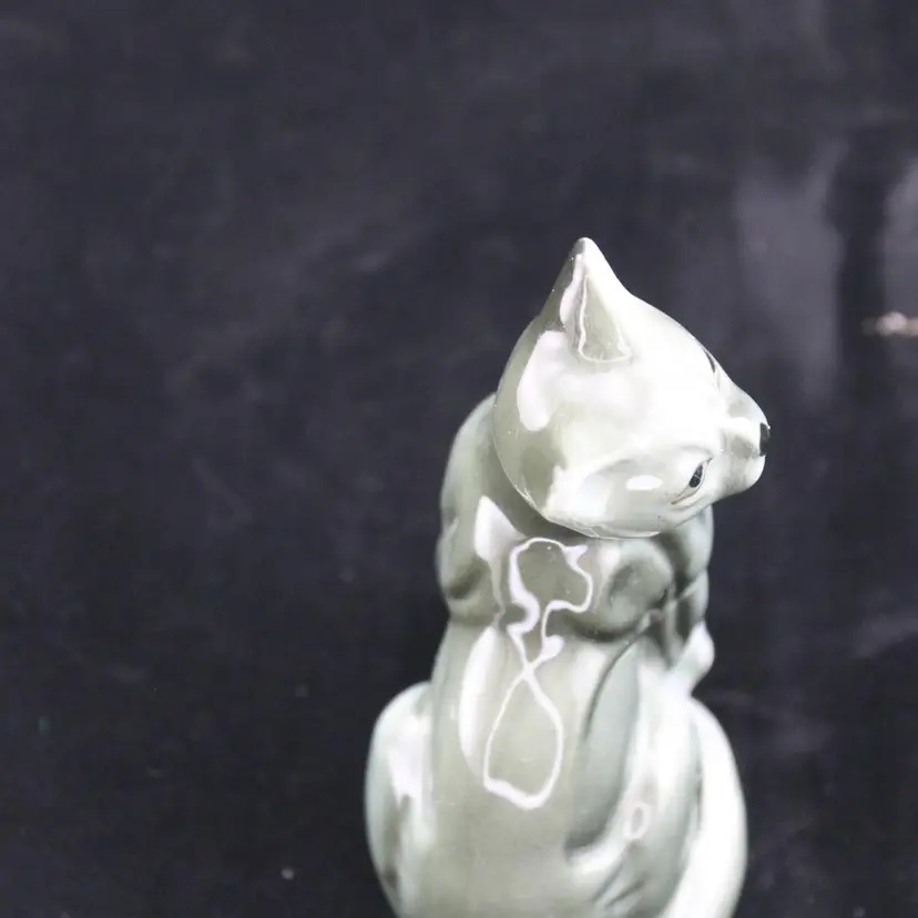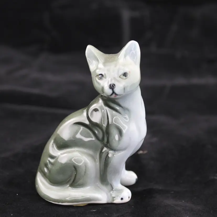 This is a vintage Brinns Bone China Gray Cat figurine. There are no chips or cracks. The original marker's sticker is still on the bottom. It measures approx 3 3/4" tall, 2 1/4" side to side and 1 1/2" front to back.