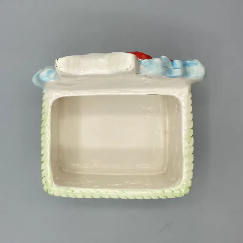 This planter is in good overall condition. There is some cold paint loss on the front and a small chip on the one side as well as some small chips on the back, all clearly visible in the pictures. This planter measures approximately 5" tall x 4" deep x 5" across and the actual basket planter part measures approximately 4 1/4" x 3 1/2".