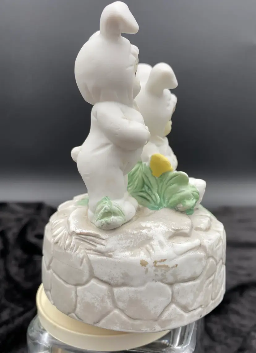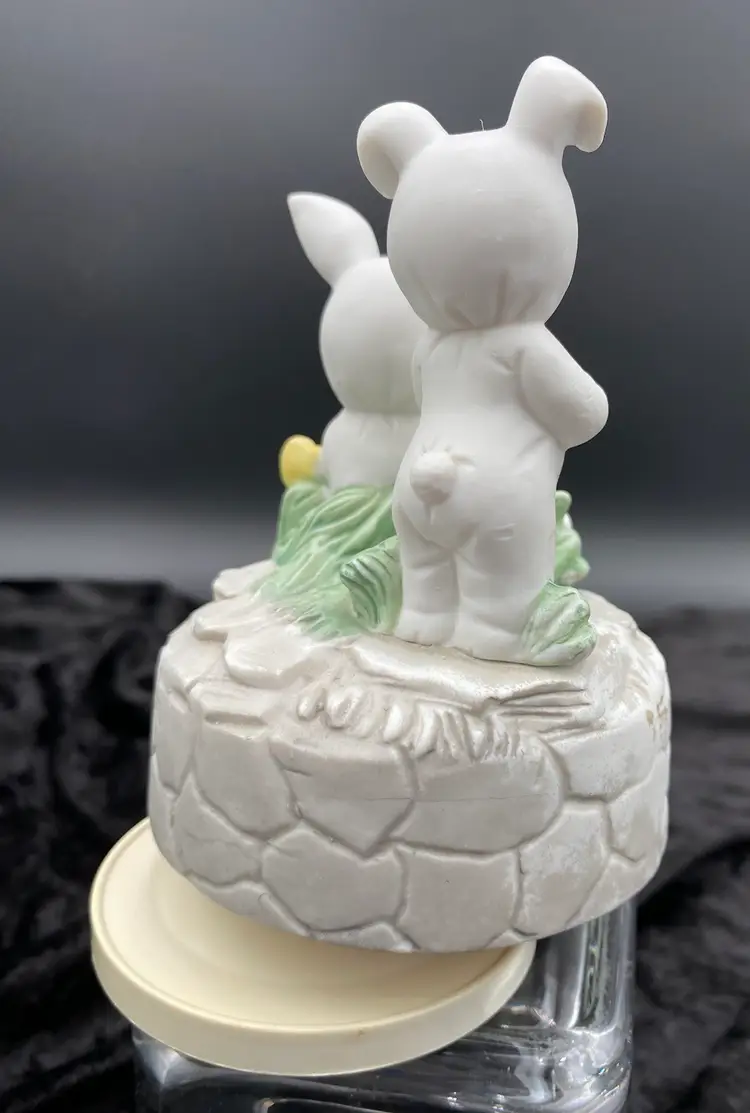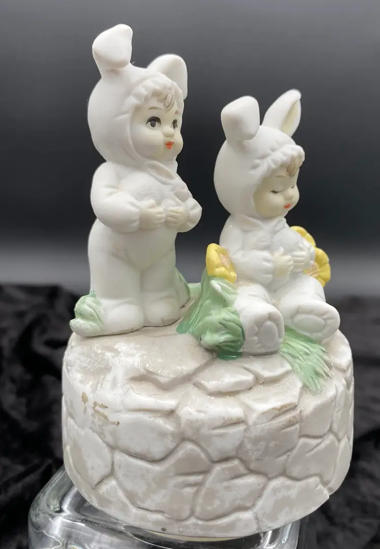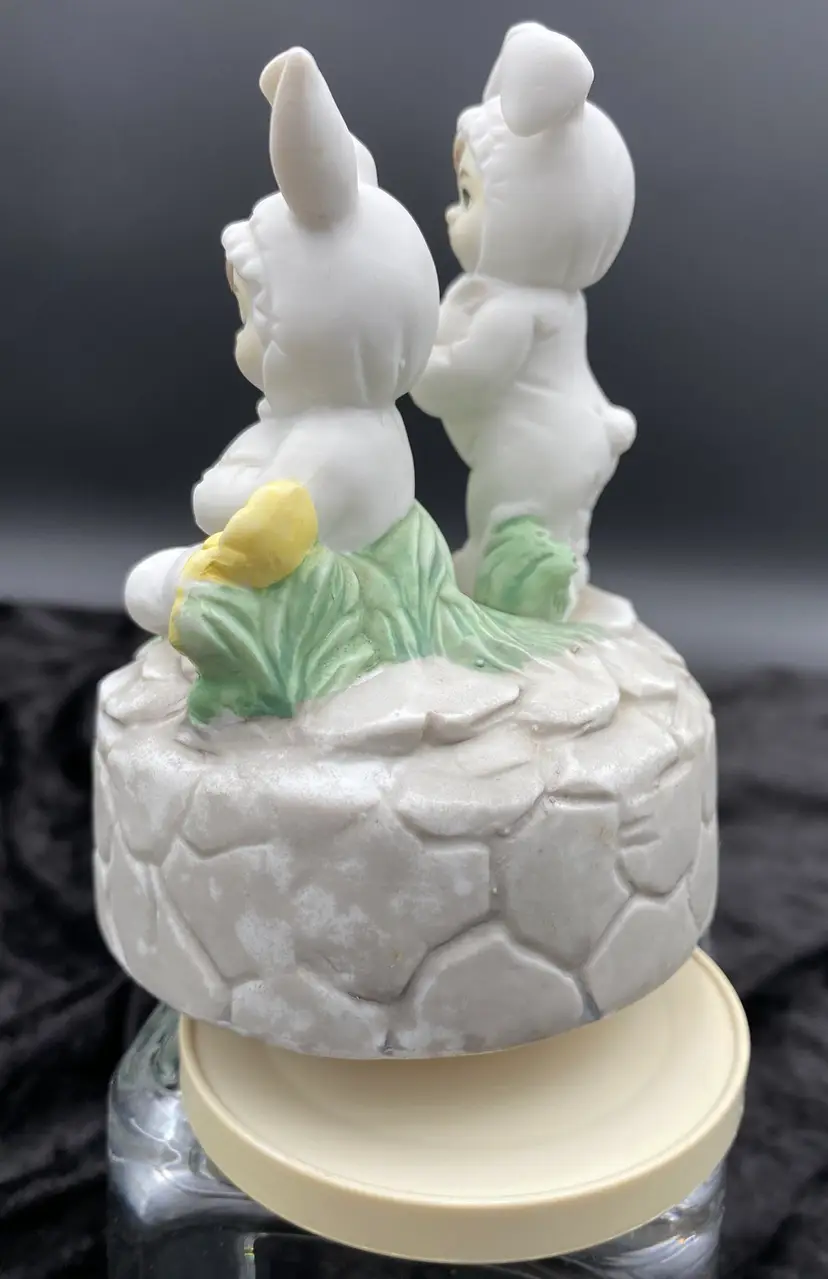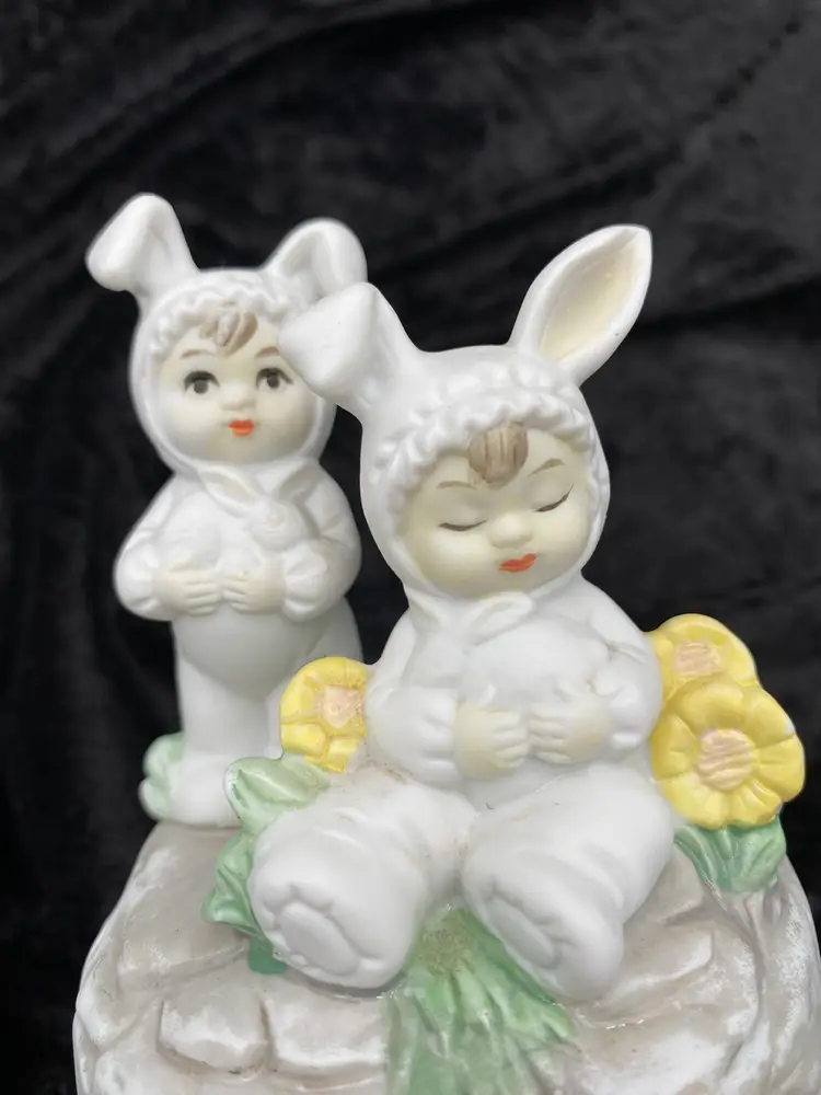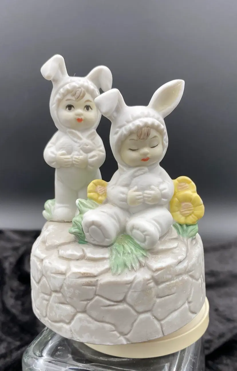 This vintage Brinn's (Pittsburgh, Pennsylvania) Porcelain Musical figurine is a charming addition to any collection. It features adorable children dressed in bunny suits each holding a white bunny, surrounded by yellow flowers and greenery. The figurine plays the classic tune "Easter Parade" by Irving Berlin via a wind-up mechanism. Measuring 5.25 inches in height and 3.8 inches in width, it is the perfect size for display or as a gift. Made in Taiwan and from the time period of the 1970s, this collectible is a nice addition to a child's room or as a Easter decoration.