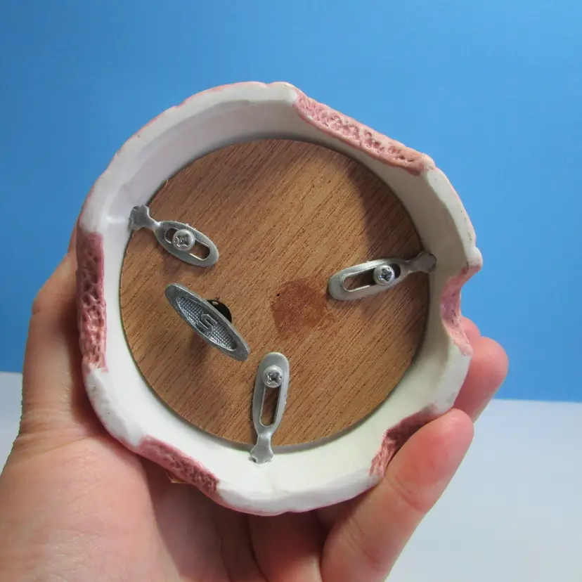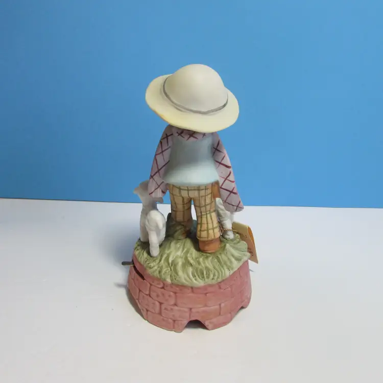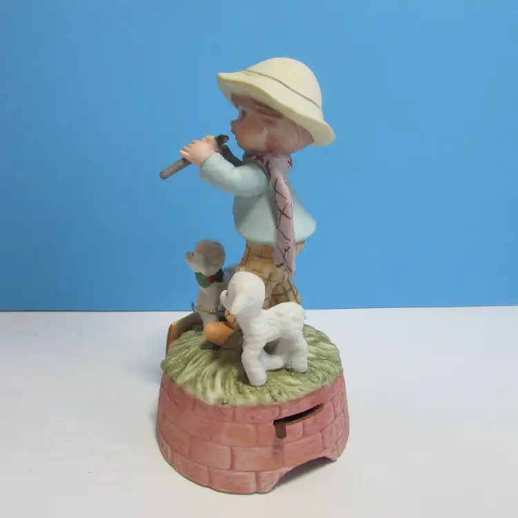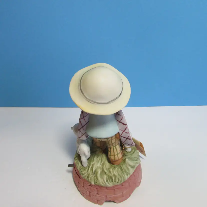 This adorable piece is in good condition, it has been tested and works, it just plays music slowly. It plays "Mary Had A Little Lamb" and is about 6 1/2" x 3 3/4" round. This is shipped from a smoke free home. Thanks for looking!