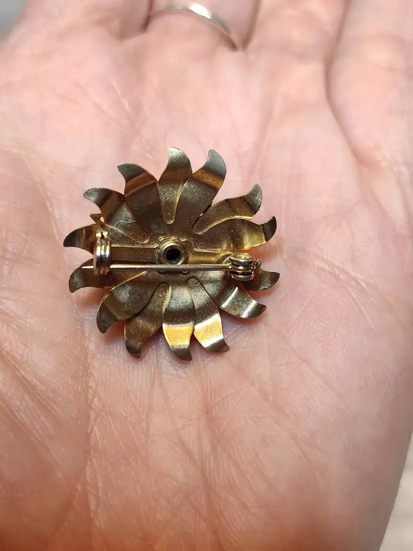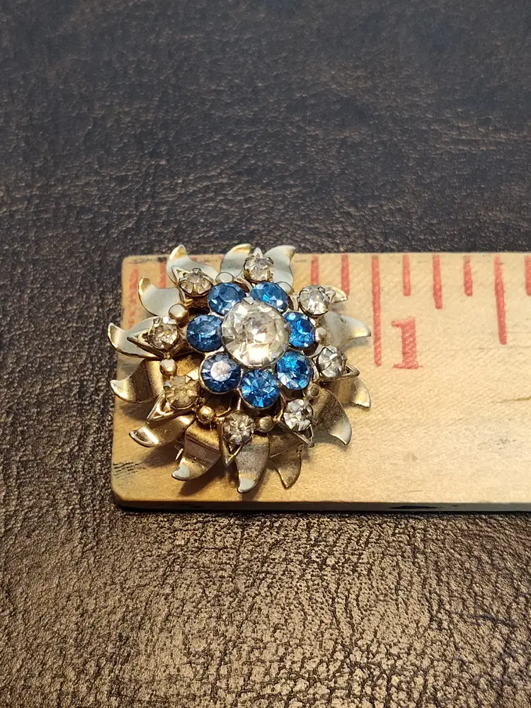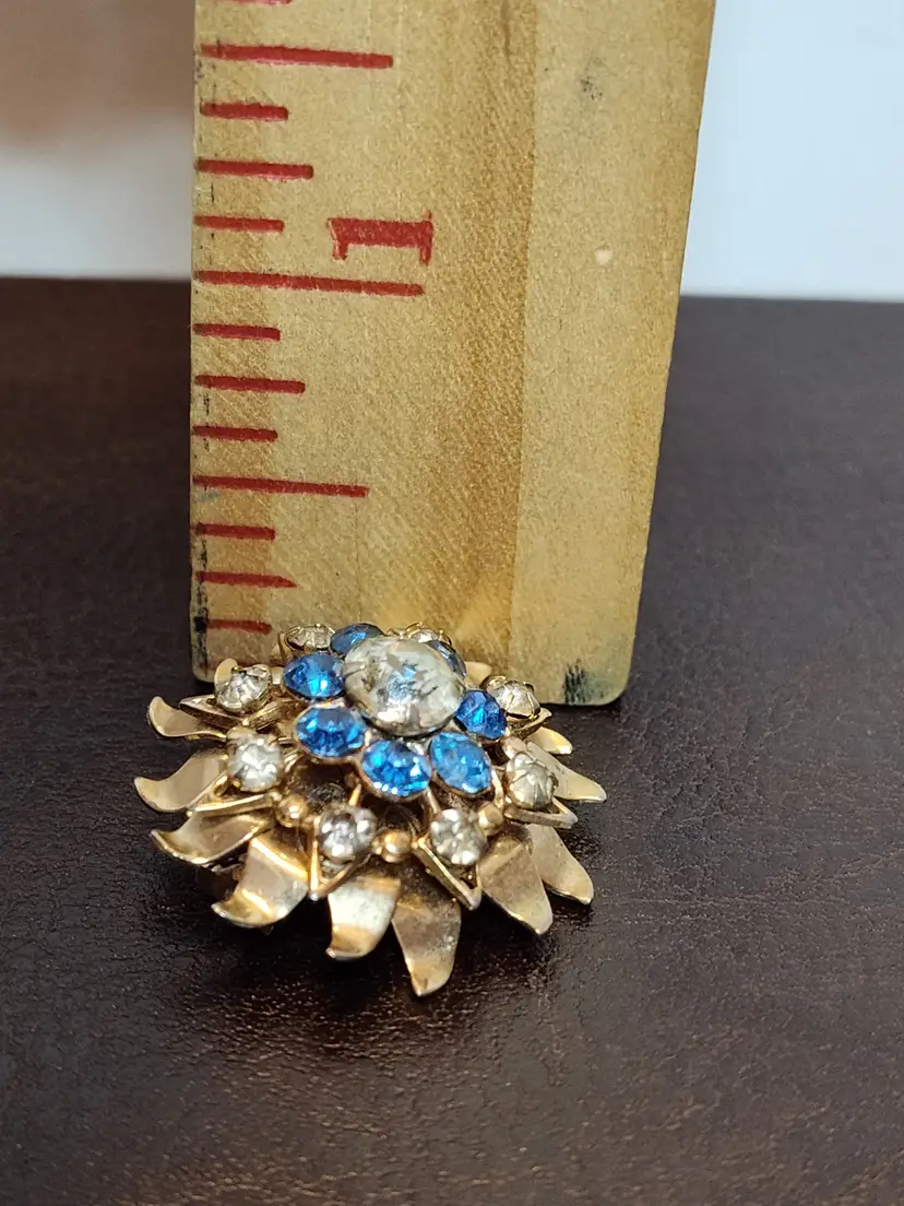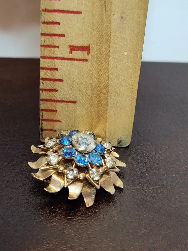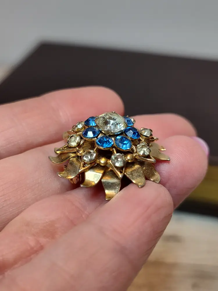 Gold tone layered flower brooch with clear and blue rhinestones.