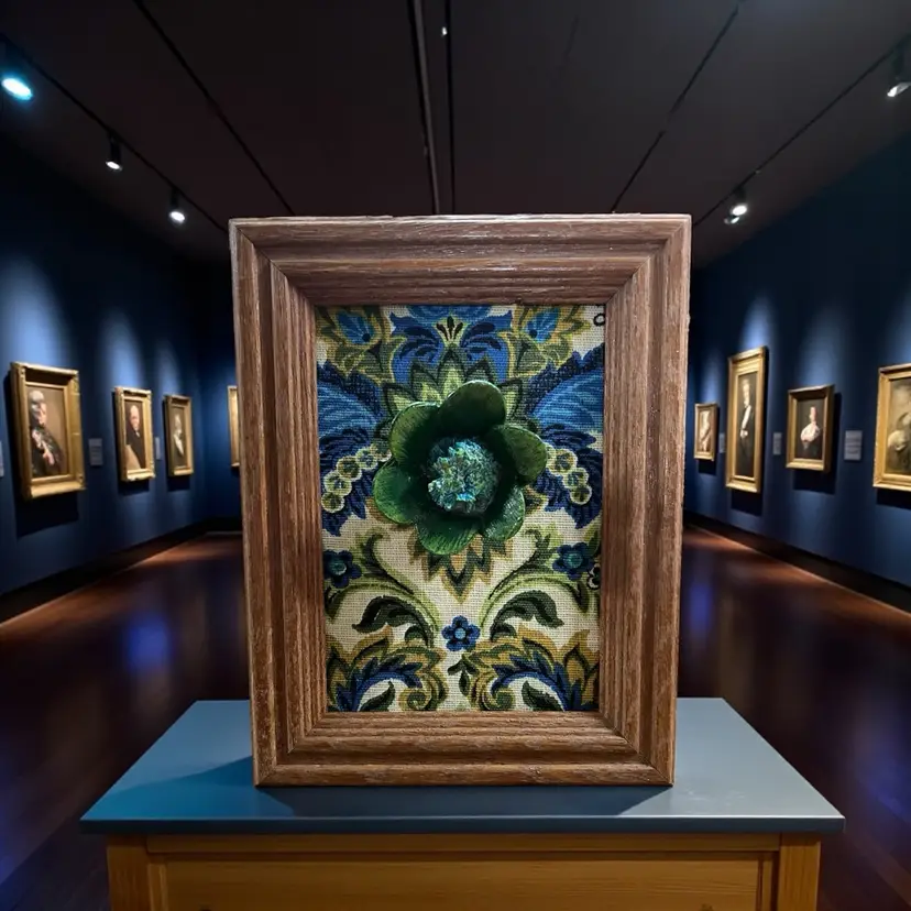 Made by Deadlyroseoriginals 9 x 7“ wood frame vintage handmade wooden flower brooch on vintage textile in frame brooch will easily detach for wearability and can be pinned back on the material for display