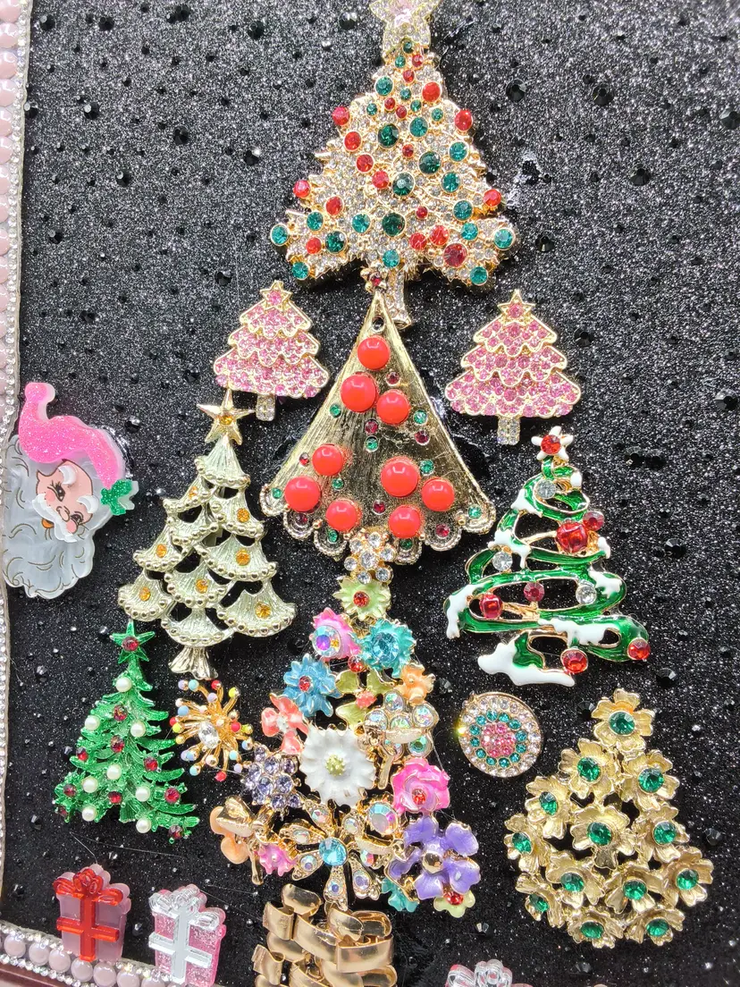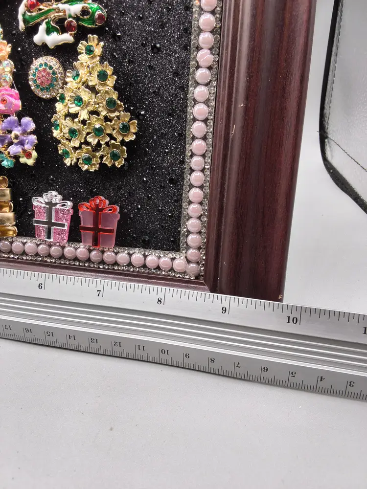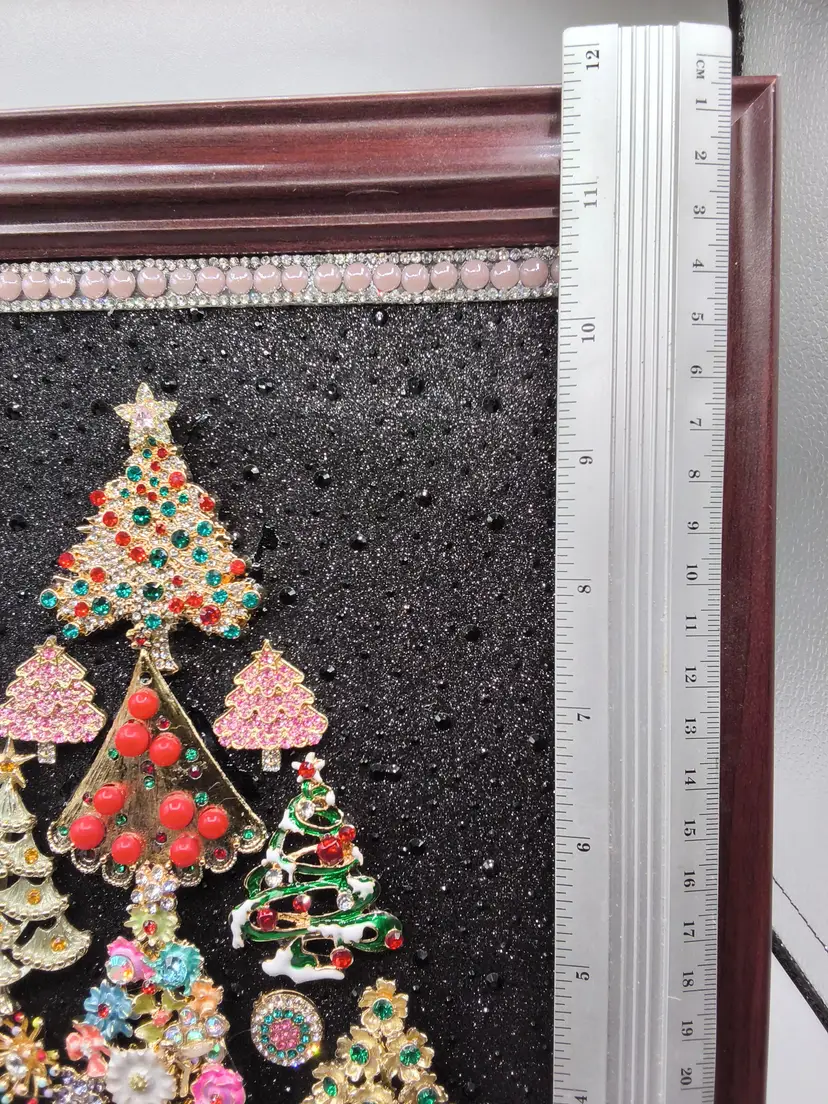 This unique piece features a collection of vintage brooches artfully arranged to form a festive Christmas tree. Set against a sparkling black background and framed in a rich wooden frame, it's a perfect holiday decoration or gift.