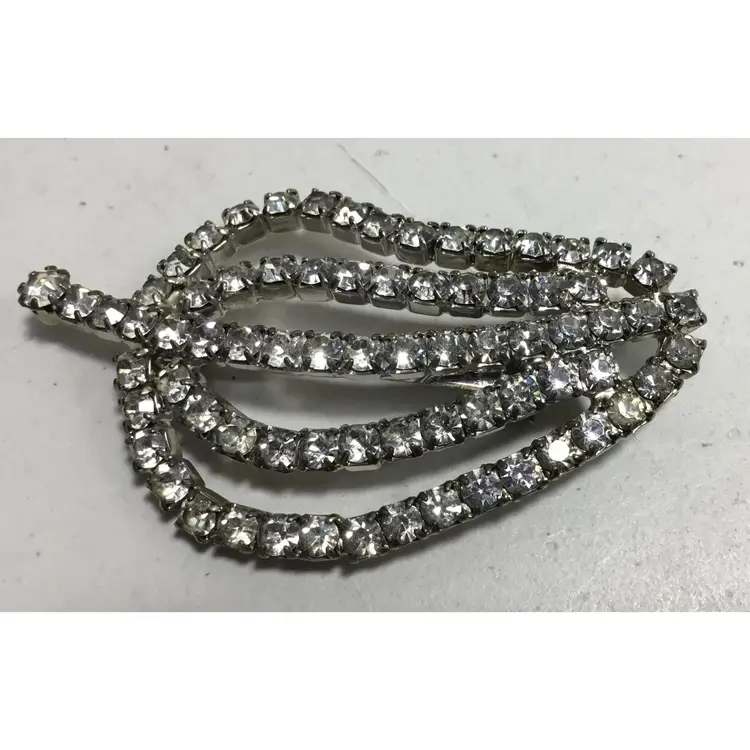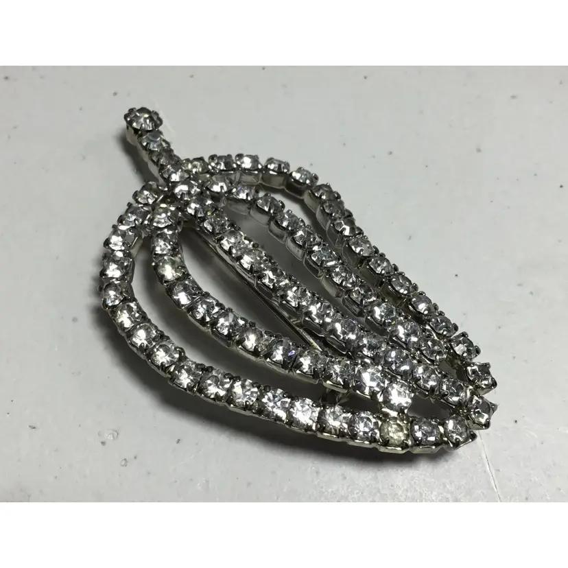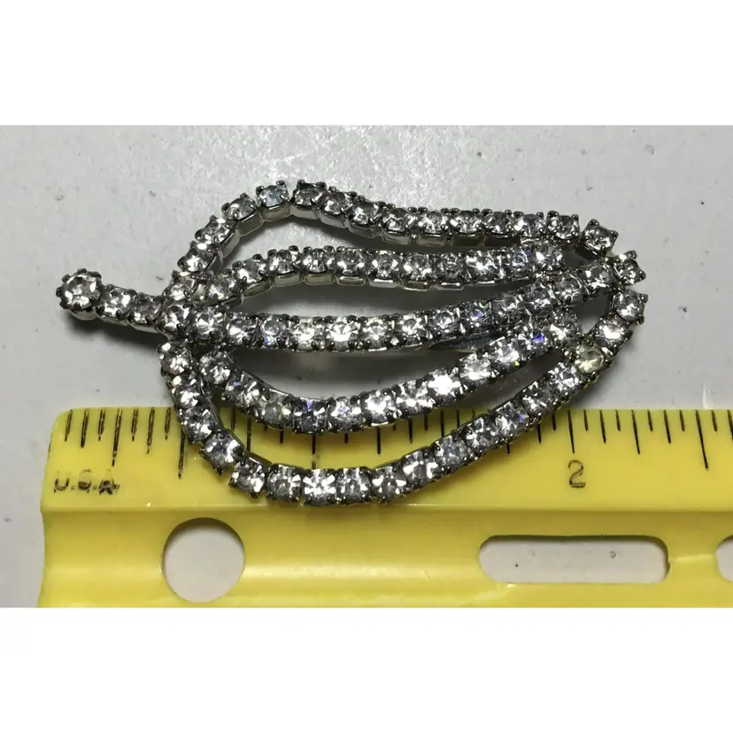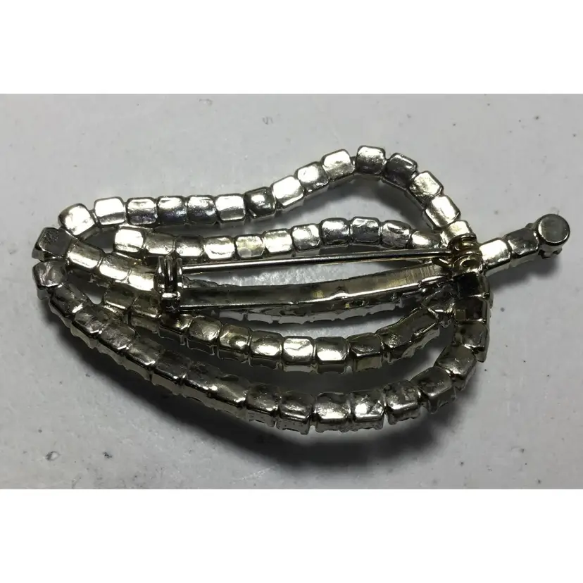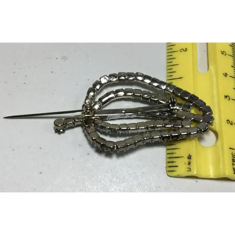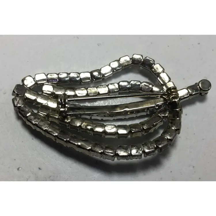 2.25 inches long by 1.5 inches wide, round, prong set, AB crystals in silvertone, chained cups. Makes a leaf shape or pepper shape, with short stem. Pin has safety clasp. Very good condition, some color wear on back, two stones slightly yellowed (see all photos)