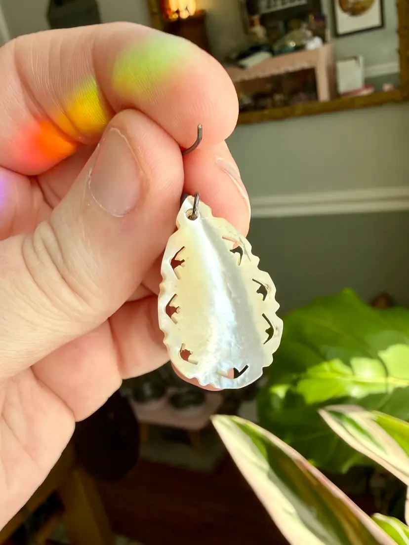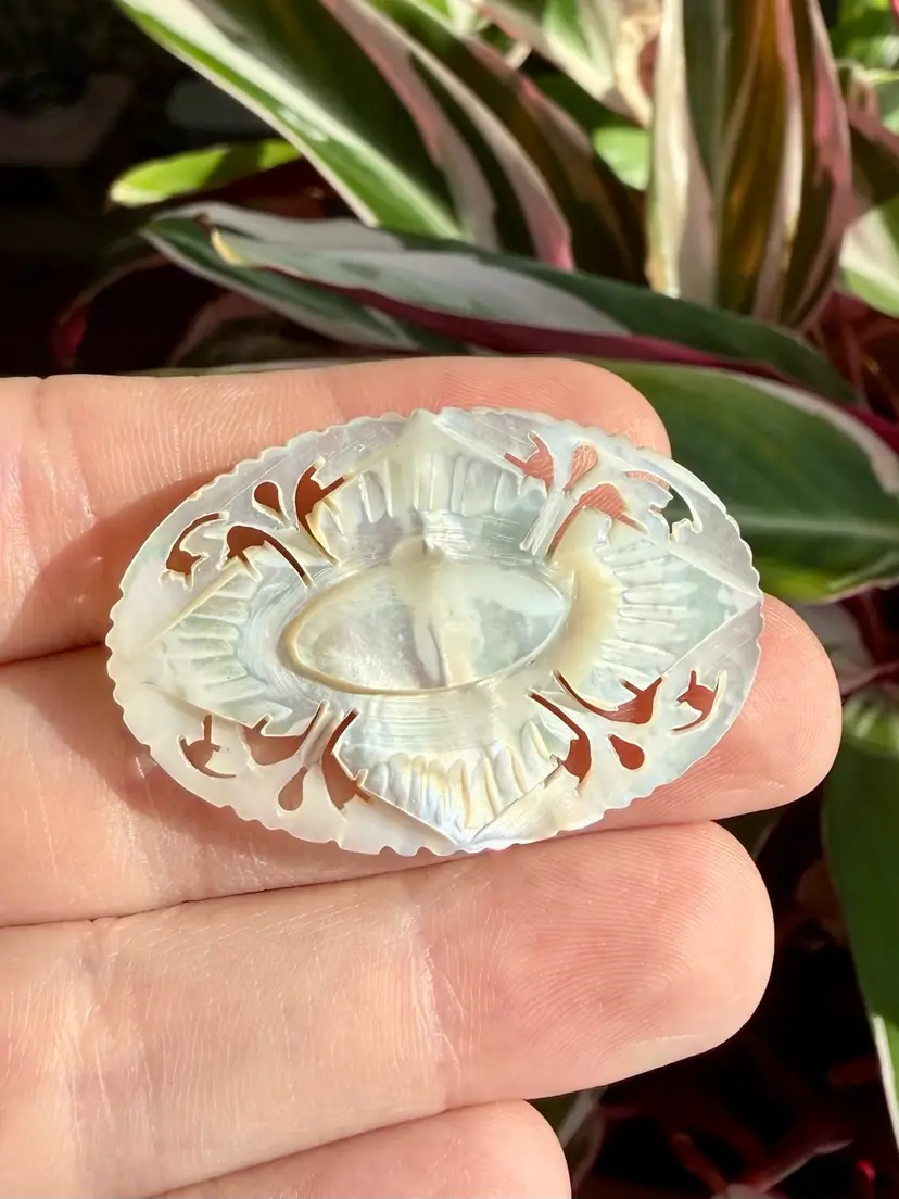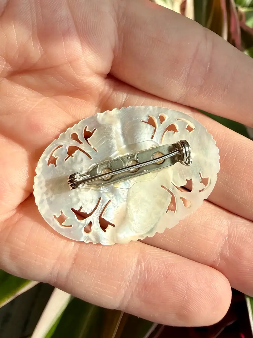 BROOCH: 1 5/8"x1 1/8", EARRINGS: 5/8"X1" A set including a brooch & dangle earrings for pierced ears. Both are made of carved Mother of Pearl abalone shell. Both are unmarked. NOTE Metal hardware on earrings could probably stand to be replaced. Current hooks seem a but tarnished/aged and don’t move on the earrings with ease.