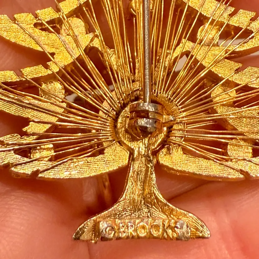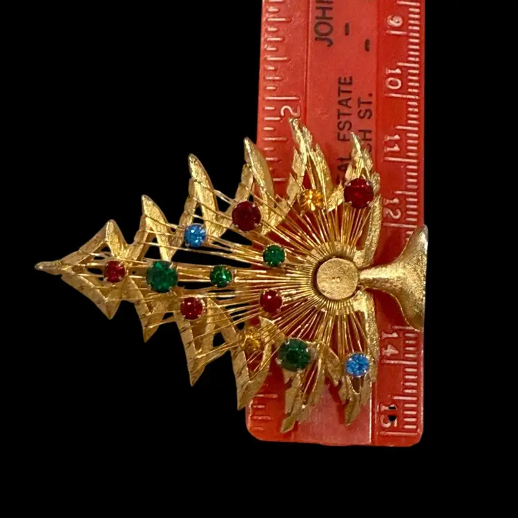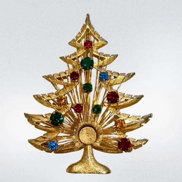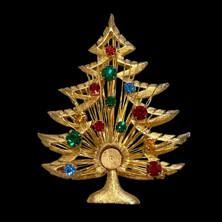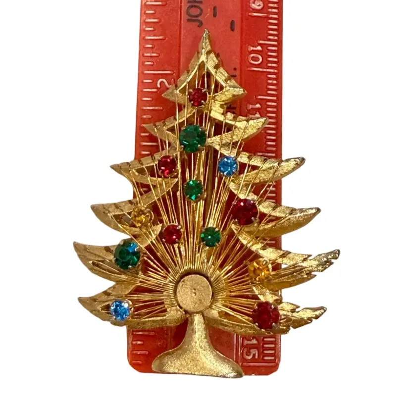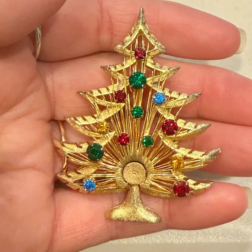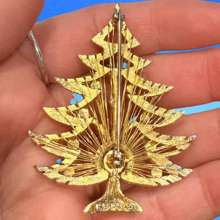 Vintage Brooks Prong Set Rhinestone GoldTone Wirework Christmas Tree Design Brooch is stunning. This lovely brooch features a unique harp design, with gold-tone wires that radiate outward from the lower trunk, creating a festive and elegant look. Bright green, red and blue rhinestones adorn the tree adding a festive sparkle that's perfect for the holidays. Measuring approximately 2.25 inches, this brooch is in very nice vintage condition and is signed "Brooks" on the reverse side.